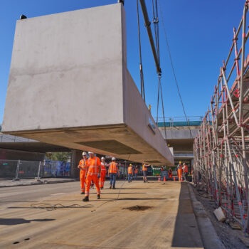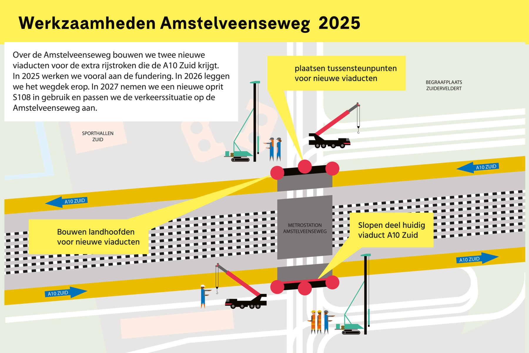 Dit was de eerste zomer van intensief werk op de Amstelveenseweg. Tijdens een zomerafsluiting in 2026 bouwen we aan de noord- en zuidzijde van het viaduct een dak dat boven op de steunpunten en landhoofden komt te rusten. Dat dak bestaat uit betonnen liggers (balken) van elk zo’n 37 meter lengte. In 2027 pakken we het kruispunt onder het viaduct aan. We scheiden dan het verkeer tussen Amstelveen en Amsterdam van het verkeer naar A10 Zuid. En we sluiten de nieuwe oprit S108 aan, die dan voor het kantoor Tripolis-Park langs loopt, richting A4 Schiphol/Den Haag. De nieuwe inrichting van het kruispunt is in 2028 gereed.