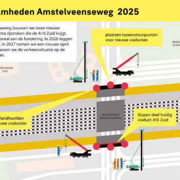Het asfalt is vers, de belijning is nieuw – de Amstelveenseweg ziet er weer netjes uit. Dat was de afgelopen ruim vijf weken wel anders. Op vrijdagavond 11 juli sloten we de weg onder het viaduct van de A10 Zuid. Dit om aan beide kanten van het viaduct steunpunten te kunnen bouwen voor de twee extra viaducten die over de Amstelveenseweg komen. Die zijn nodig vanwege de verbreding van de A10 Zuid. In beide rijrichtingen krijgt de snelweg twee extra rijstroken voor bestemmingsverkeer. Die rijstroken komen te liggen op de twee nieuwe viaducten.