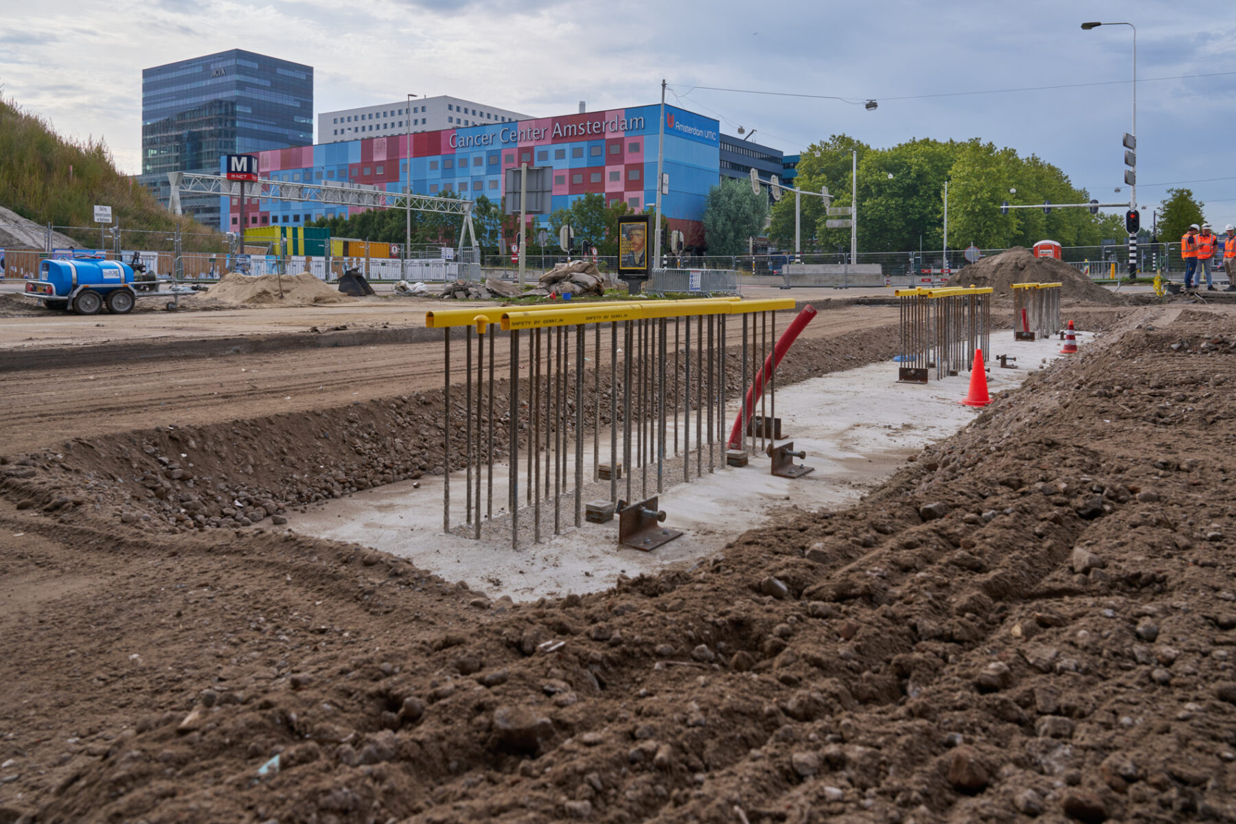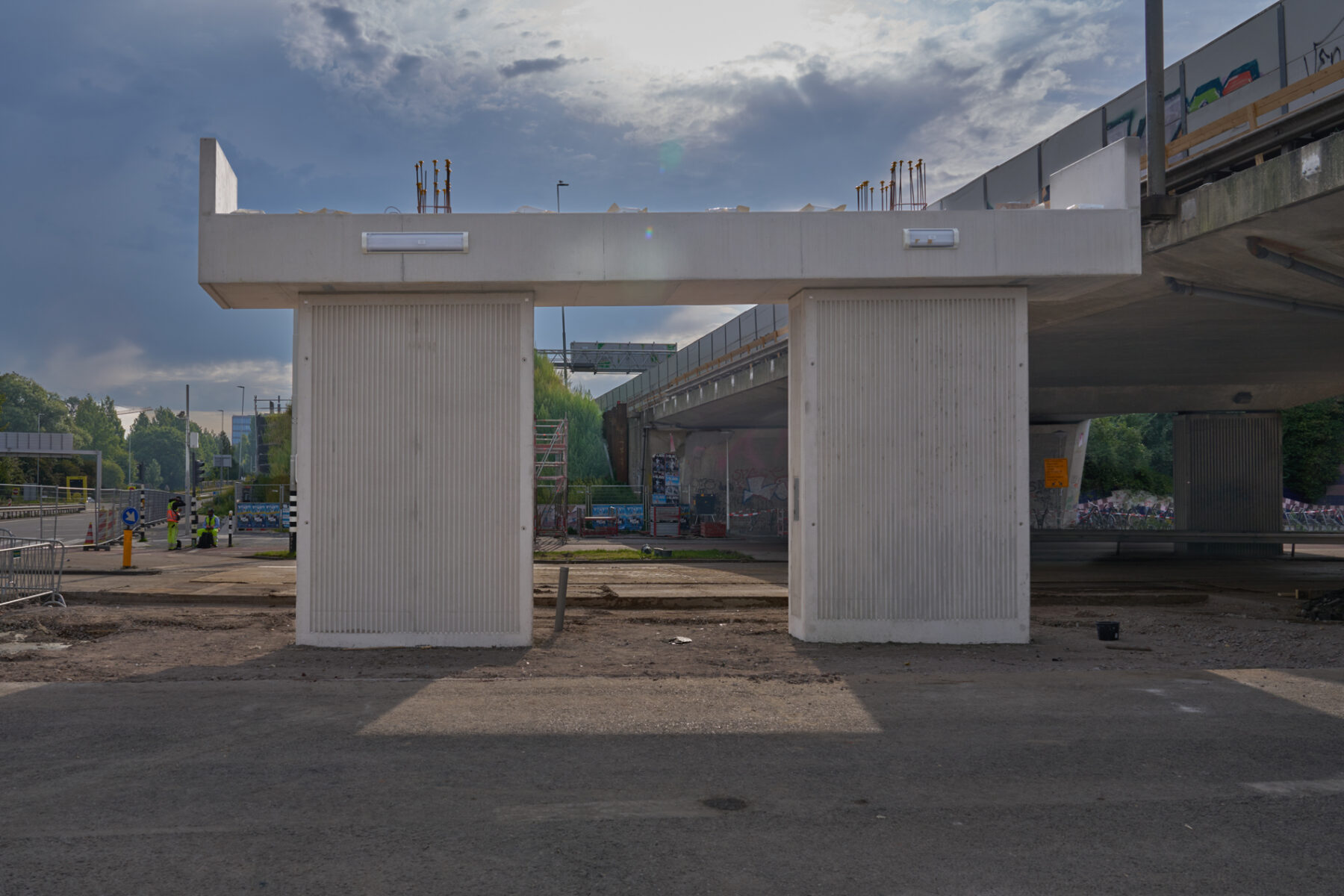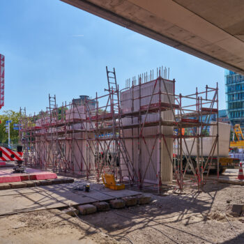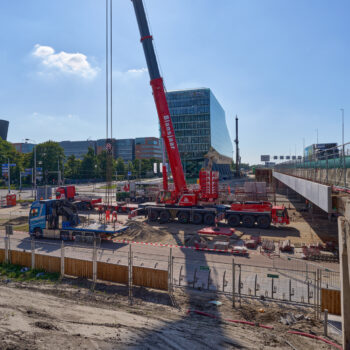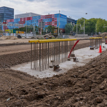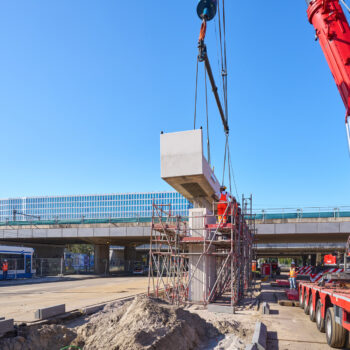 De bouw van de steunpunten – twee aan de noordkant en drie aan de zuidkant – verliep zonder problemen. Het werk van bouwcombinatie TriAX (Besix, Dura Vermeer en Heijmans) bestond uit het slopen van een deel van het bestaande viaduct aan de zuidkant, het aanbrengen van funderingspalen op de middenberm van de Amstelveenseweg, het plaatsen van twee enorme ondergrondse poeren (betonnen funderingsconstructies), het plaatsen van geprefabriceerde steunpunten en tot slot het verbinden van deze steunpunten met twee reusachtige balken – zogeheten onderslagbalken. Ook maakten we aan weerszijden van de Amstelveenseweg een begin met de bouw van de enorme landhoofden waarop de uiteinden van de twee viaducten komen te rusten. Begin augustus vertelden we u al over de stand van zaken.