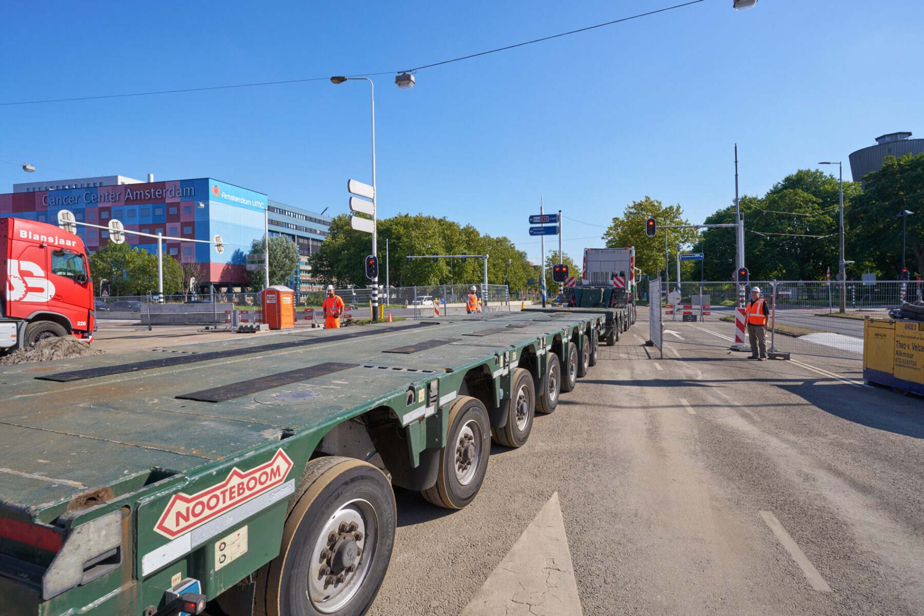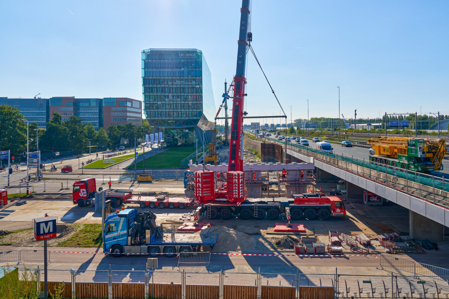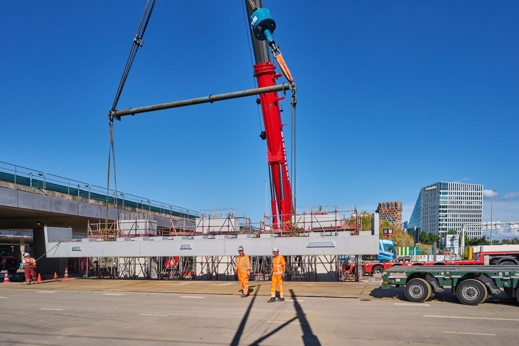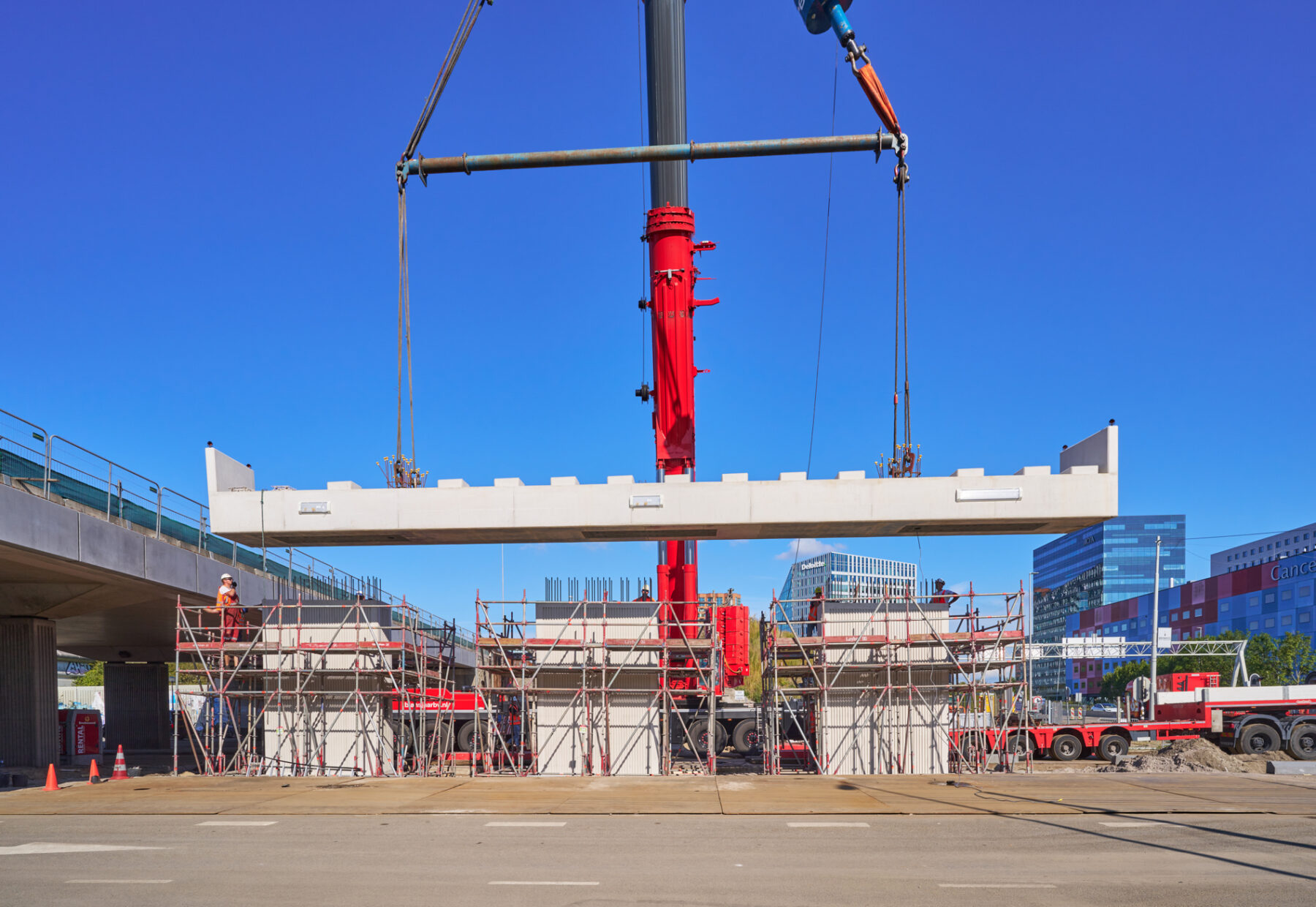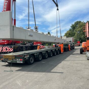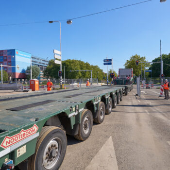 Het venijn van het werk zat in de staart. Voor de drie steunpunten aan de zuidkant moest een enorme onderslagbalk worden getransporteerd van het werkterrein van TriAX naar de Amstelveenseweg. De giek van de kraan die het gevaarte op een trailer moest hijsen, begaf het. In allerijl moest er een tweede kraan aan te pas komen, om dit klusje met enige vertraging alsnog te klaren. Op de Amstelveenseweg liep alles prima. De onderslagbalk werd van de trailer gelicht en met grote precisie op de drie steunpunten aangebracht. Kijk maar.