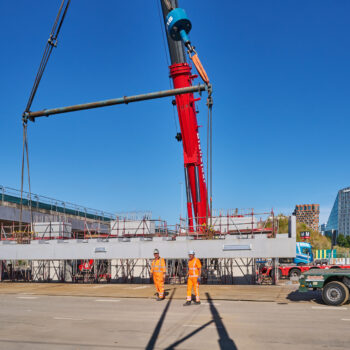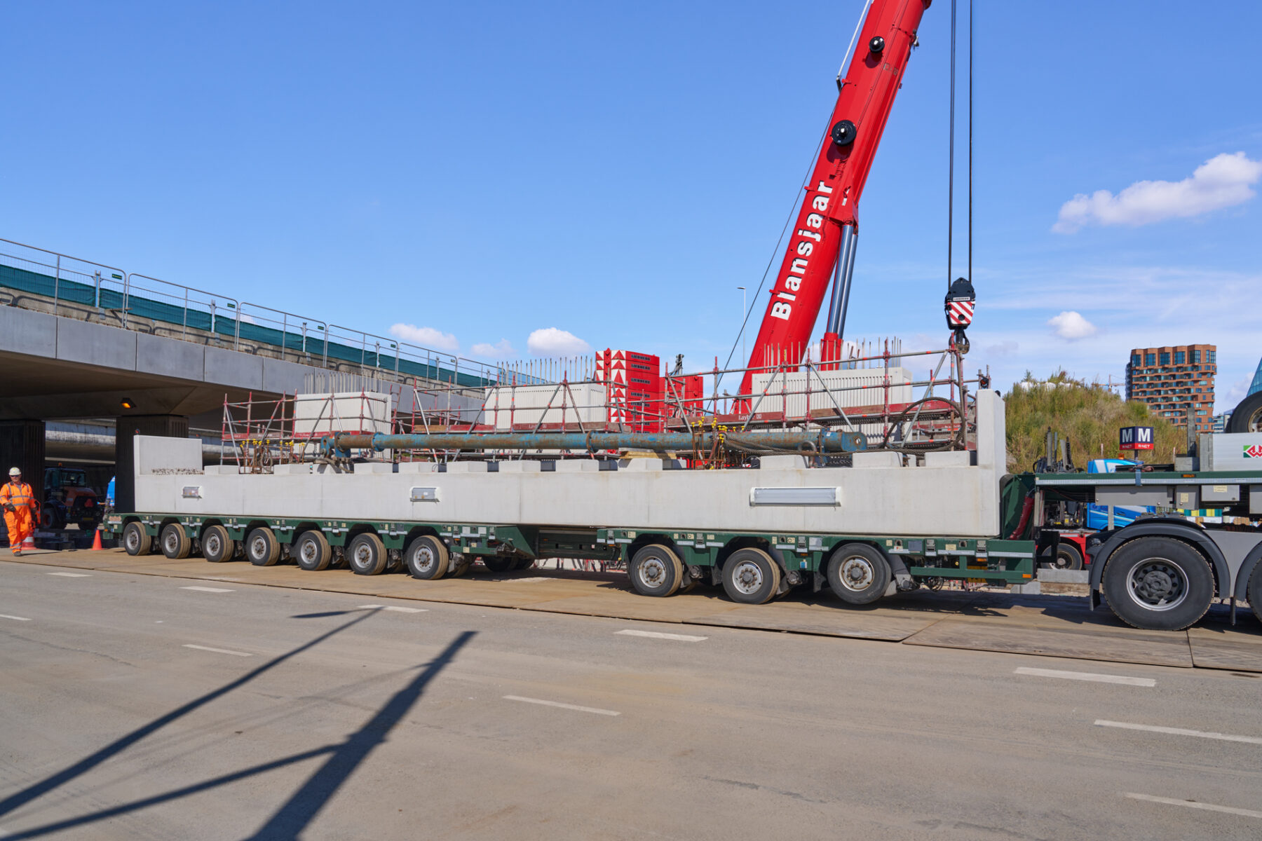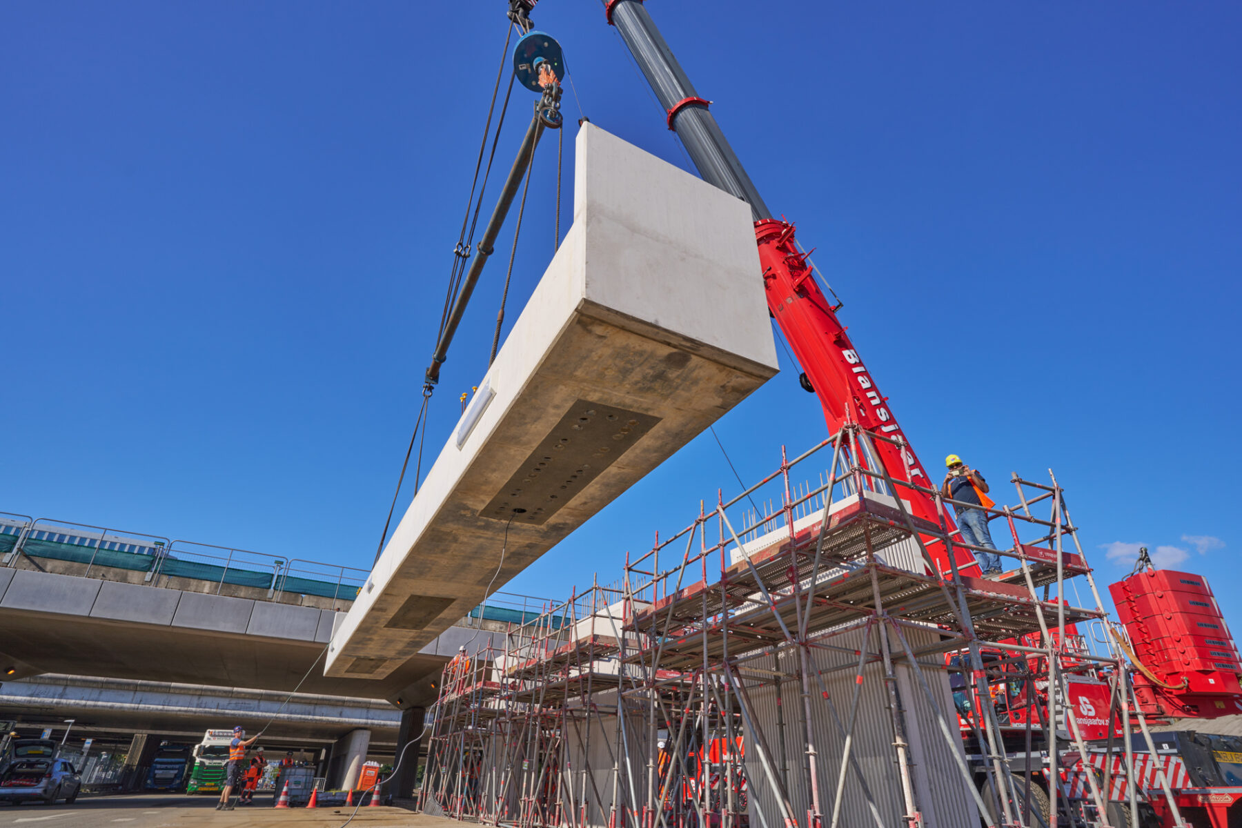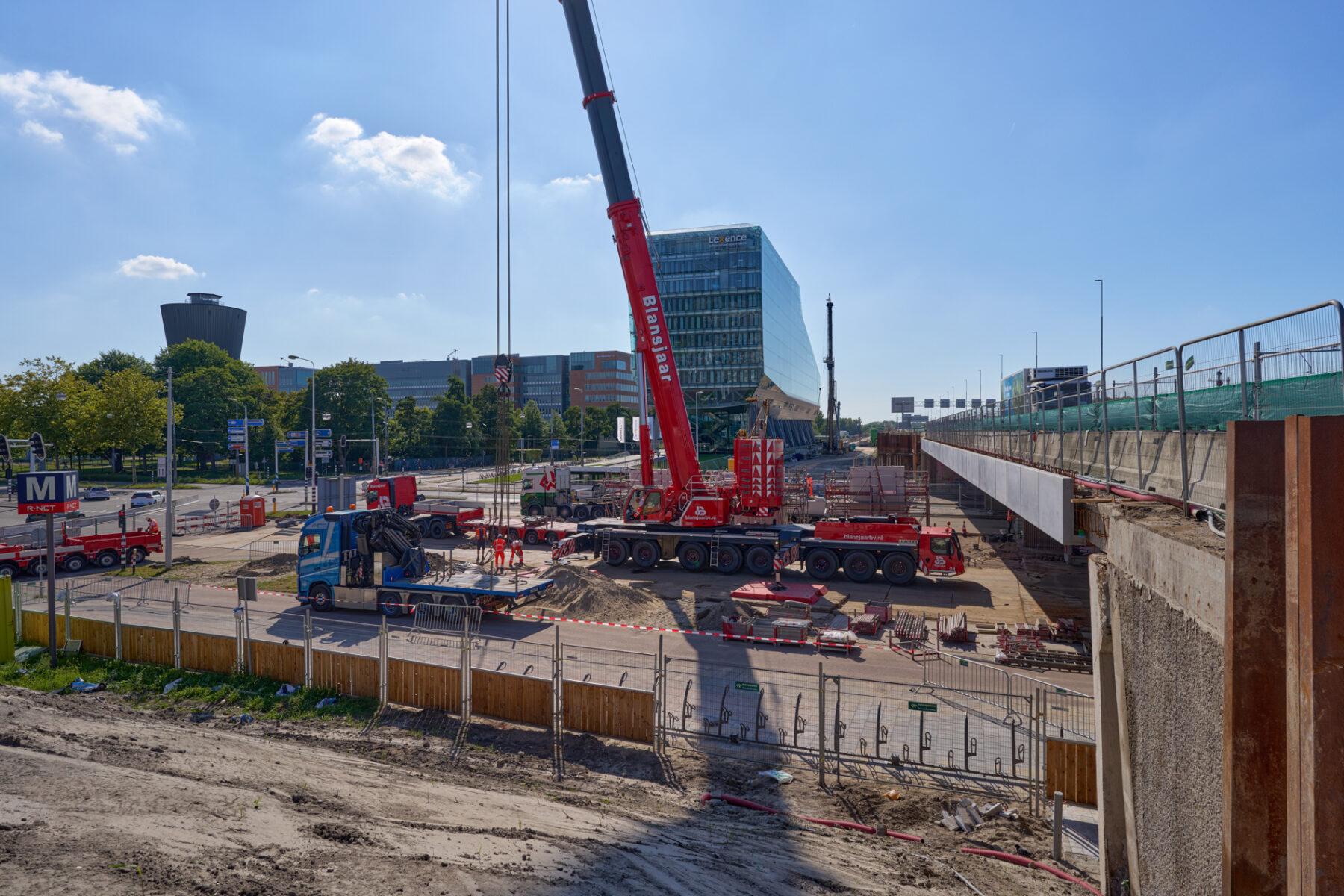 Het venijn van het werk zat in de staart. Voor de drie steunpunten aan de zuidkant moest een enorme onderslagbalk worden getransporteerd van het werkterrein van TriAX naar de Amstelveenseweg. De giek van de kraan die het gevaarte op een trailer moest hijsen, begaf het. In allerijl moest er een tweede kraan aan te pas komen, om dit klusje met enige vertraging alsnog te klaren. Op de Amstelveenseweg liep alles prima. De onderslagbalk werd van de trailer gelicht en met grote precisie op de drie steunpunten aangebracht. Kijk maar.