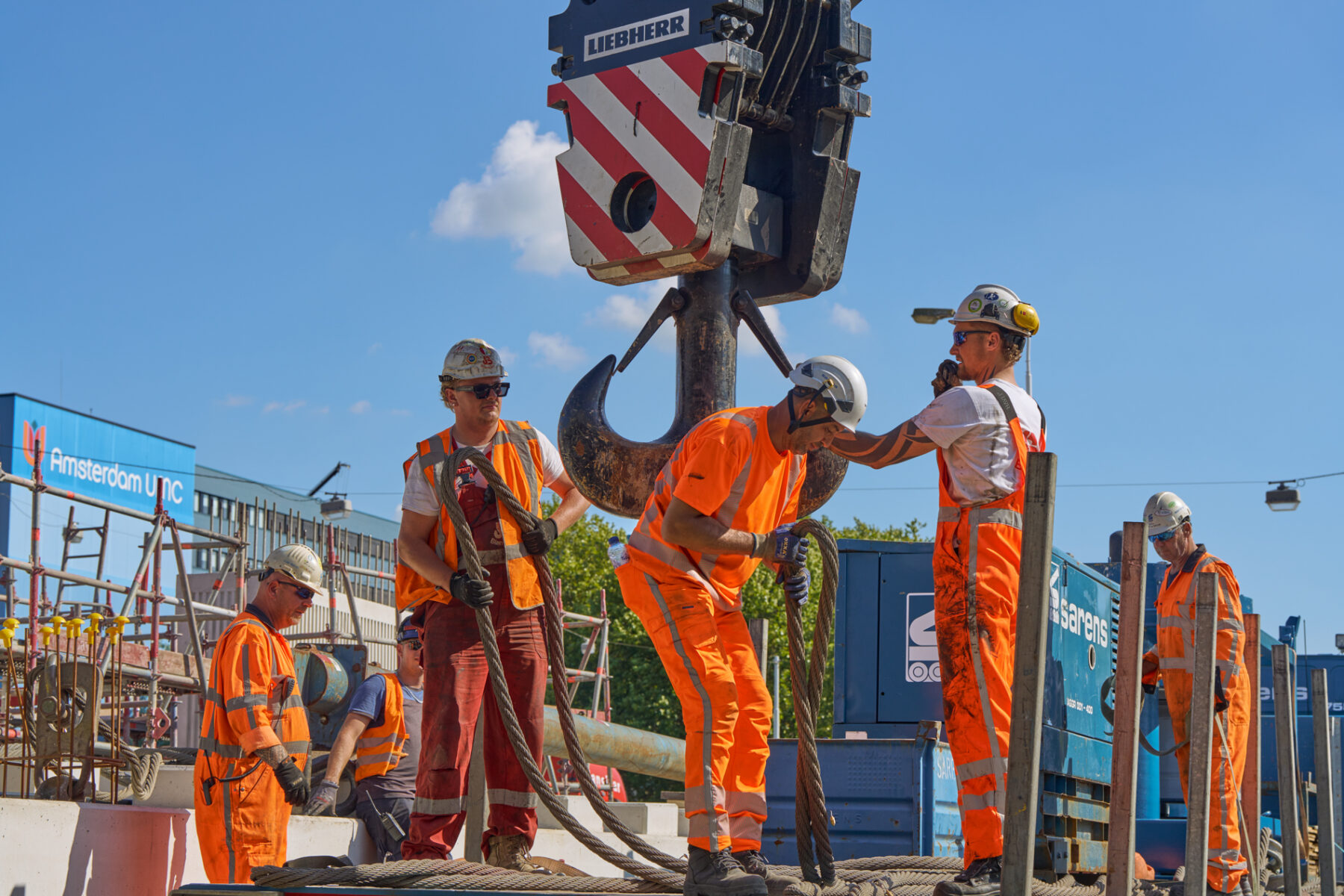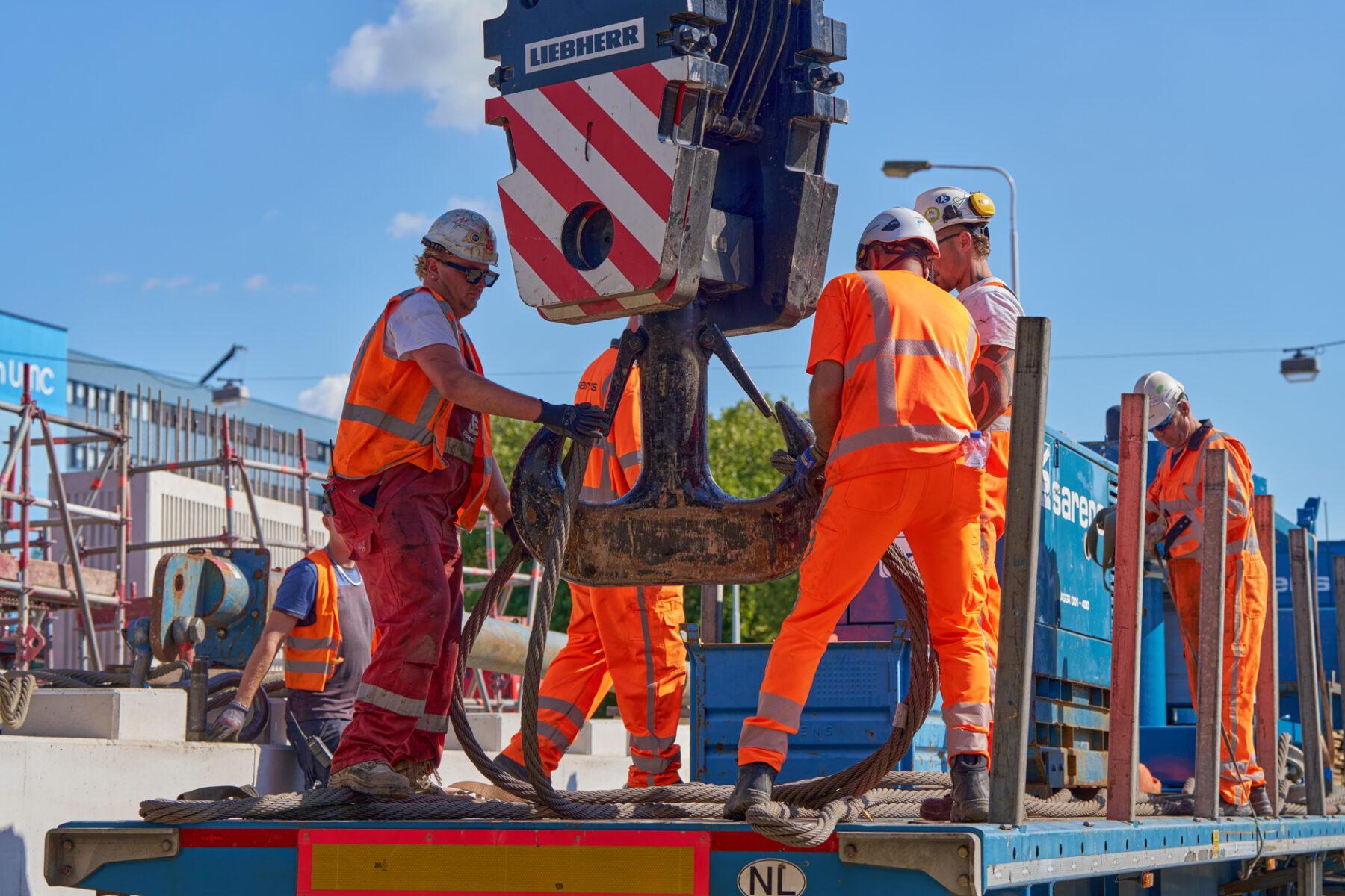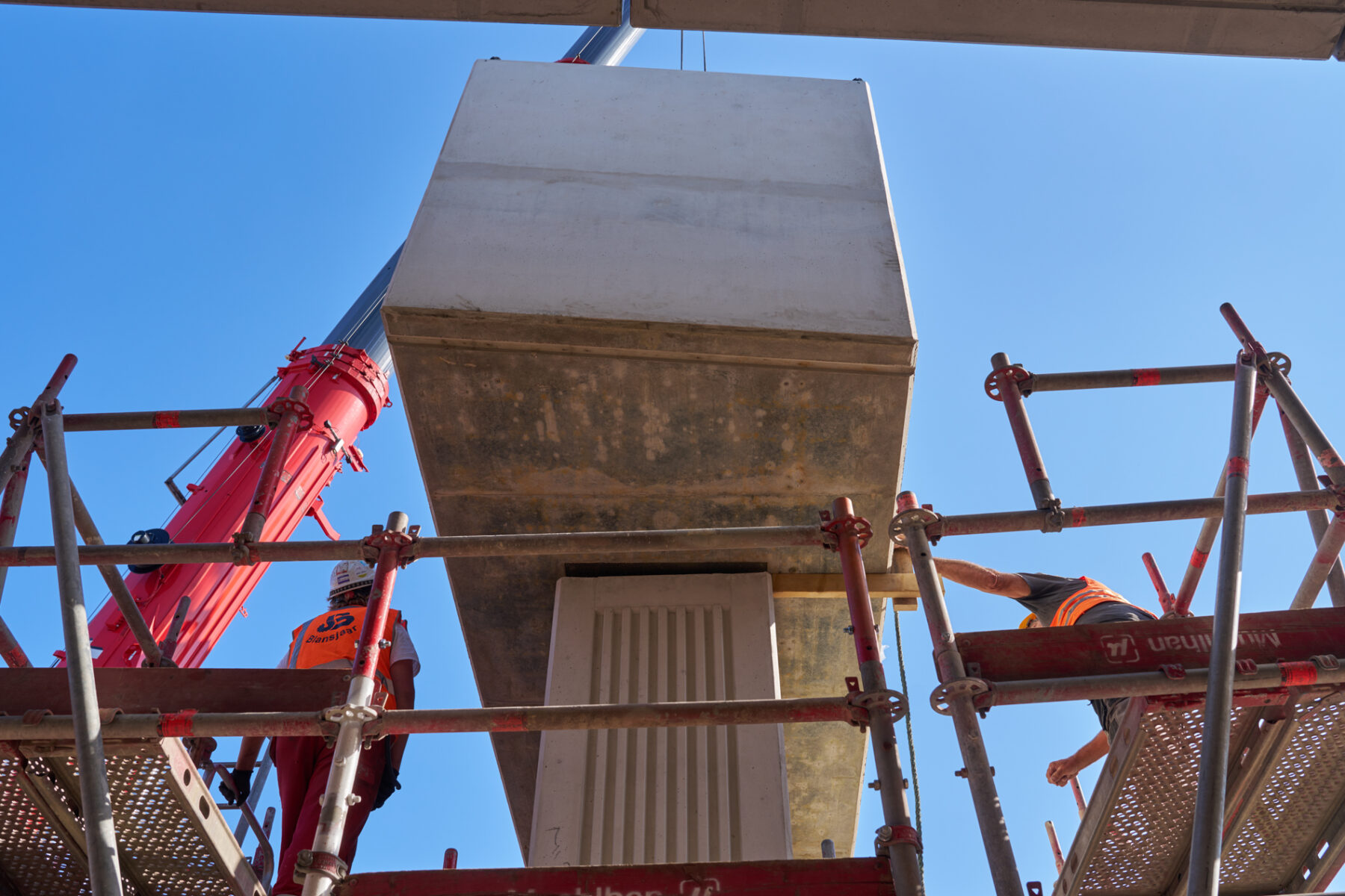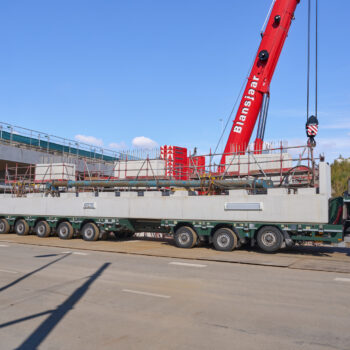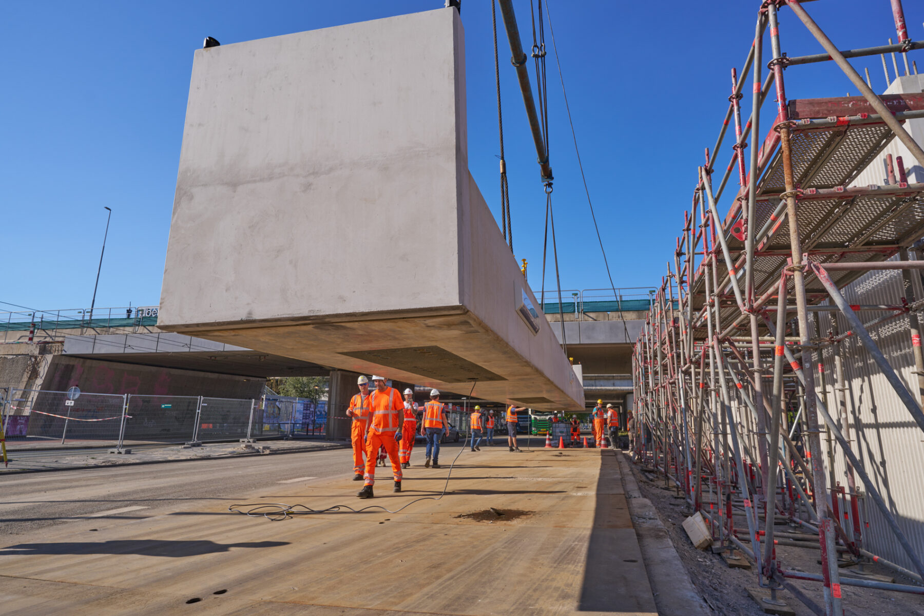 Het venijn van het werk zat in de staart. Voor de drie steunpunten aan de zuidkant moest een enorme onderslagbalk worden getransporteerd van het werkterrein van TriAX naar de Amstelveenseweg. De giek van de kraan die het gevaarte op een trailer moest hijsen, begaf het. In allerijl moest er een tweede kraan aan te pas komen, om dit klusje met enige vertraging alsnog te klaren. Op de Amstelveenseweg liep alles prima. De onderslagbalk werd van de trailer gelicht en met grote precisie op de drie steunpunten aangebracht. Kijk maar.