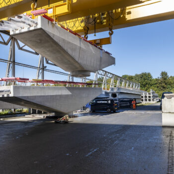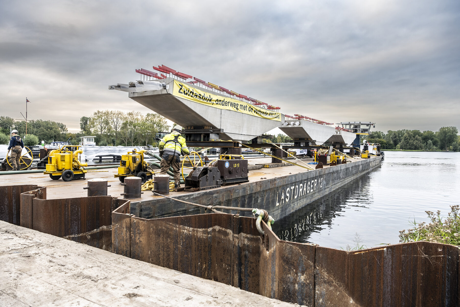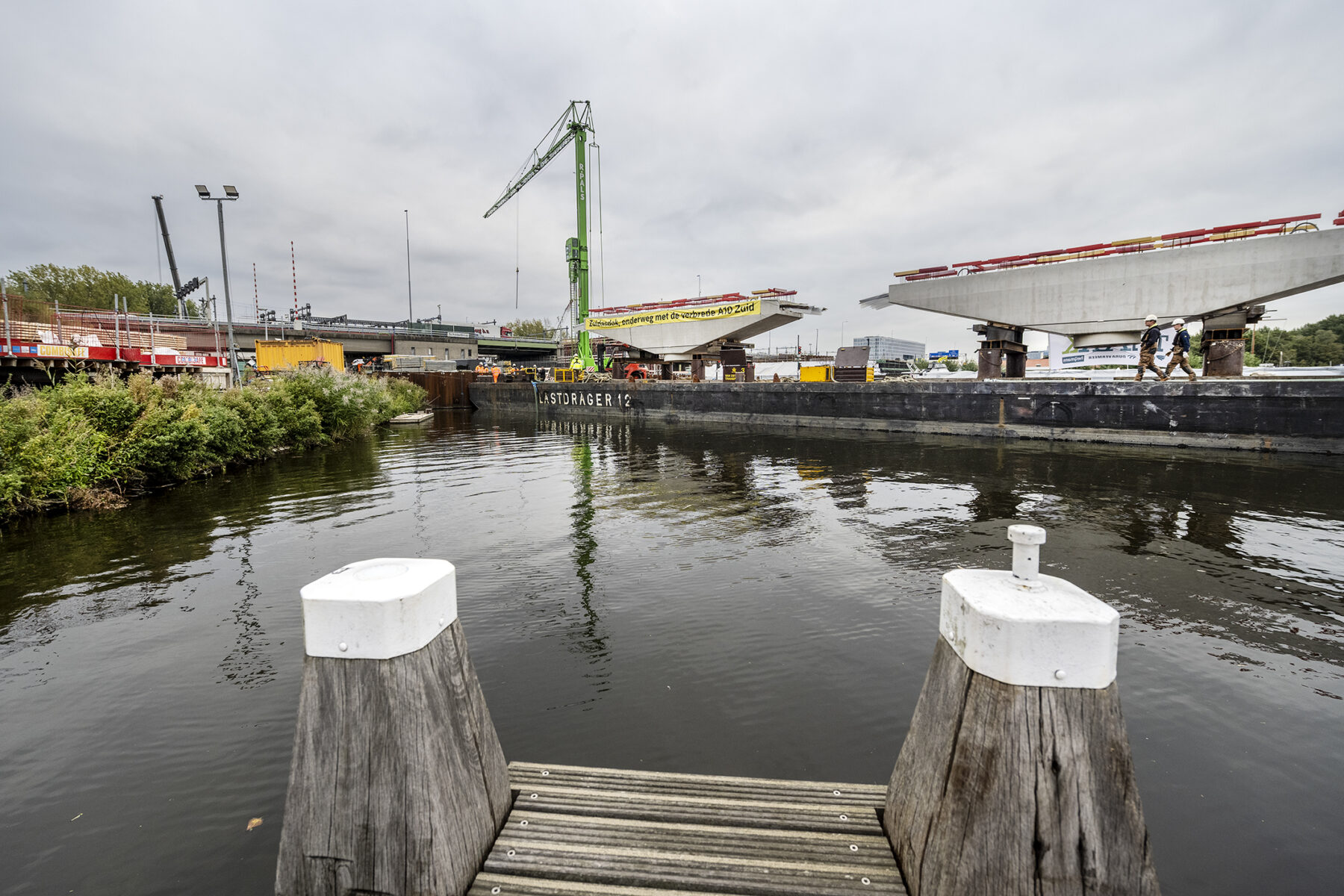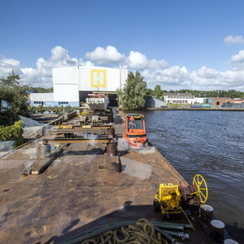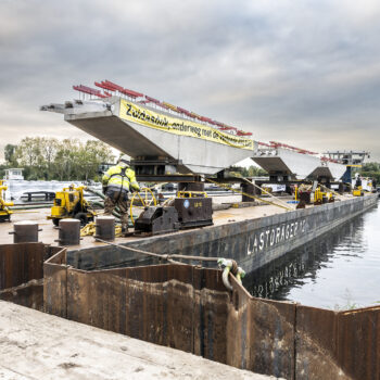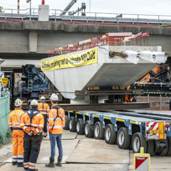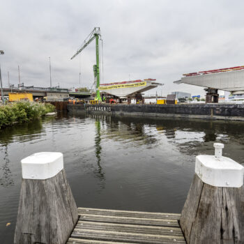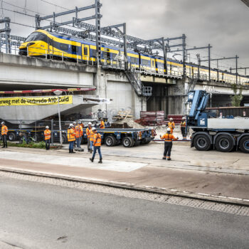 Zoals gepland kwamen de onderslagbalken op donderdagmiddag 25 september 2025 al aan bij de Nieuwe Meer. De volgende ochtend om 9:00 uur stond bouwcombinatie TriAX (Besix, Dura Vermeer en Heijmans) klaar om de balken stuk voor stuk de wal op te rijden (ze pasten zoals berekend net onder de Schinkelbrug door), waarna ze naar ons bouwterrein aan de Riekerweg zijn vervoerd. De schipper van de boot leek overigens (als enige) niet onder de indruk van de afmetingen van de balken. ‘Ik vervoer altijd wat anders, maar wel op dezelfde boot. En of er nu water, zand of kiezelstenen in een emmer zitten: het blijft een emmer’, zei hij na aankomst bij de Nieuwe Meer.