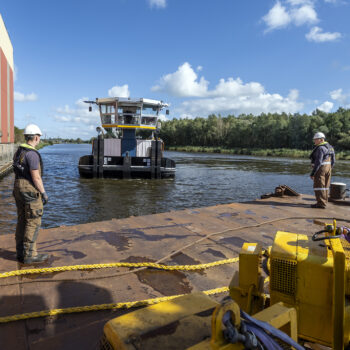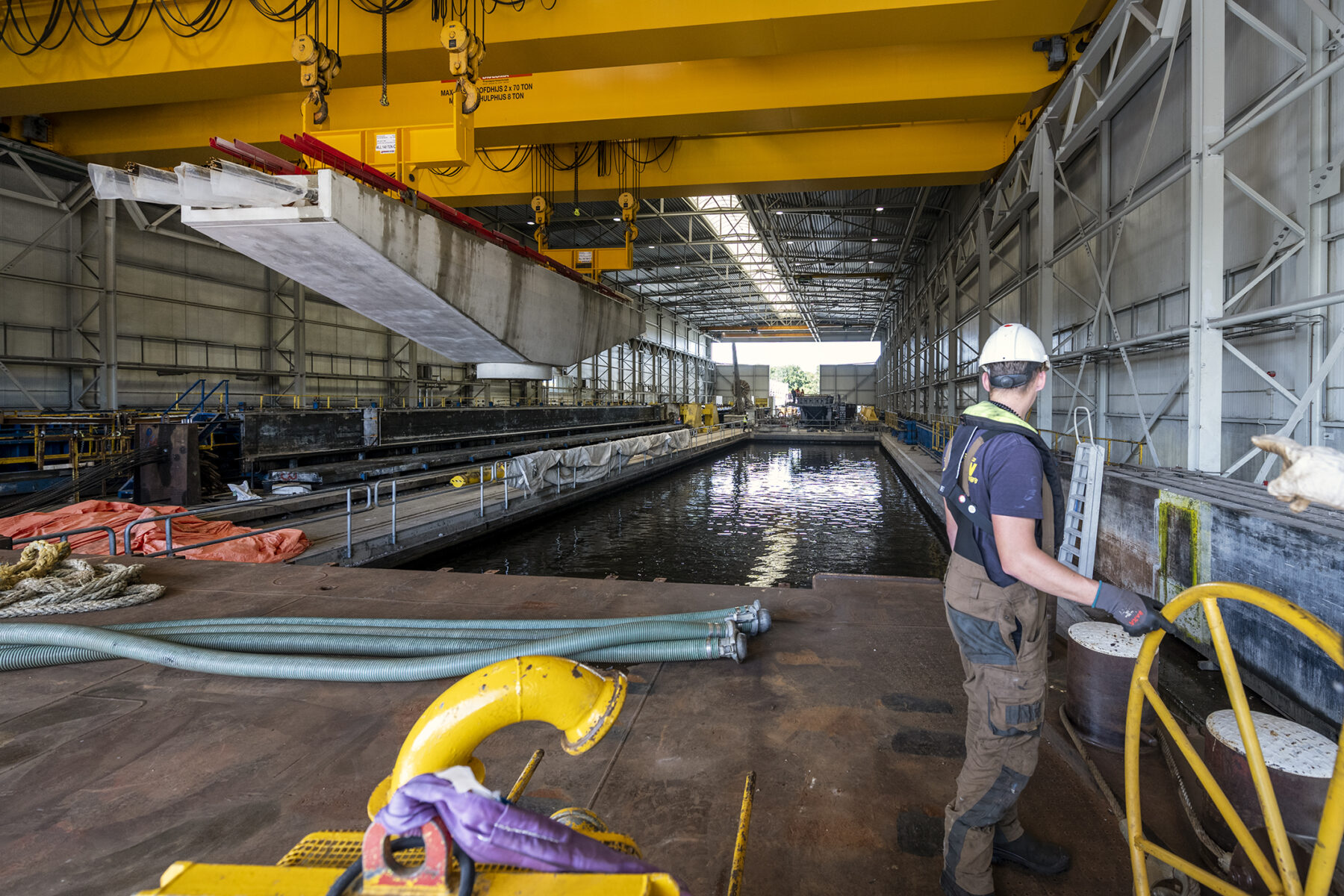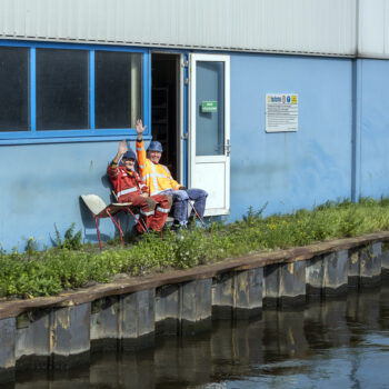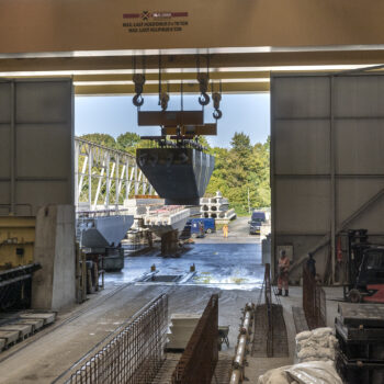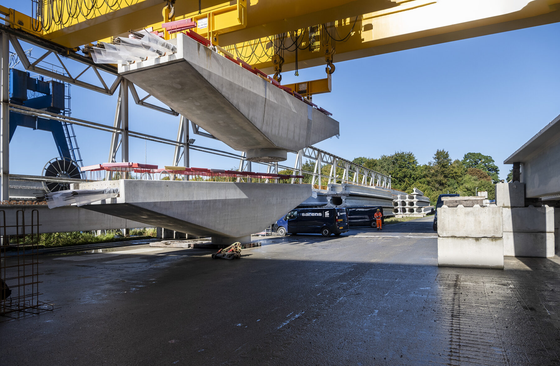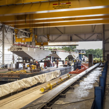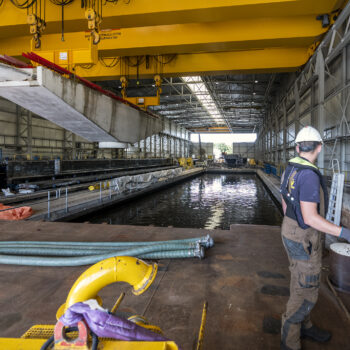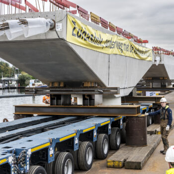 Zoals gepland kwamen de onderslagbalken op donderdagmiddag 25 september 2025 al aan bij de Nieuwe Meer. De volgende ochtend om 9:00 uur stond bouwcombinatie TriAX (Besix, Dura Vermeer en Heijmans) klaar om de balken stuk voor stuk de wal op te rijden (ze pasten zoals berekend net onder de Schinkelbrug door), waarna ze naar ons bouwterrein aan de Riekerweg zijn vervoerd. De schipper van de boot leek overigens (als enige) niet onder de indruk van de afmetingen van de balken. ‘Ik vervoer altijd wat anders, maar wel op dezelfde boot. En of er nu water, zand of kiezelstenen in een emmer zitten: het blijft een emmer’, zei hij na aankomst bij de Nieuwe Meer.