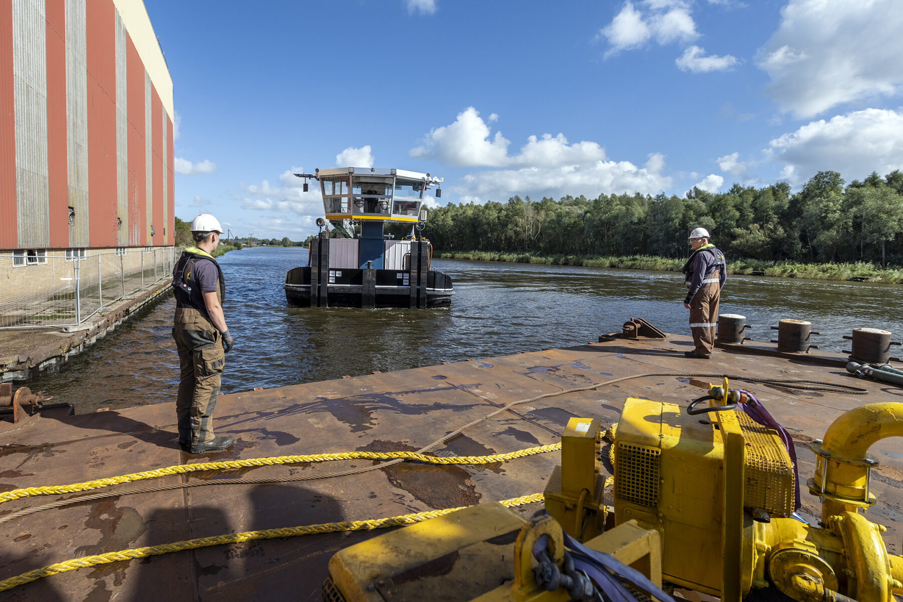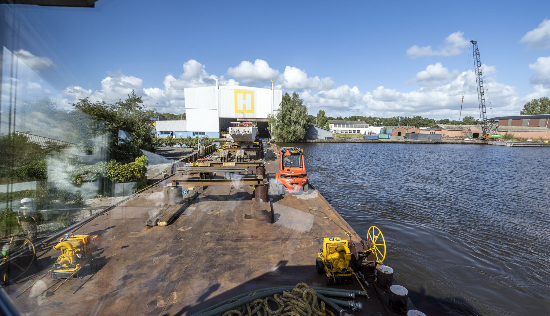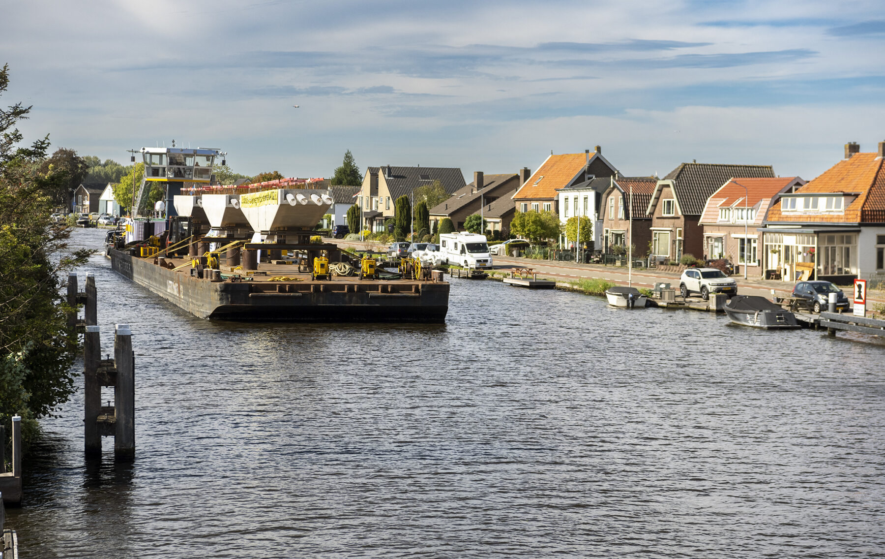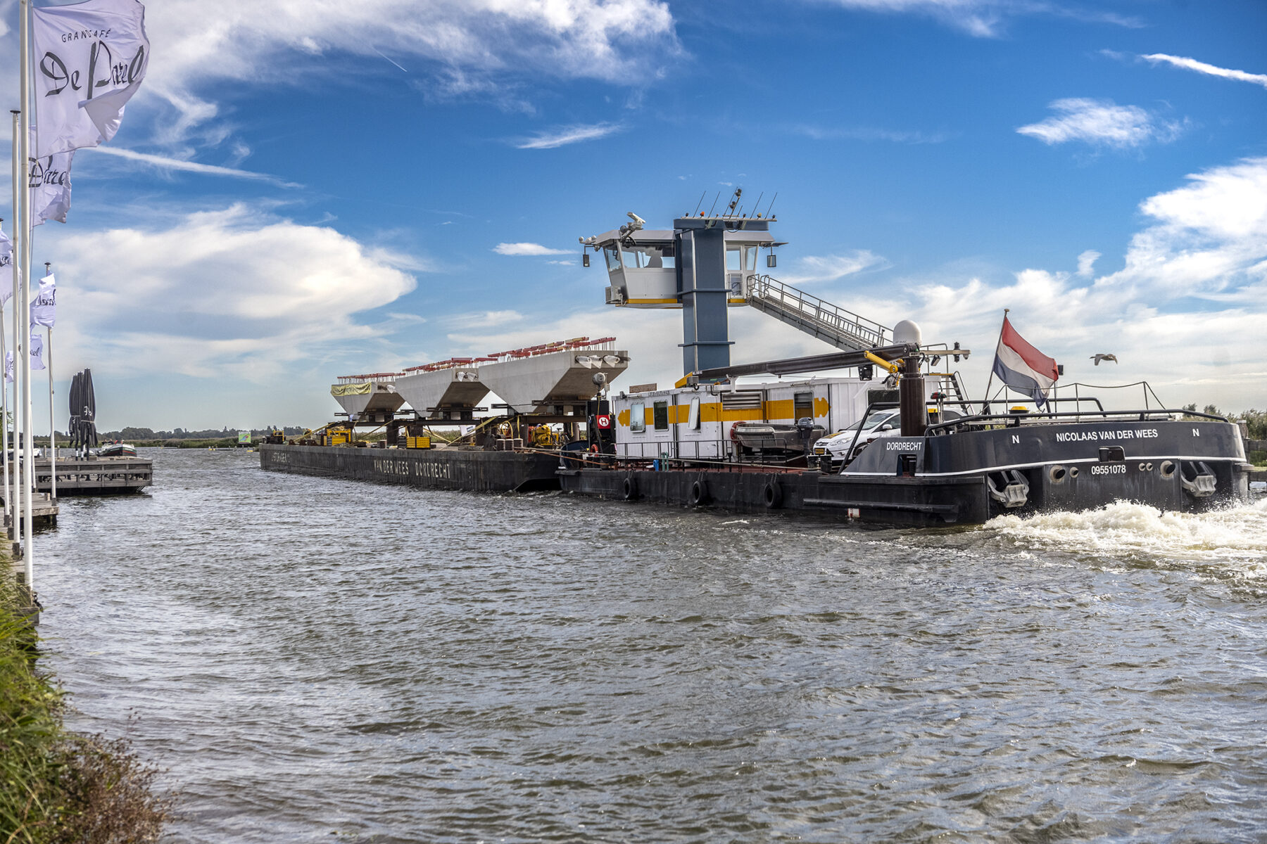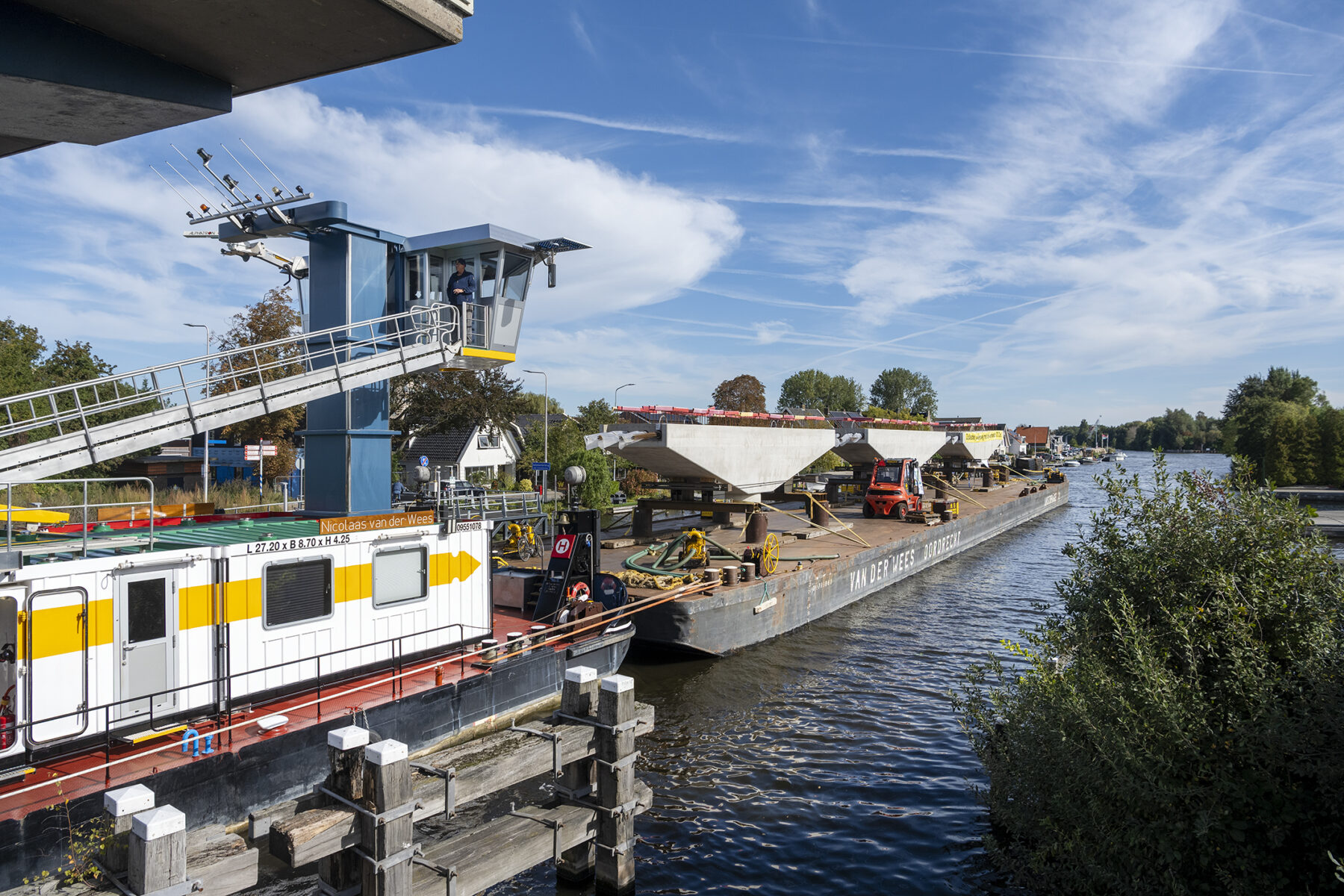 In Friesland monteerden we een webcam op de boot waardoor de gehele reis – vanaf de fabriek van Haitsma Beton tot aan ons bouwterrein aan de Schinkel – live te volgen was op onze website. Het schitterende herfstweer zorgde voor heel wat mooie (Hollandse) tafereeltjes onderweg. De vaartocht verliep uiterst soepel, al lag het schip vanwege een stremming iets langer in Friese wateren. Die stremming was het gevolg van een aanvaring verderop, op het Prinses Margriet Kanaal.