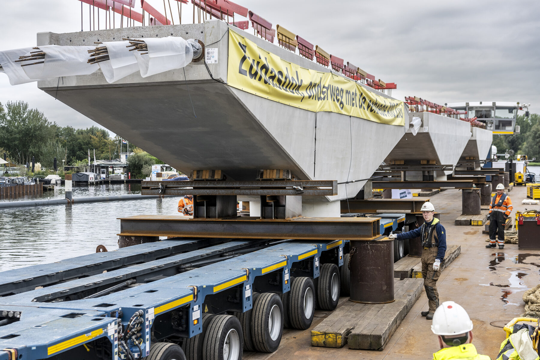 De joekels van onderslagbalken moeten straks de nieuwe fly-over dragen die de A10 Zuid met de A4 verbindt. Ze werden voorgebouwd in het Friese Kootstertille, maar de balken over de weg vervoeren was geen optie: daarvoor zijn ze te zwaar én te breed. En dus werden ze maandagmiddag 22 september 2025 vanuit de fabriek op een ponton geladen, waarna ze via het IJsselmeer langs onder andere Utrecht, Gouda en Alphen aan den Rijn naar de Nieuwe Meer voeren.