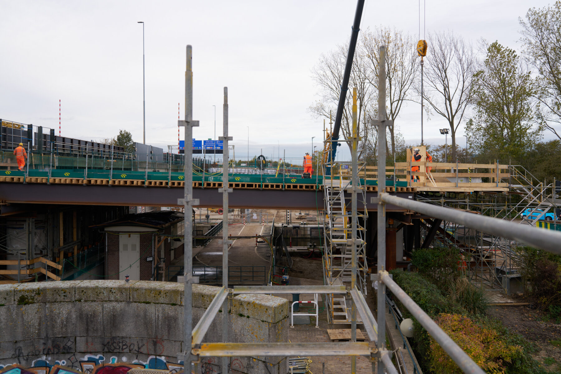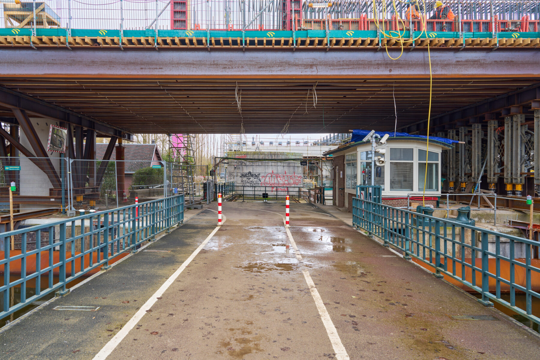 Voor een groot deel komt dat vanwege de bestaande sluis. Die bevindt zich precies op de plek waar de nieuwe brug een steunpunt nodig heeft. ‘Daar is ook een monumentaal huisje dat we niet mogen slopen, en het fietspad loopt dwars langs dat huisje. Dus bouwen we een steunconstructie over de sluis en het fietspad heen,’ legt Helle uit. ‘We hebben al een grote stalen constructie over het huisje heen gebouwd. Maar we zijn tot in het nieuwe jaar nog wel even zoet met de hele steunconstructie: zo storten we er nog een dik pakket van zo’n 2,5 meter aan beton bovenop.’