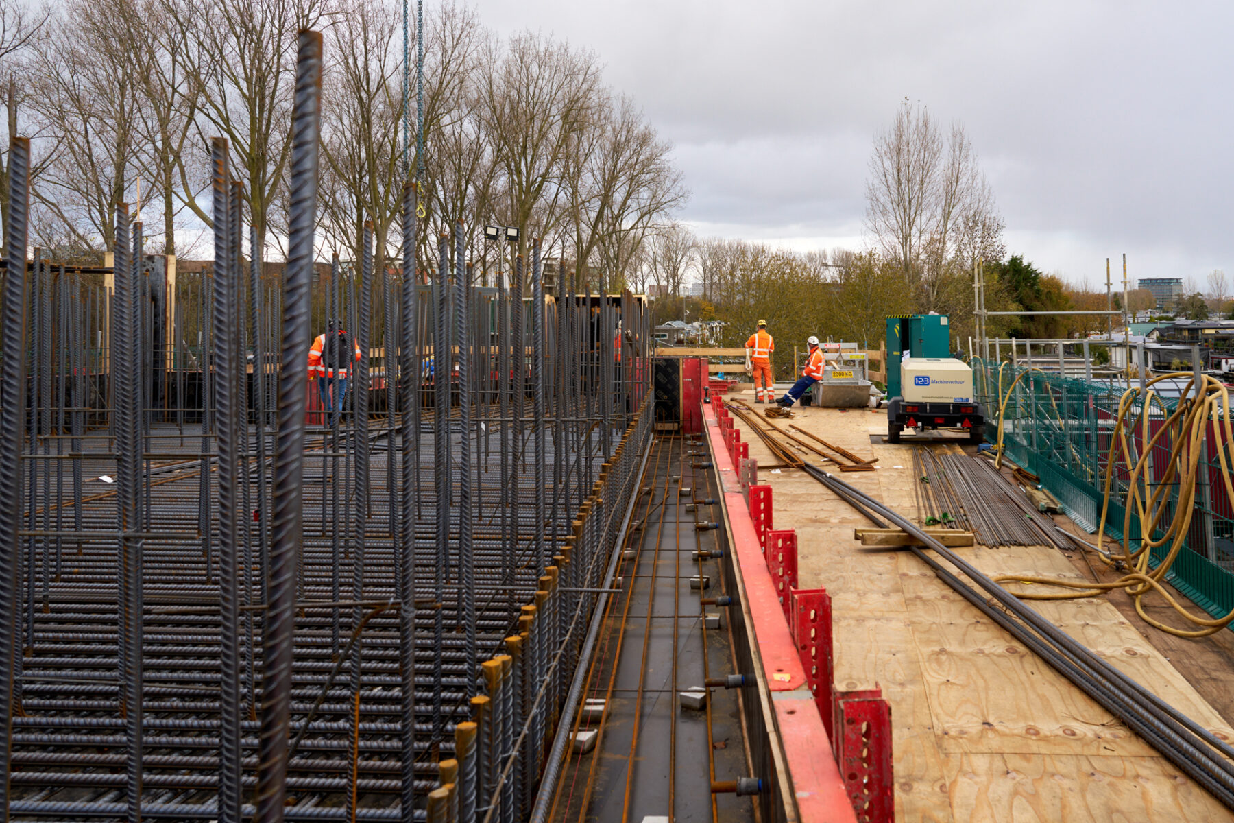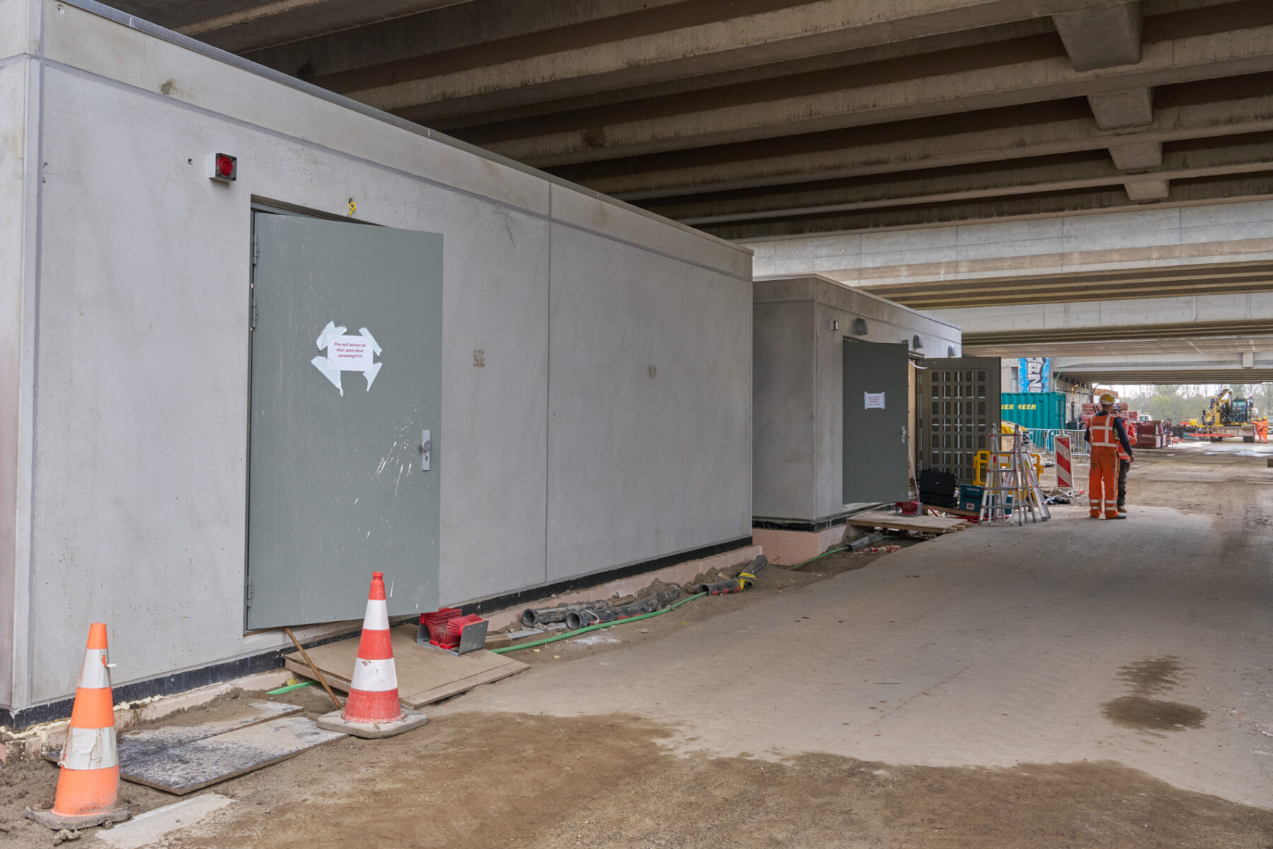 En ook onder de bestaande Schinkelbrug is wat belangrijks gaande: daar bouwen we aan twee zogenaamde dienstgebouwen. Klinkt wat saai, maar zie deze gebouwen als het technisch hart van de brug. In het ene gebouw komt de energievoorziening voor alle systemen van de Schinkelbrug. Denk daarbij bijvoorbeeld aan de slagbomen, de signaalborden en de camera’s voor de brugbedienaars. In het andere gebouw komen de besturingssystemen voor al deze onderdelen. Het doel is om de dienstgebouwen nog voor de kerst van spanning te voorzien. Begin 2026 gaan we dan voorzichtig de eerste systemen testen.