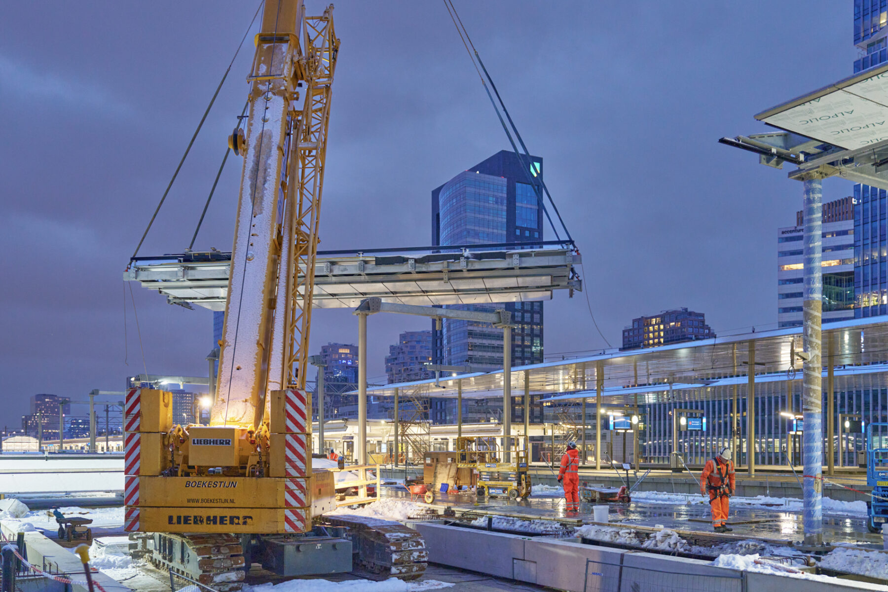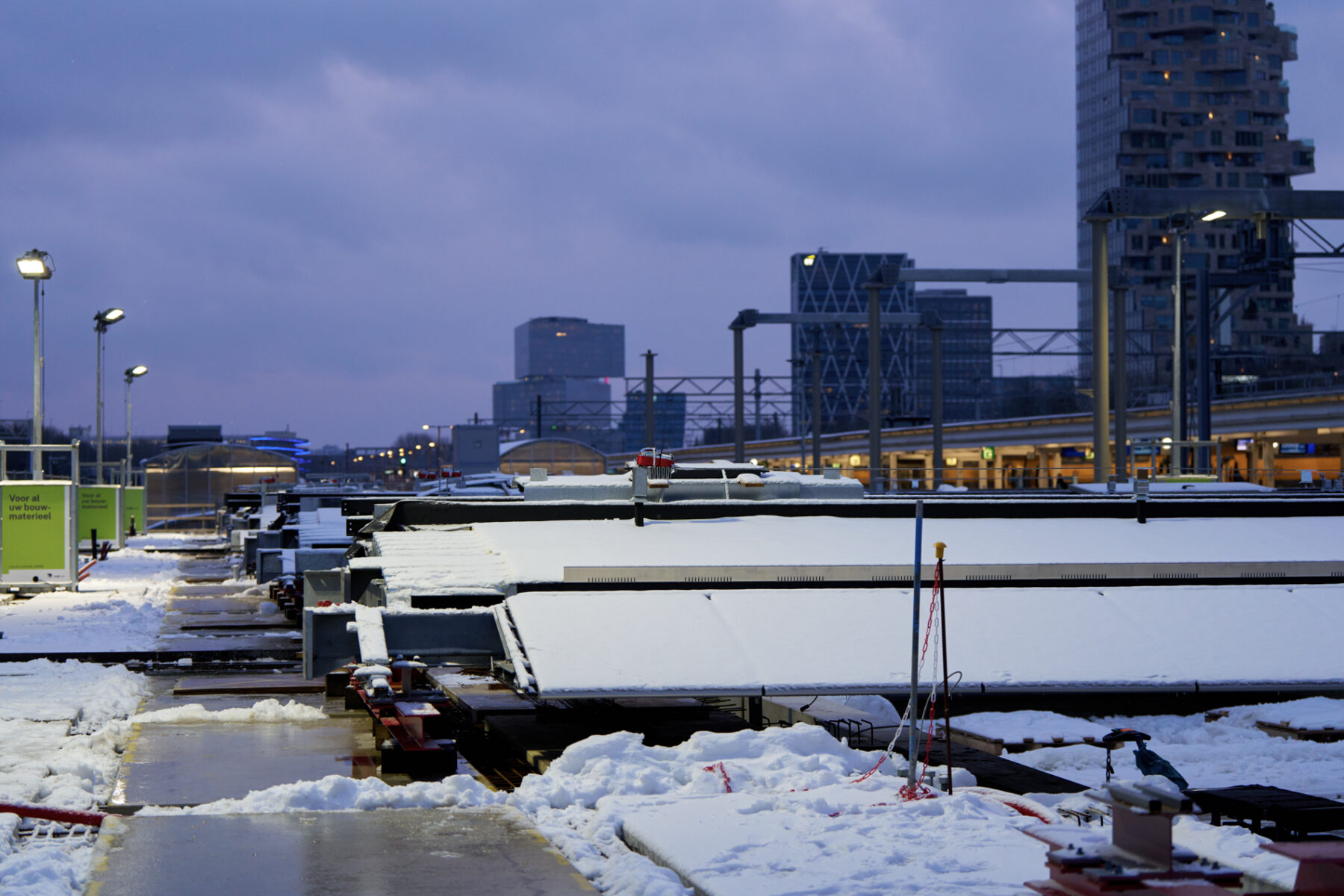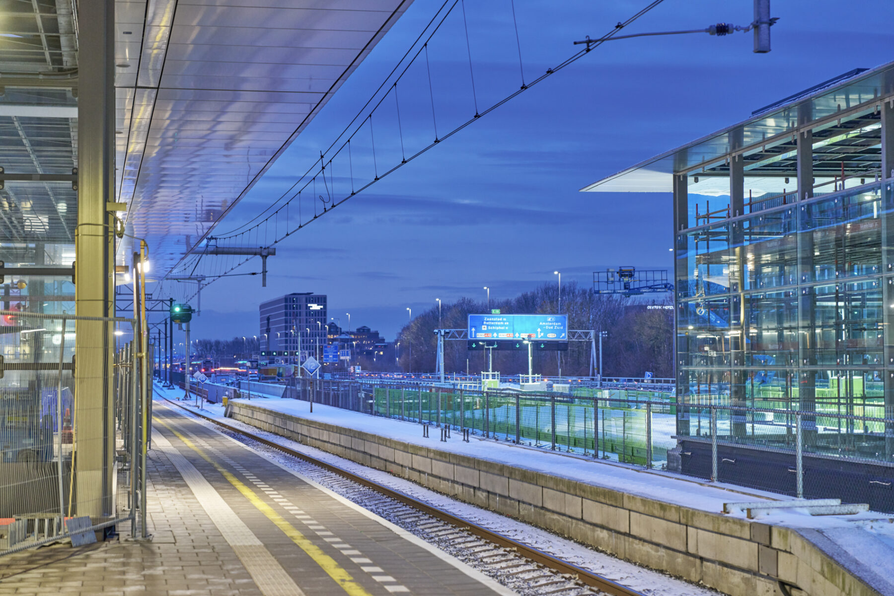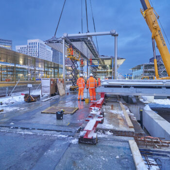 Op zondagavond 11 januari lagen de delen van metroperronkap boven de extra reizigerspassage van station Amsterdam Zuid netjes op hun plek. We voorzien de kappen op een later moment nog van afwerking zoals dakbedekking. Vanwege de sneeuw was het dit weekend immers niet veilig genoeg om bovenop de kappen te werken. In maart 2026 hijsen we ook de perronkappen van het andere nieuwe (meest noordelijke) metroperron naar hun plek. De treinperrons voorzagen we in het najaar van 2025 al gedeeltelijk van nieuwe kappen.