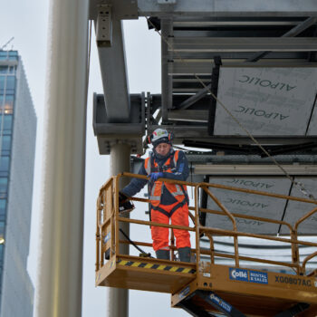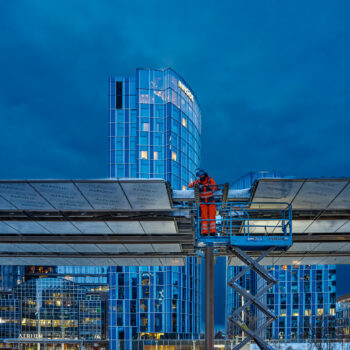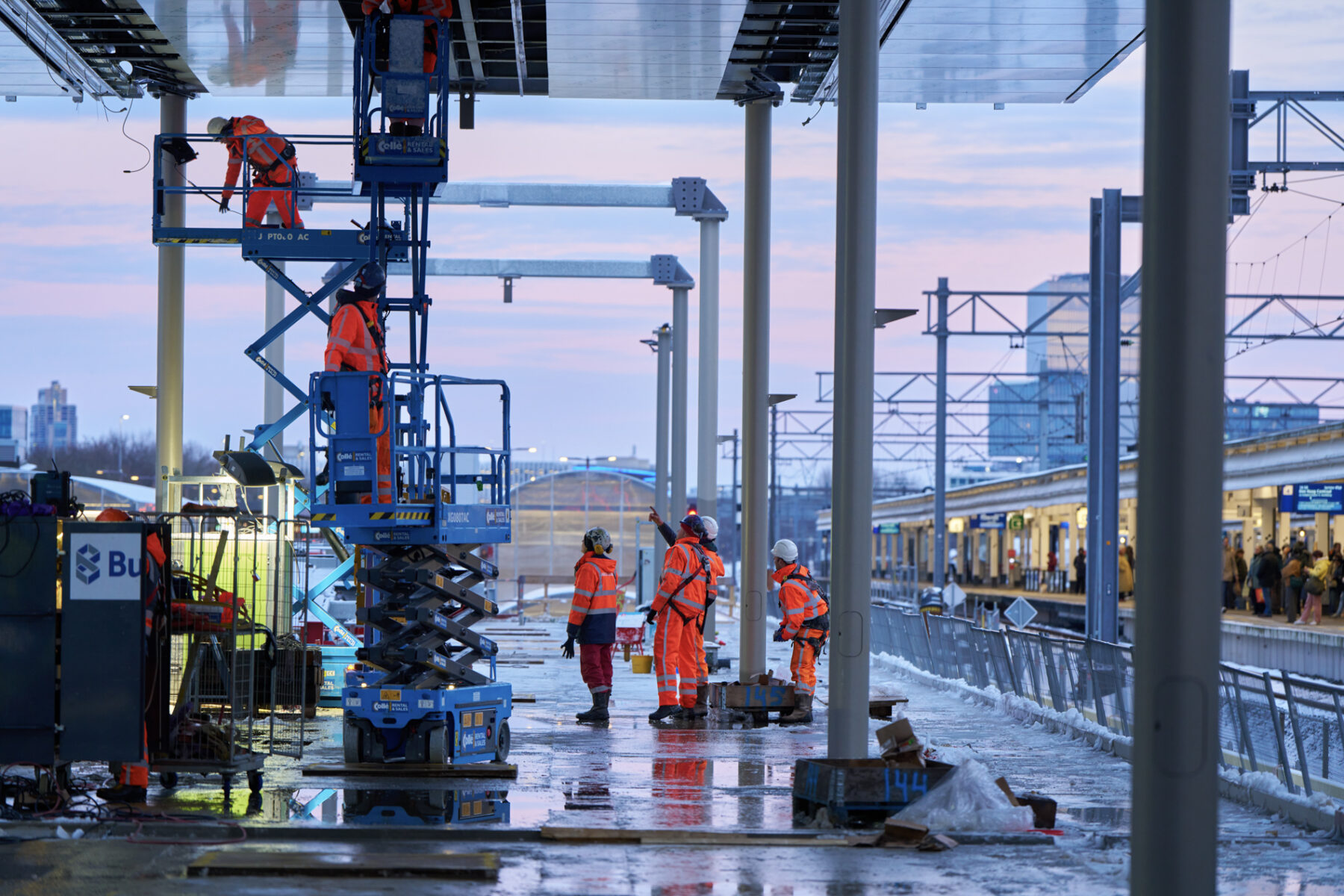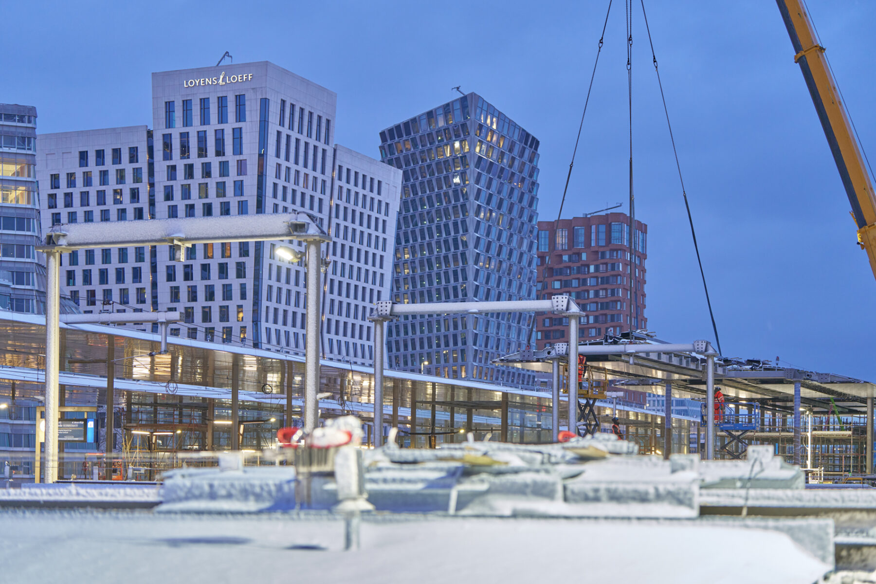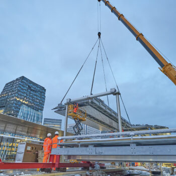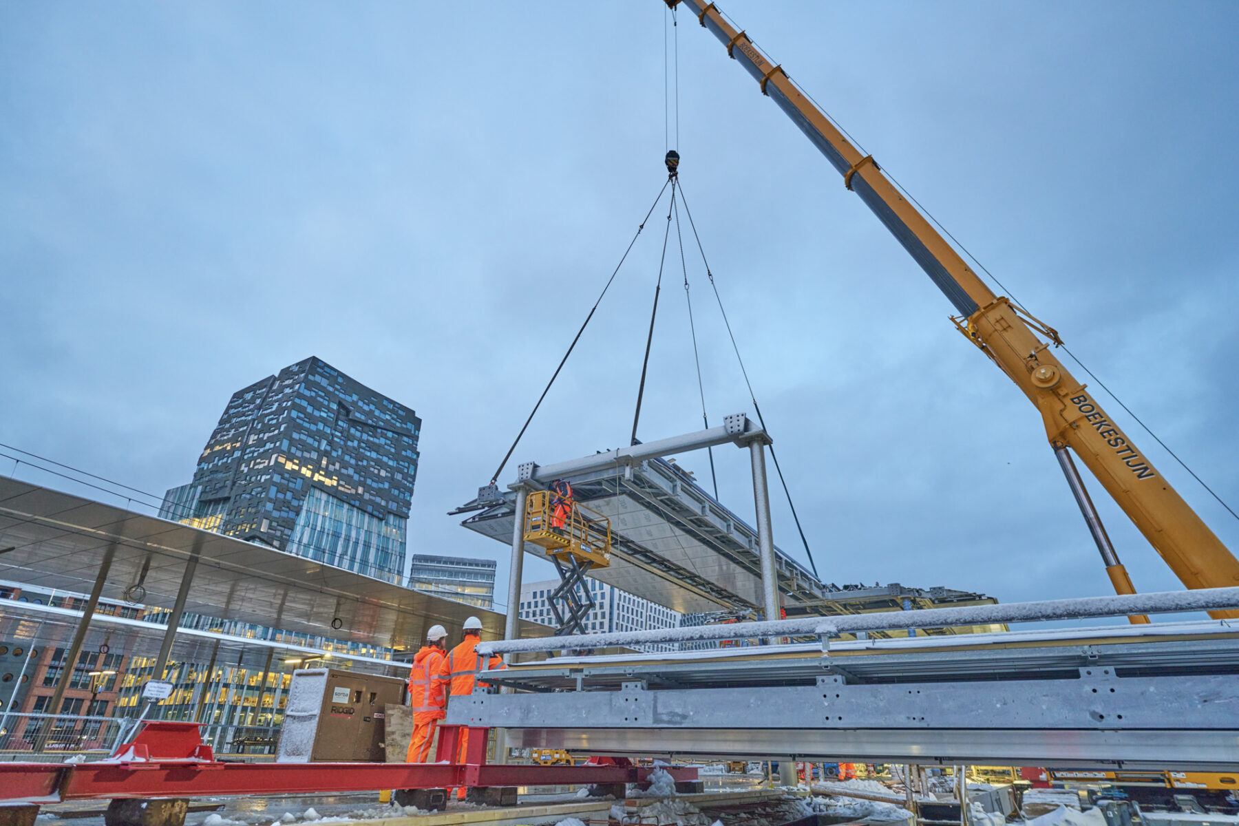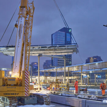Met een gevoelstemperatuur van -15 graden Celsius was het afgelopen weekend best even doorbijten voor de werkers van Bouwcombinatie Nieuw-Zuid (Mobilis, Boskalis en van Gelder). Toch lukte het de bikkels om de nieuwe perronkappen van het meest zuidelijke metroperron boven de nieuwe Brittenpassage op hun plek te hijsen. Ondanks de koude (en niet te vergeten de gladheid) verliep het werk succesvol én volgens planning.