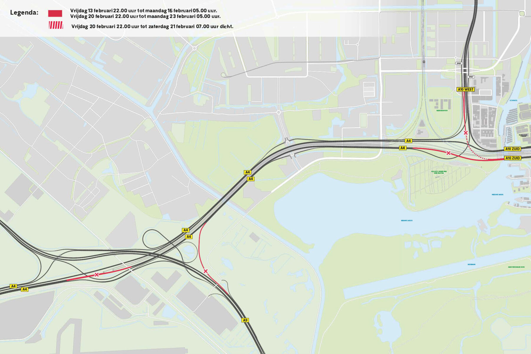 Van vrijdagavond 13 februari 22.00 uur tot maandagochtend 16 februari 05.00 uur is de A4 richting Amsterdam dicht tot afrit S108, voor verkeer vanuit de richtingen Schiphol en Amstelveen. Ook de verbinding van de A10 West richting de A10 Zuid is dan dicht. In het weekend van vrijdagavond 20 tot maandagochtend 23 februari geldt dezelfde afsluiting, maar dan is de verbinding tussen de A10 West en de A10 Zuid overdag open tussen 07.00 en 22.00 uur.