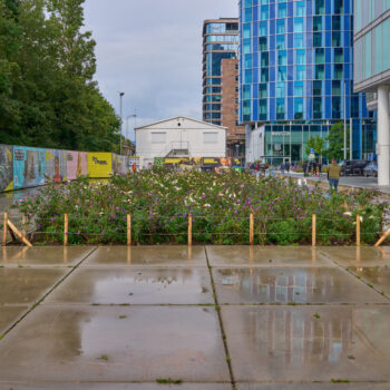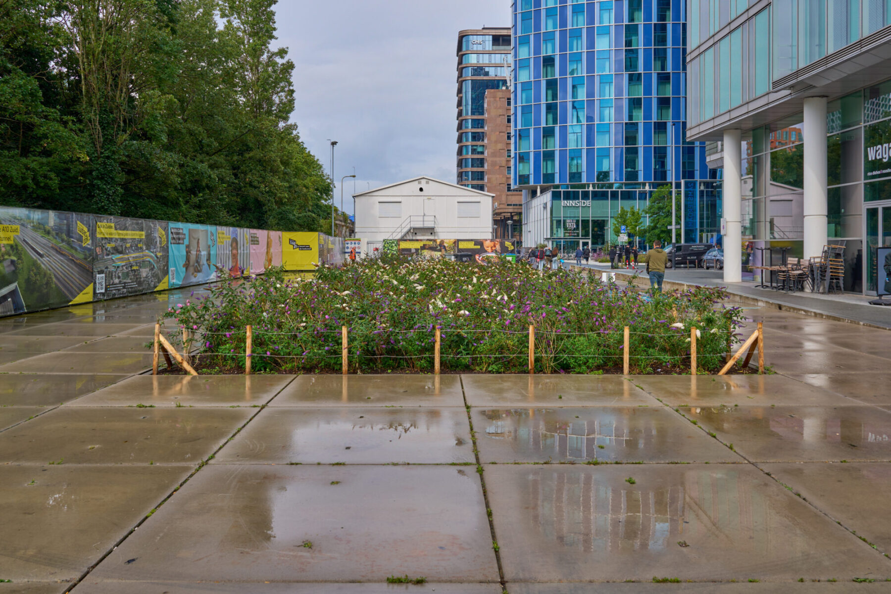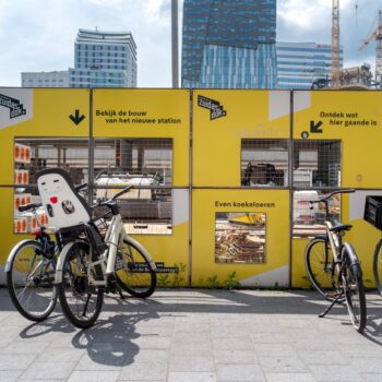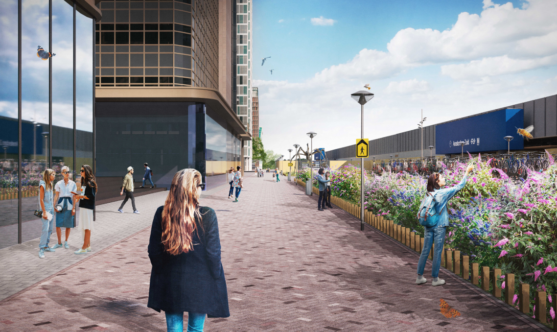 Het gaat om een inrichting voor slechts enkele jaren – de definitieve inrichting van het gebied volgt nadat de A10-tunnel is gebouwd. We hergebruiken daarom zo veel mogelijk materialen afkomstig van de gemeente Amsterdam én van verschillende stations in Nederland. Zo plaatsen we straks fietsenrekken van de oude ‘fietsenboot’ bij station Amsterdam Centraal en van station Ede-Wageningen bij de zuidelijke entree van de Brittenpassage. De houten paaltjes rondom het groen op de stationspleinen, zijn van iepen die op andere plekken in Amsterdam zijn gekapt. De (gebruikte) zitbankjes komen dan weer van ProRail: deze worden gezandstraald en daarna in een metallic lak gespoten.
