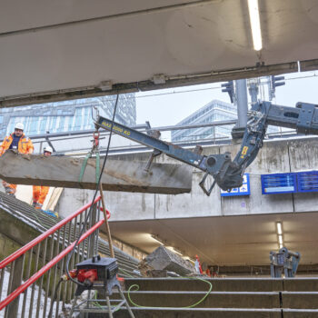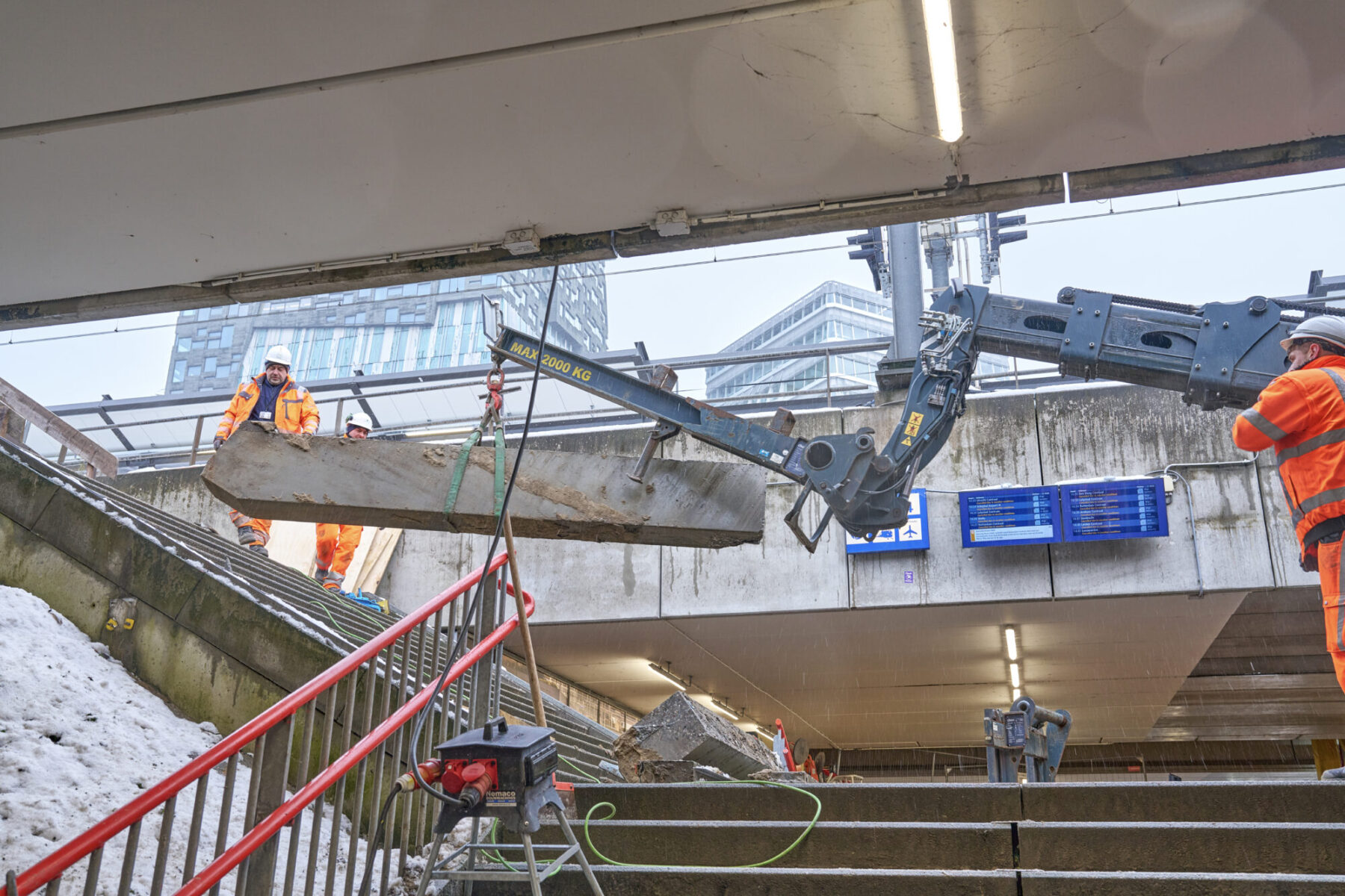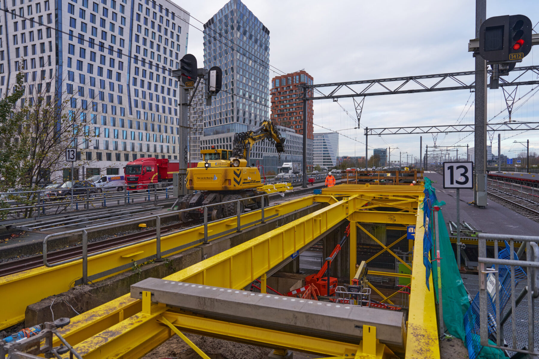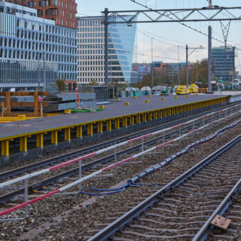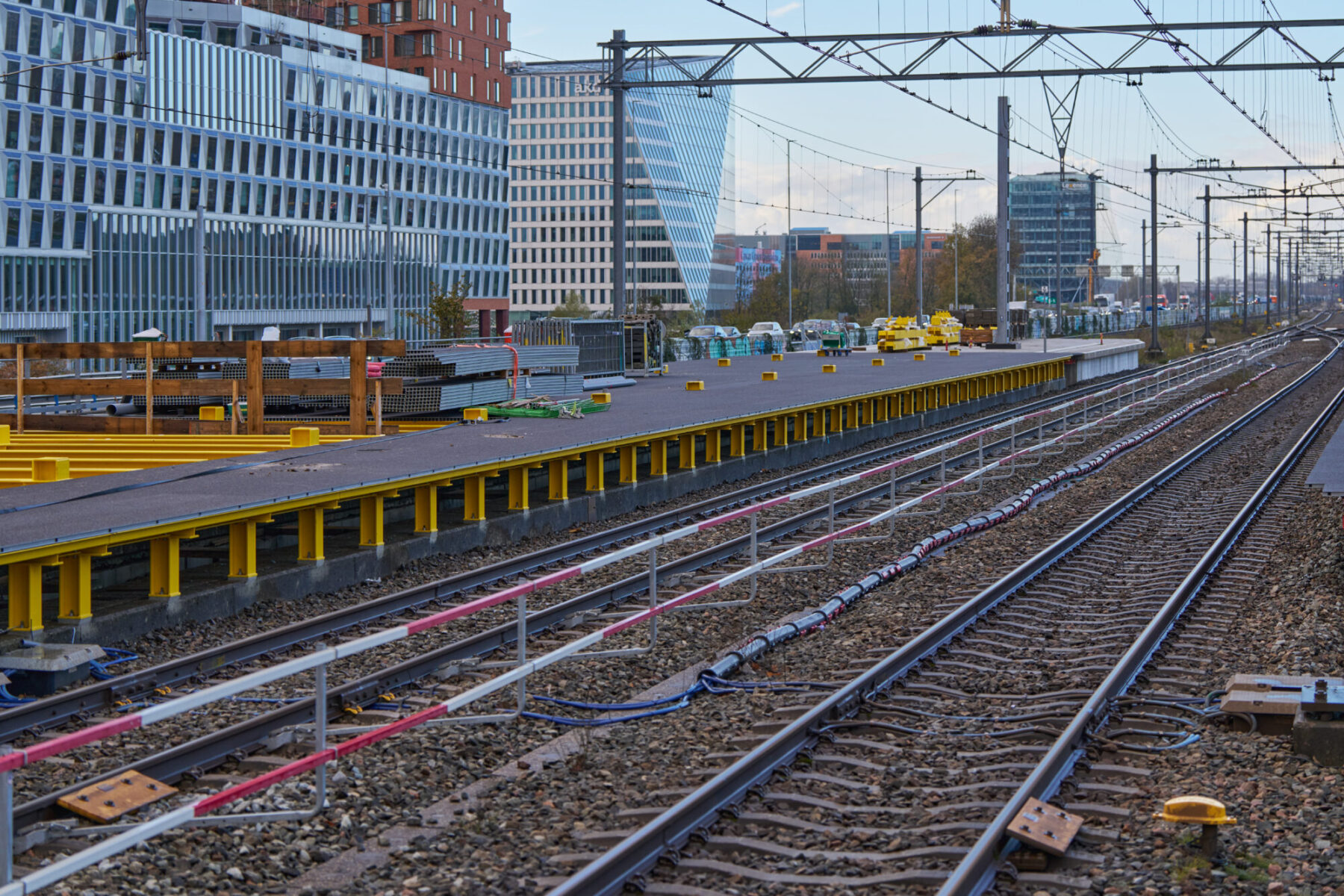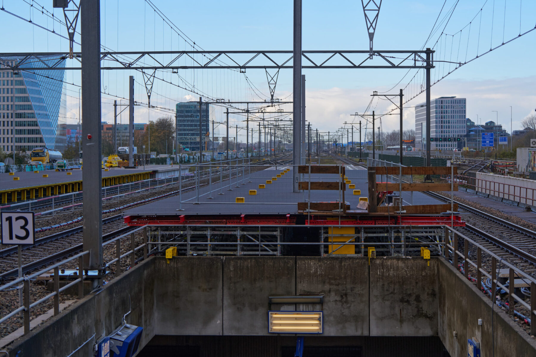 Om meer ruimte te maken voor reizigers, hebben we de afgelopen maanden de treinperrons aan de westzijde met zo’n 100 meter verlengd. Deze tijdelijke verlenging tot boven de Parnassusweg is voorzien van kappen om het reizigers zo comfortabel mogelijk te maken. Aan de oostzijde, boven de huidige reizigerspassage, gaat ongeveer diezelfde lengte juist van het treinperron af. We sluiten dit deel af om hier voorbereidend werk te kunnen doen voor de latere verbouwing van de huidige passage. Pas nadat deze passage geheel vernieuwd is, zullen de treinen tussen de twee reizigerspassages in gaan stoppen. Op dat moment verwijderen we ook de tijdelijke perronverlenging boven de Parnassusweg.