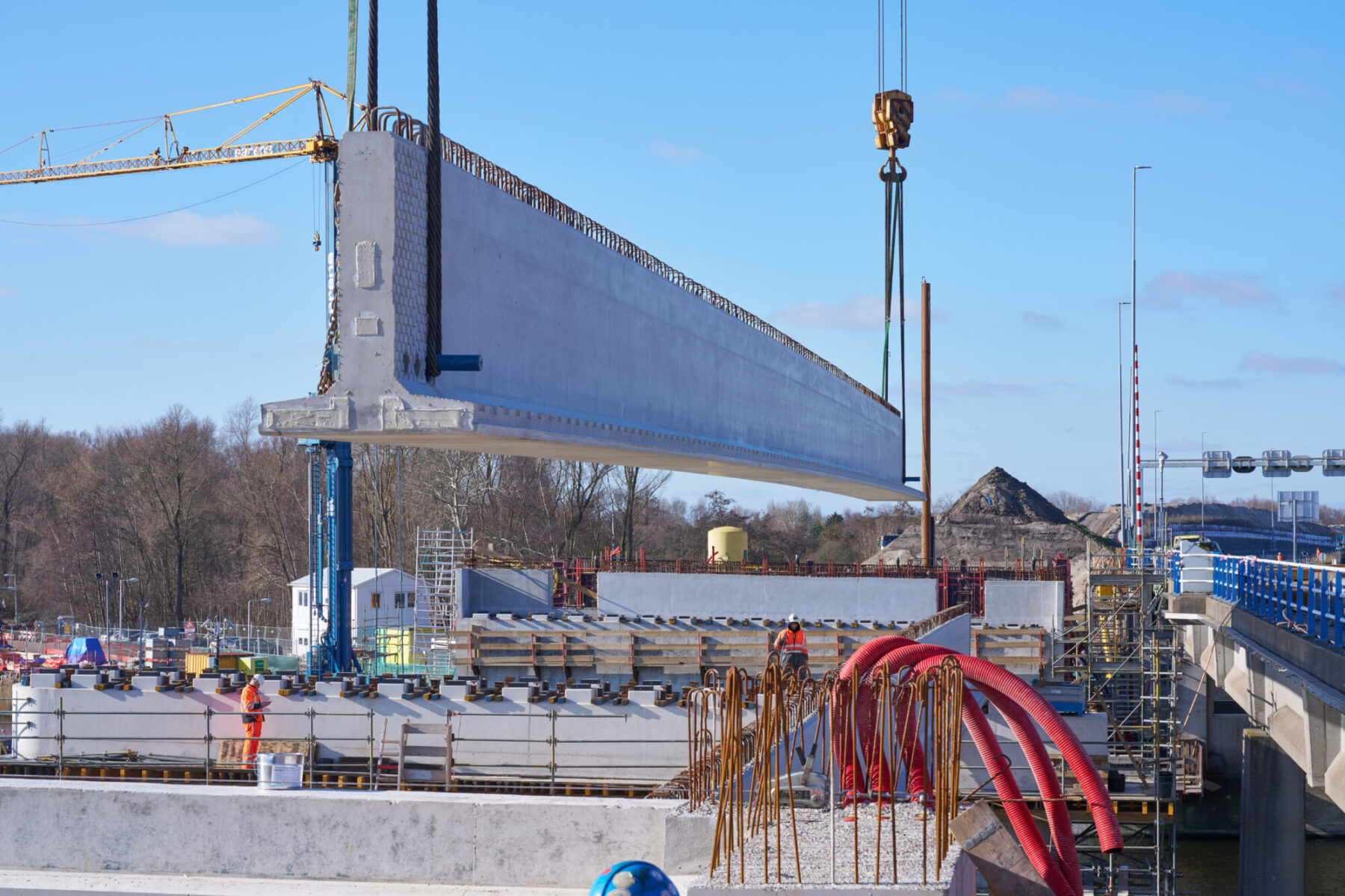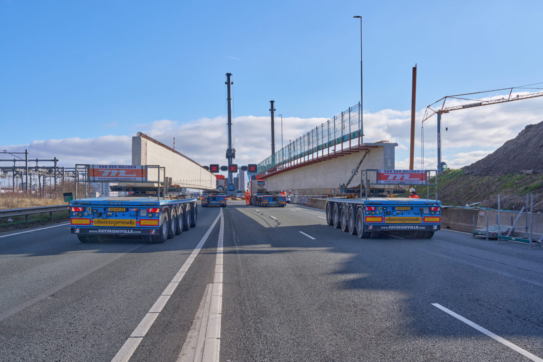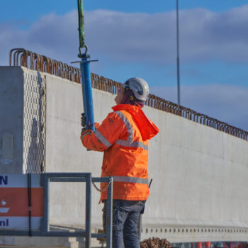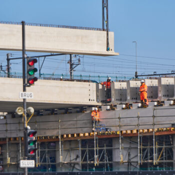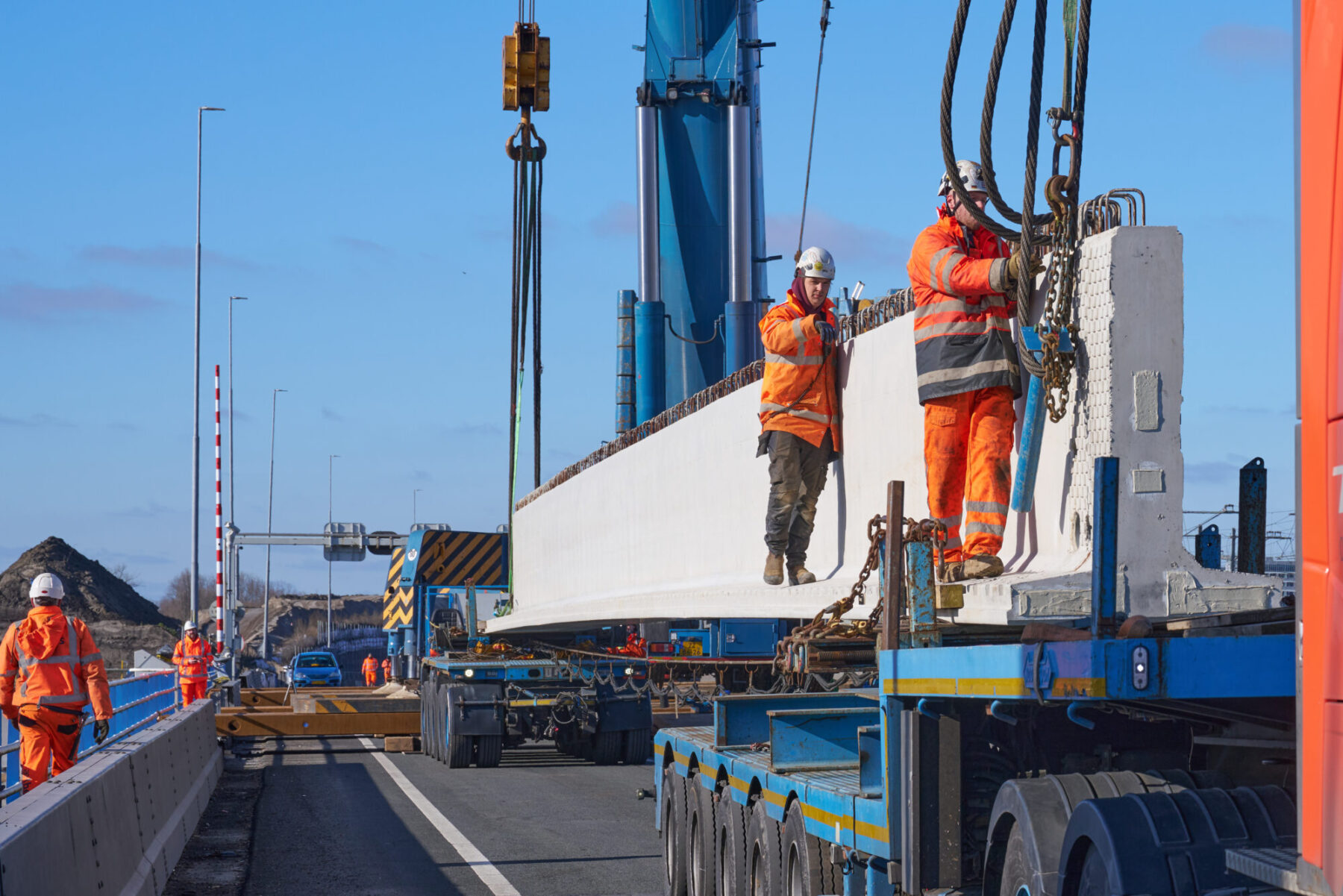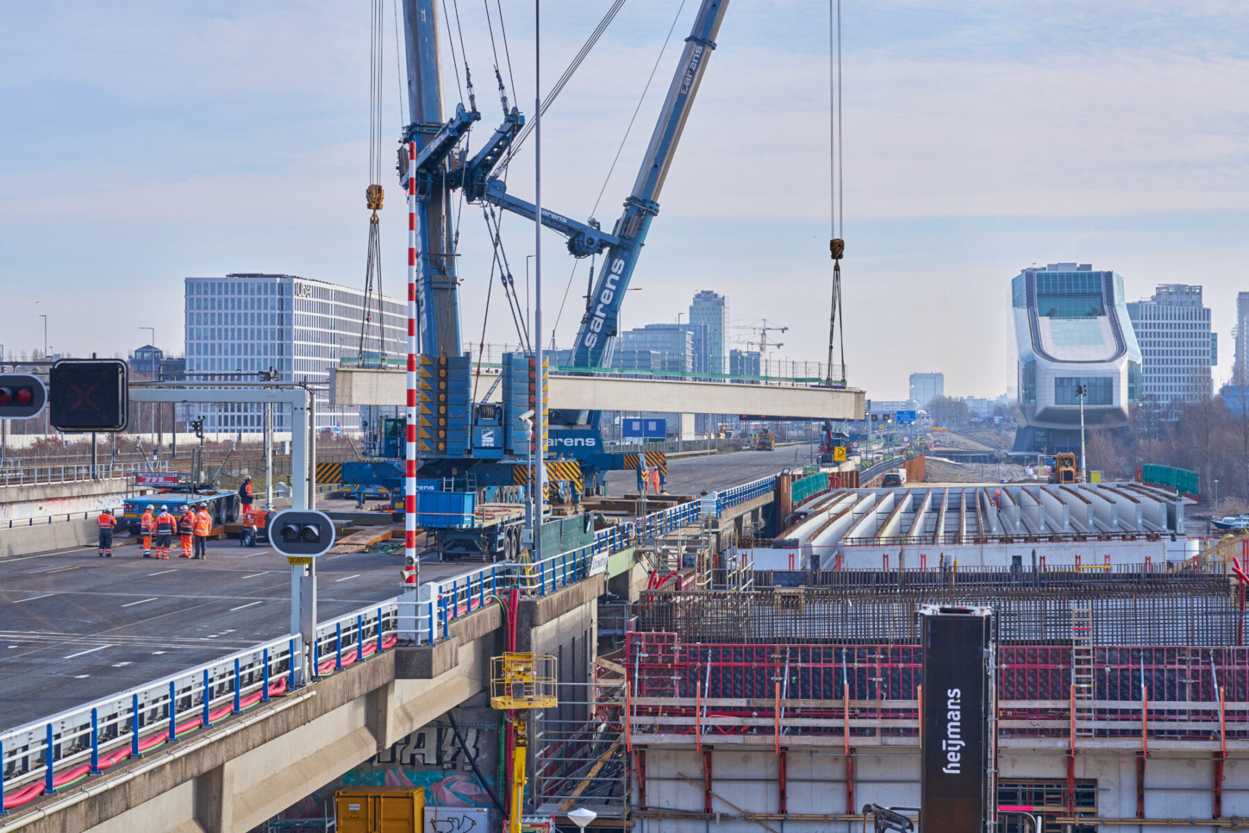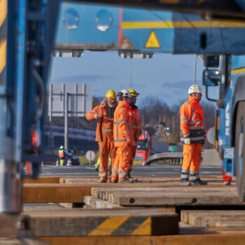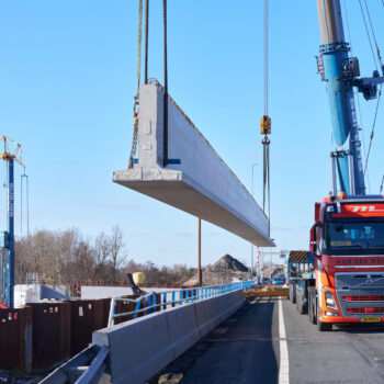 De omstandigheden waren niet de makkelijkste in het hijsweekend van 14 en 15 februari. Allereerst was er de uitdaging om twee gigantische telekranen op een ietwat verouderd viaduct neer te zetten. Vervolgens moesten die kranen samen 34 betonnen liggers van zo’n 75 ton per stuk op hun plek hijsen – denk aan weerszijden van zo’n ligger een kraan – over een afstand van tientallen meters. En dan was er nog het weer: de gure wind en een pak sneeuw maakten het werken niet per se aangenaam. Toch wist bouwcombinatie TriAX (Besix, Dura Vermeer en Heijmans) het allemaal succesvol én op tijd voor elkaar te krijgen.