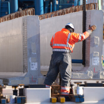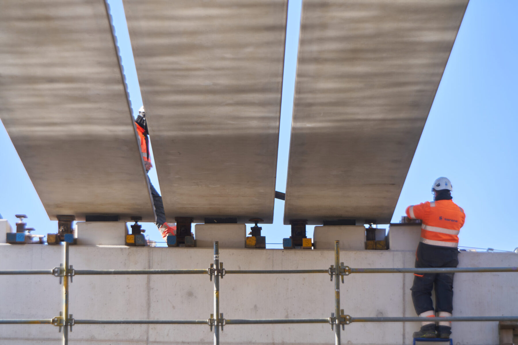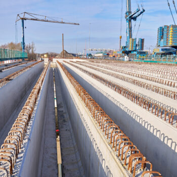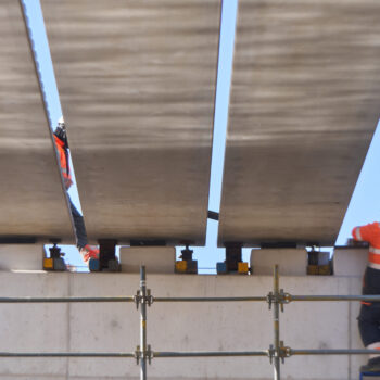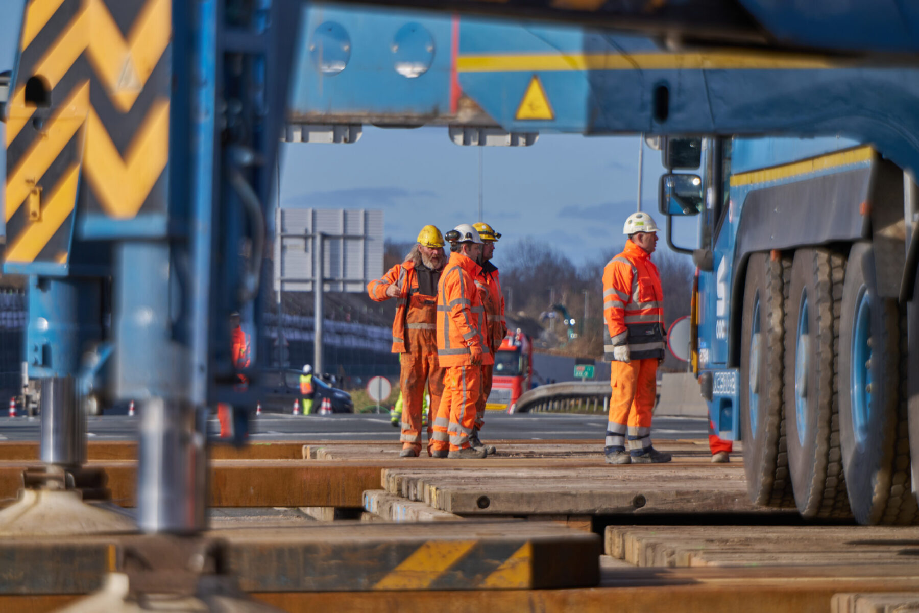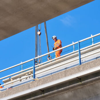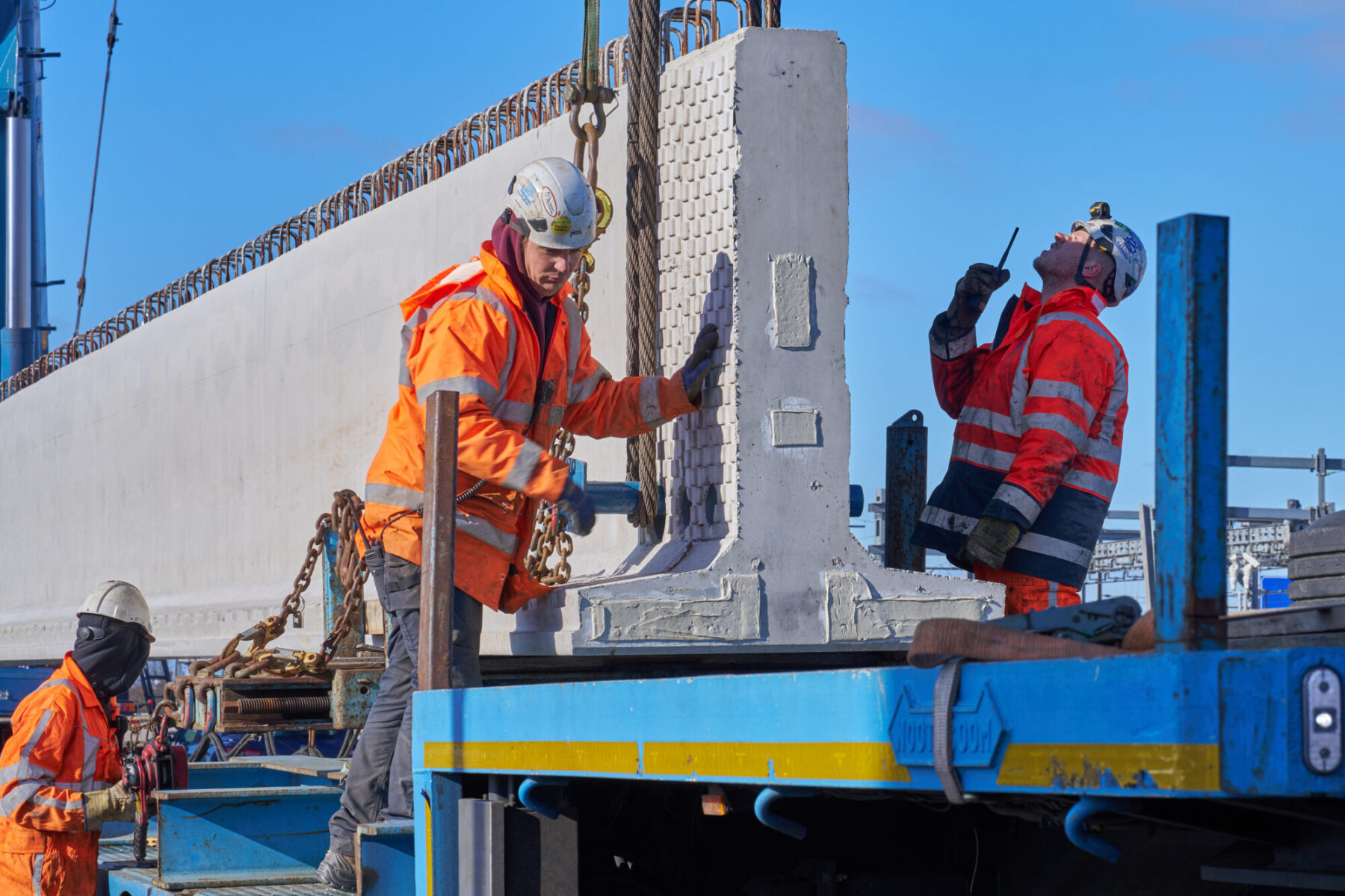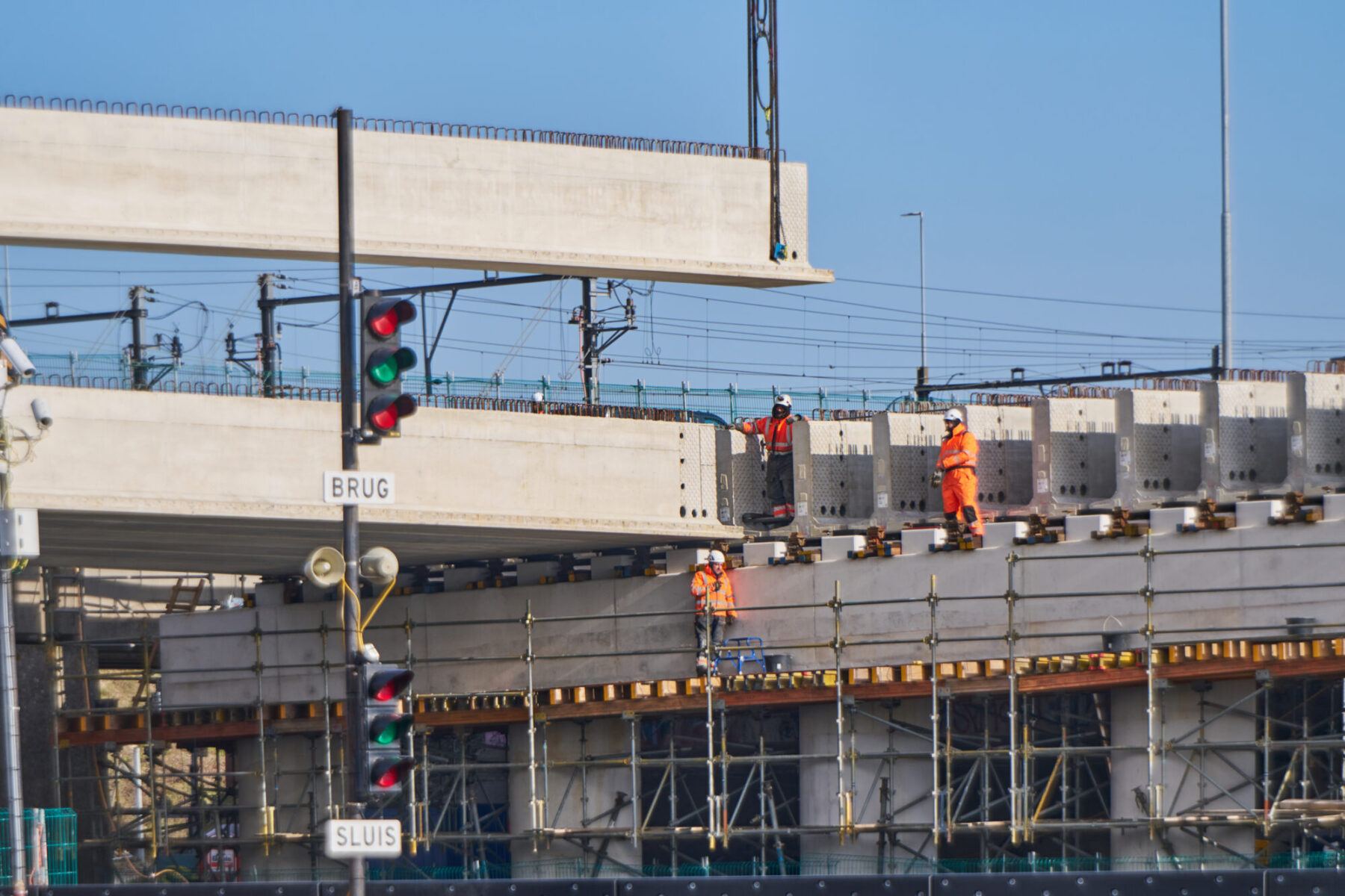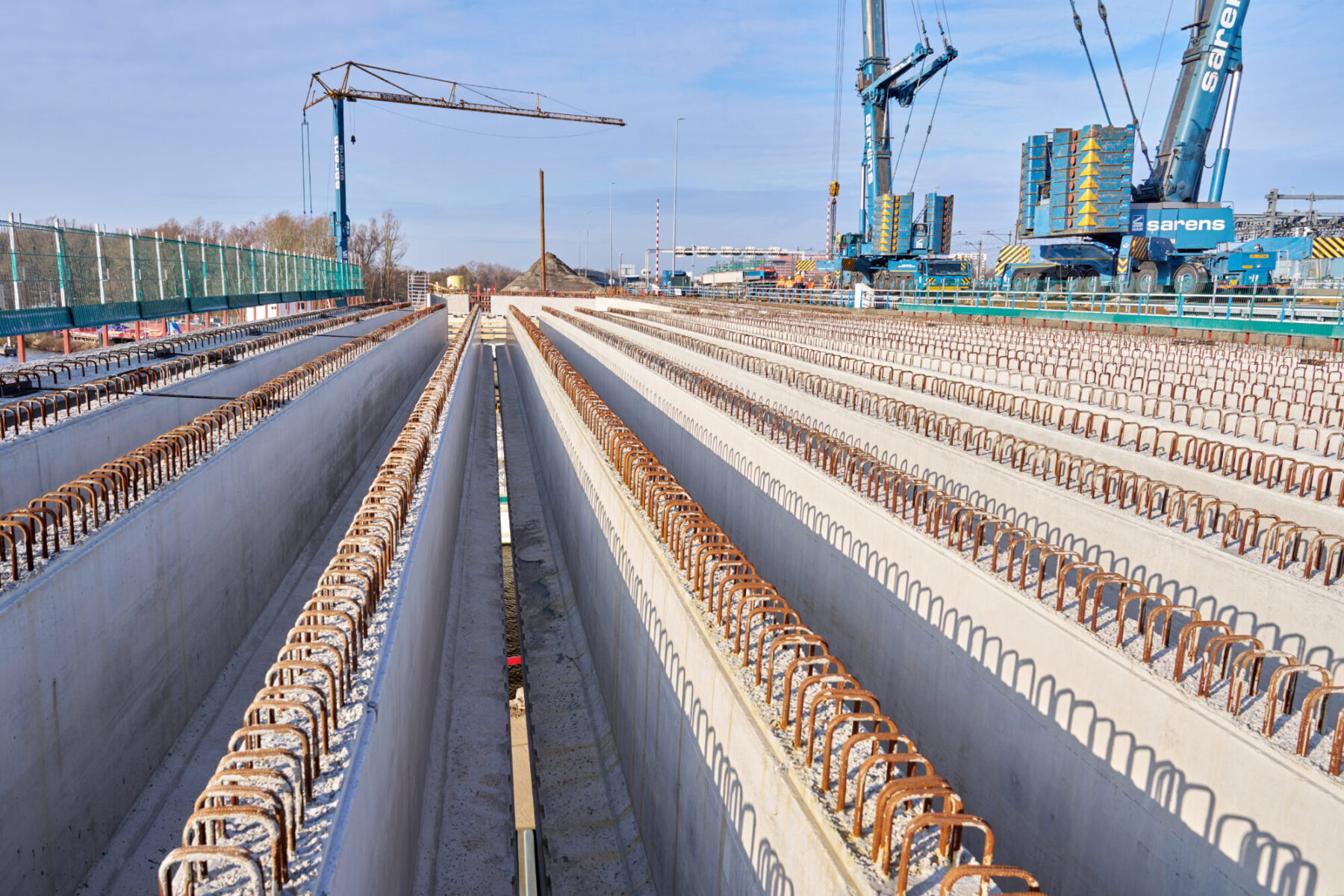 De omstandigheden waren niet de makkelijkste in het hijsweekend van 14 en 15 februari. Allereerst was er de uitdaging om twee gigantische telekranen op een ietwat verouderd viaduct neer te zetten. Vervolgens moesten die kranen samen 34 betonnen liggers van zo’n 75 ton per stuk op hun plek hijsen – denk aan weerszijden van zo’n ligger een kraan – over een afstand van tientallen meters. En dan was er nog het weer: de gure wind en een pak sneeuw maakten het werken niet per se aangenaam. Toch wist bouwcombinatie TriAX (Besix, Dura Vermeer en Heijmans) het allemaal succesvol én op tijd voor elkaar te krijgen.