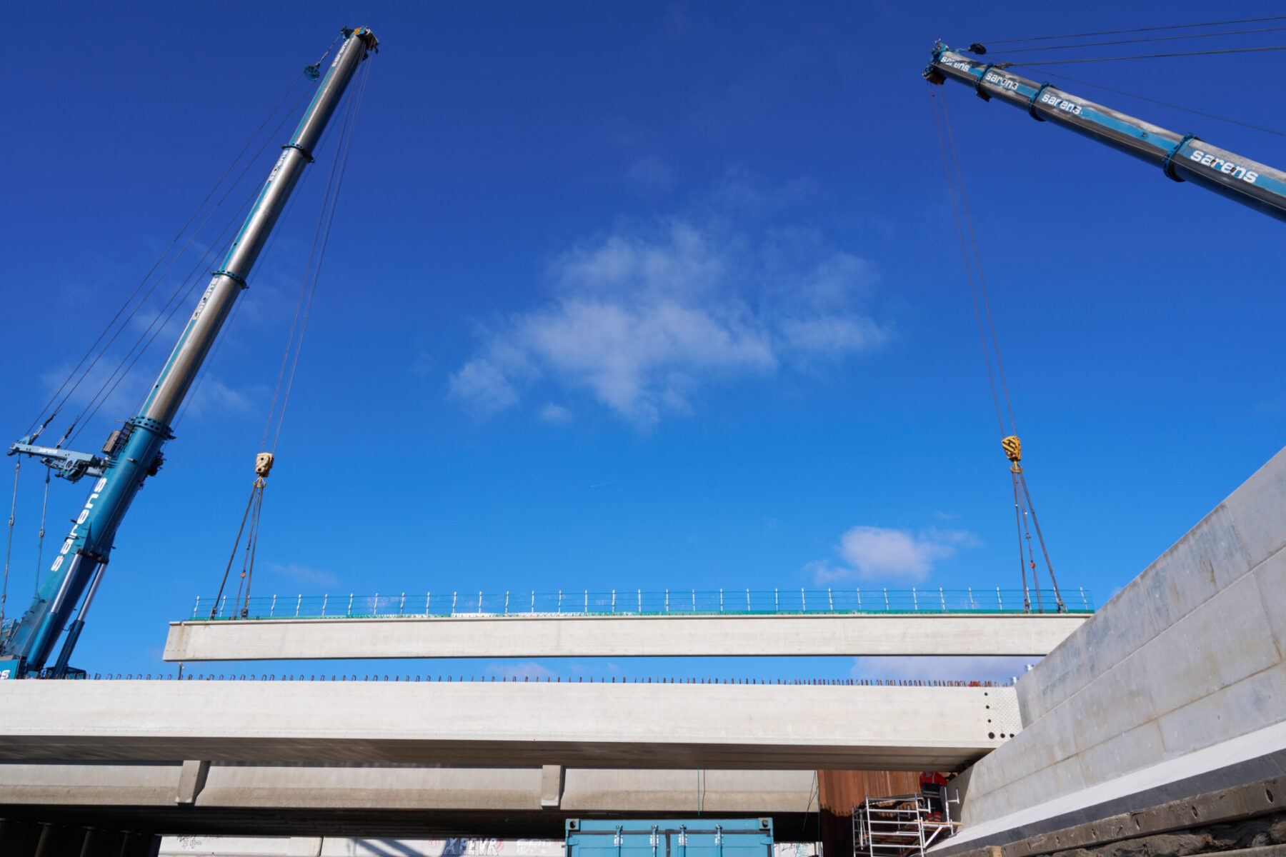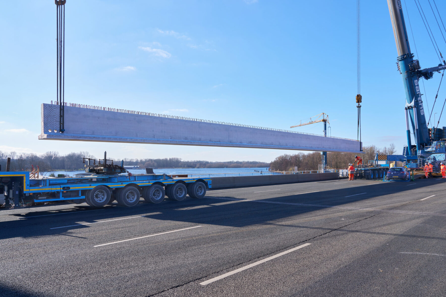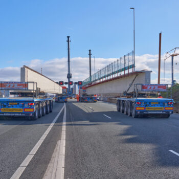 Het samenspel tussen de twee kranen was cruciaal voor het slagen van de spectaculaire hijsoperatie. Zodra ze niet synchroon bewegen is de belasting niet meer goed verdeeld, en raakt de boel uit balans. Elke beweging (hoe minimaal ook) moet dus kloppen. Voor het inhijsen van de meest zuidelijke liggers van de nieuwe ‘brug 9’ moesten de kranen zelfs zo’n 33 meter overbruggen, extra spannend dus. Toch ging dat soepel en gecontroleerd.