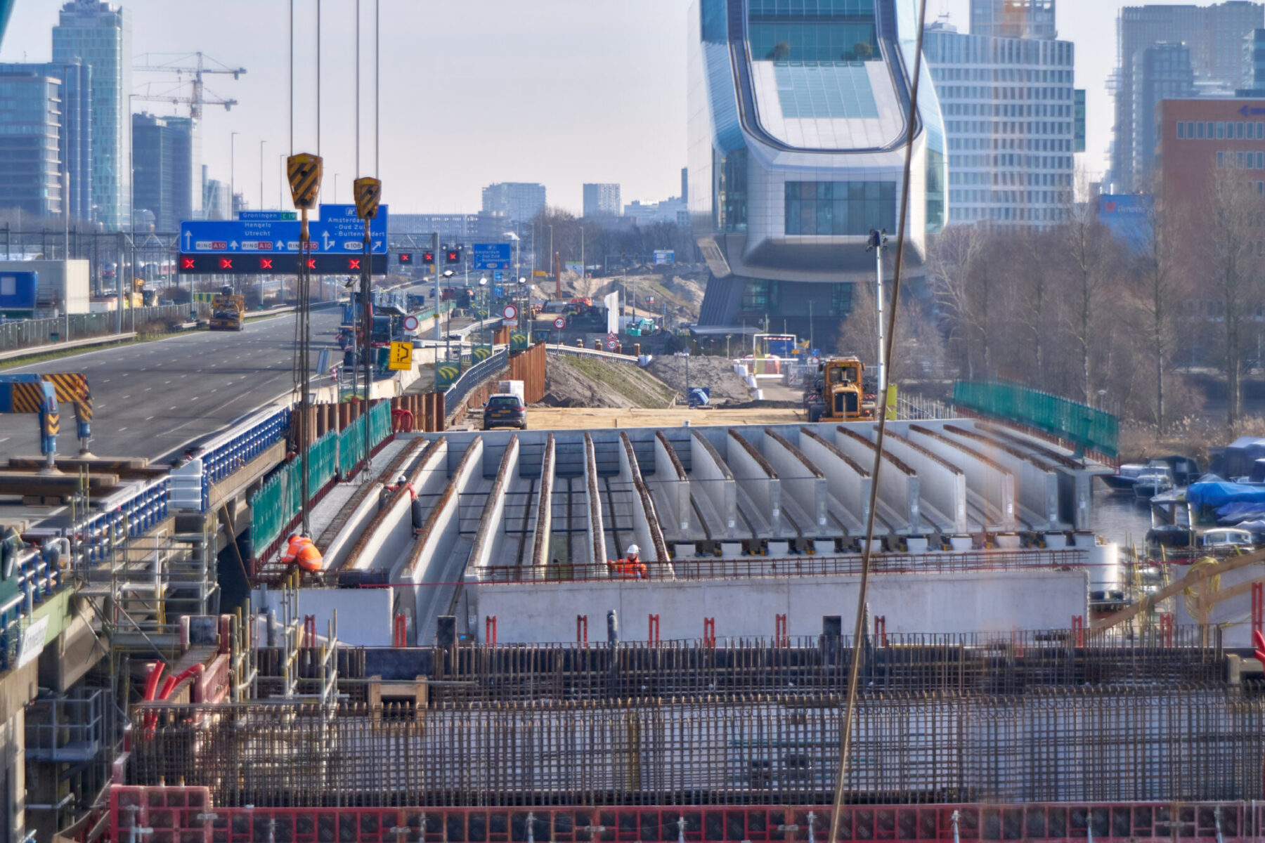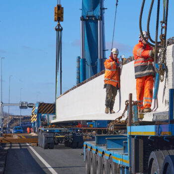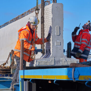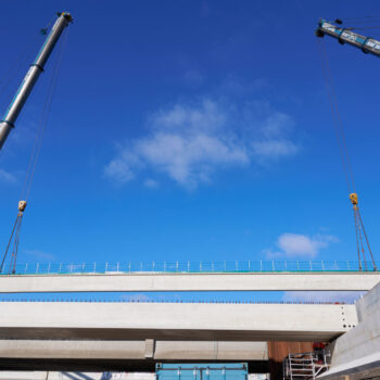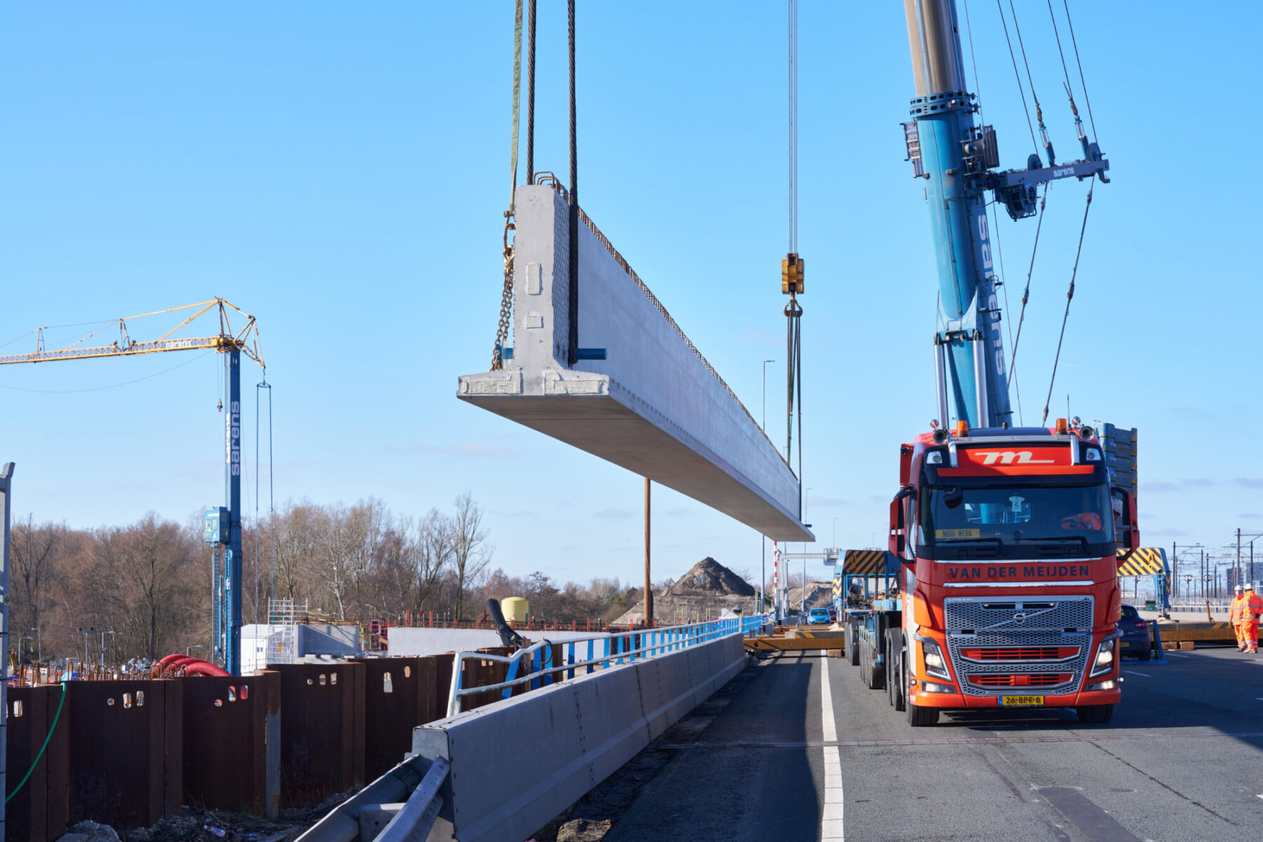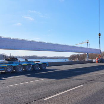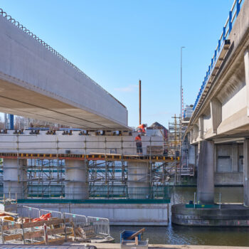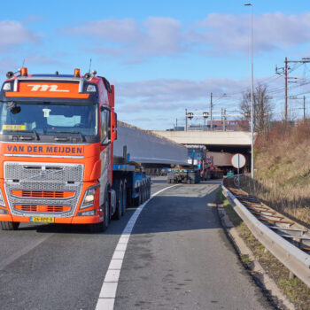 De voorgebouwde liggers reisden eerder al over water vanuit Friesland naar de haven van Amsterdam. Daarvandaan kwamen ze het afgelopen weekend op trailers over de A10 richting de Schinkelbrug gereden. Het op de plek hijsen van een doorsnee 40 meter lange ligger duurde zo’n vijftien á twintig minuten. Alleen het inhijsen van de zogenaamde randliggers – die groter zijn en extra bevestiging nodig hebben – nam wat langer in beslag.