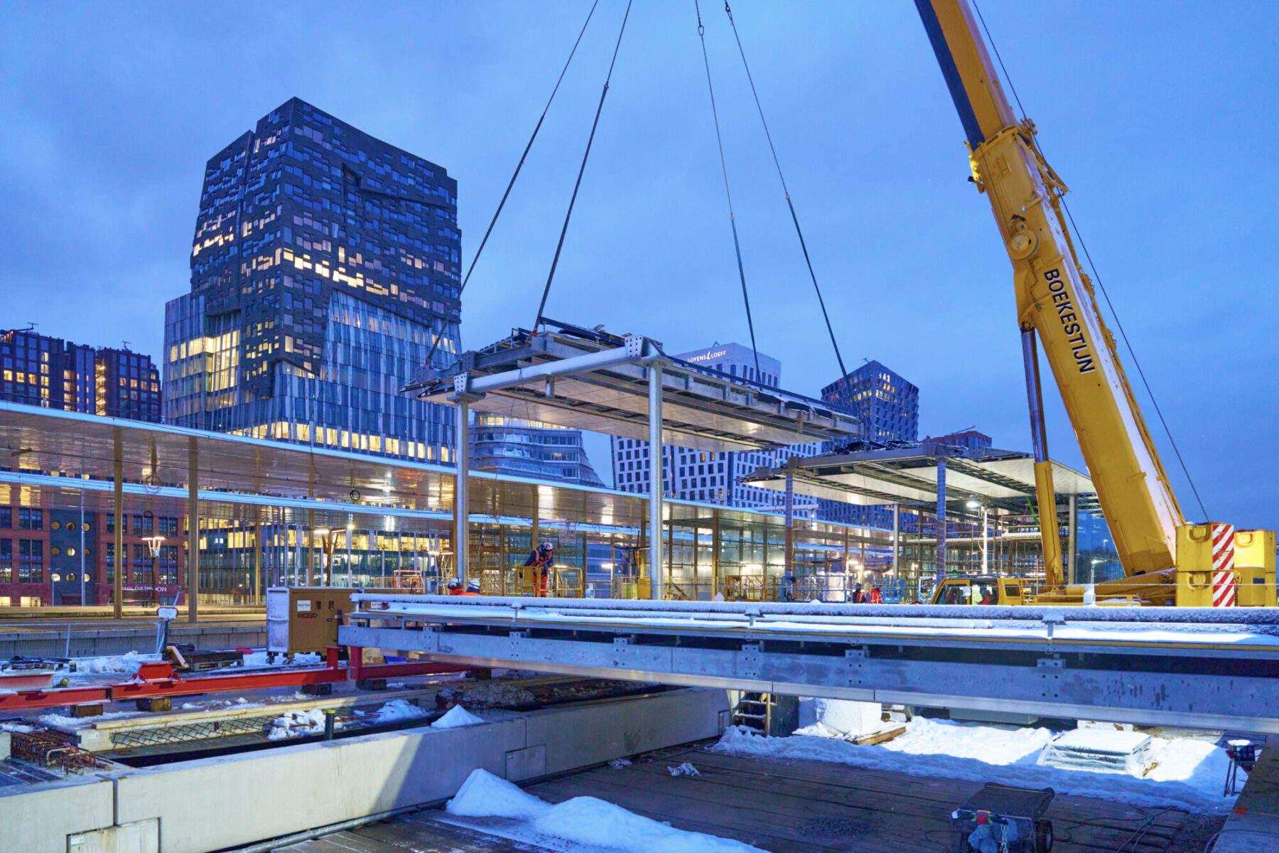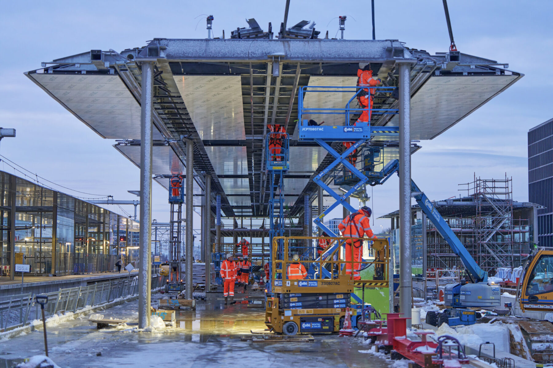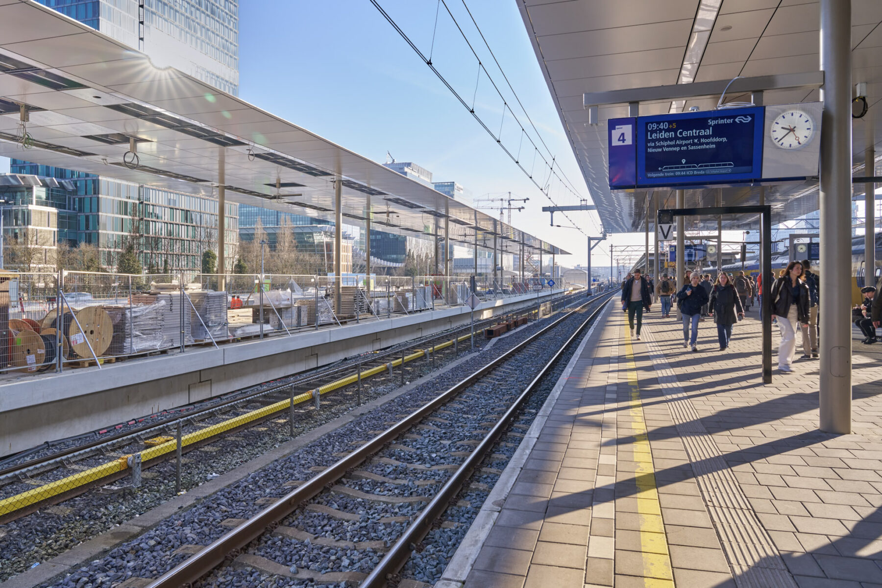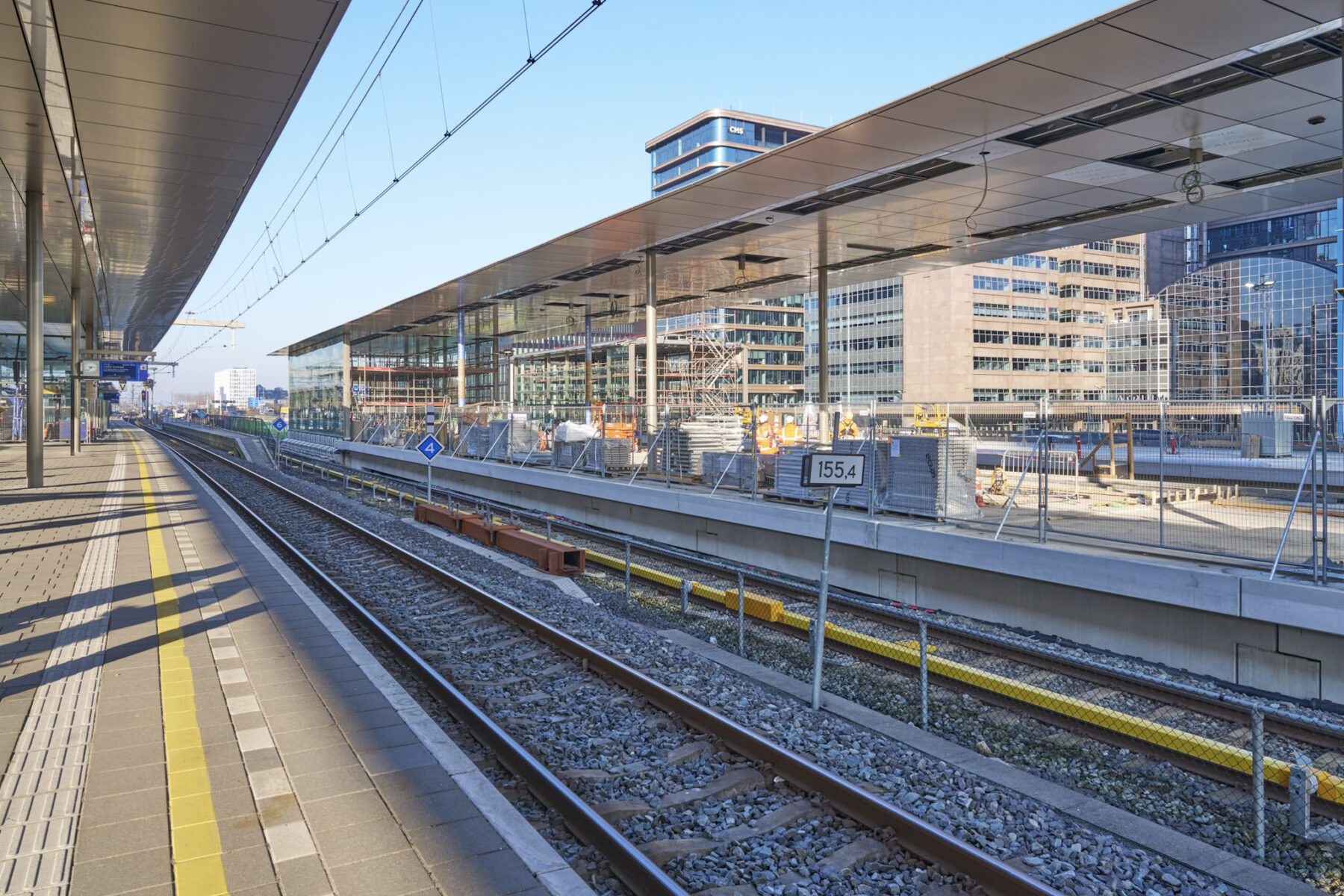 Boven, tussen de bestaande Minervapassage en de nieuwe Brittenpassage in, krijgen ondertussen de nieuwe metroperrons vorm. Het zuidelijke metroperron heeft inmiddels perronkappen, het perron ernaast volgt snel. Koning: ‘De treinperrons waren al eerder aan de beurt. Die zijn inmiddels ook nog verlengd tot over de Brittenpassage, zodat de treinen nu dichter bij de Parnassusweg kunnen halteren. Zo maken we ruimte om de oude treinperronkappen en -sporen bij de Minervapassage te slopen, terwijl de reiziger iets verderop gewoon gebruik kan blijven maken van de trein.’