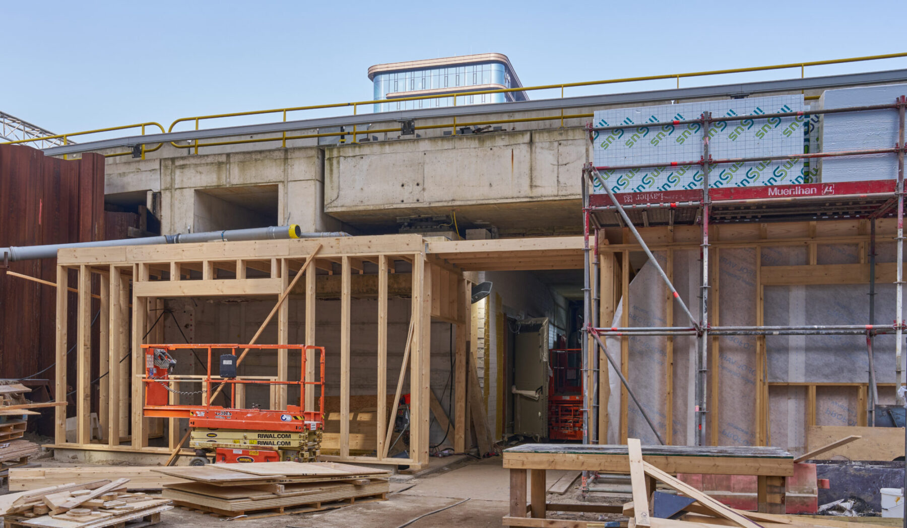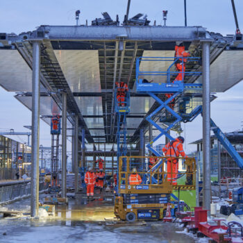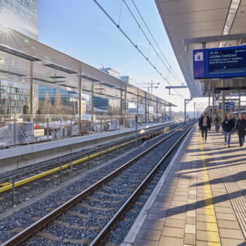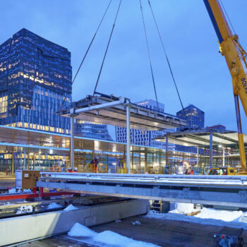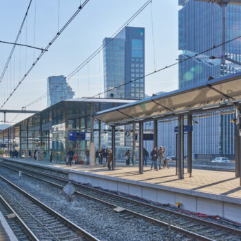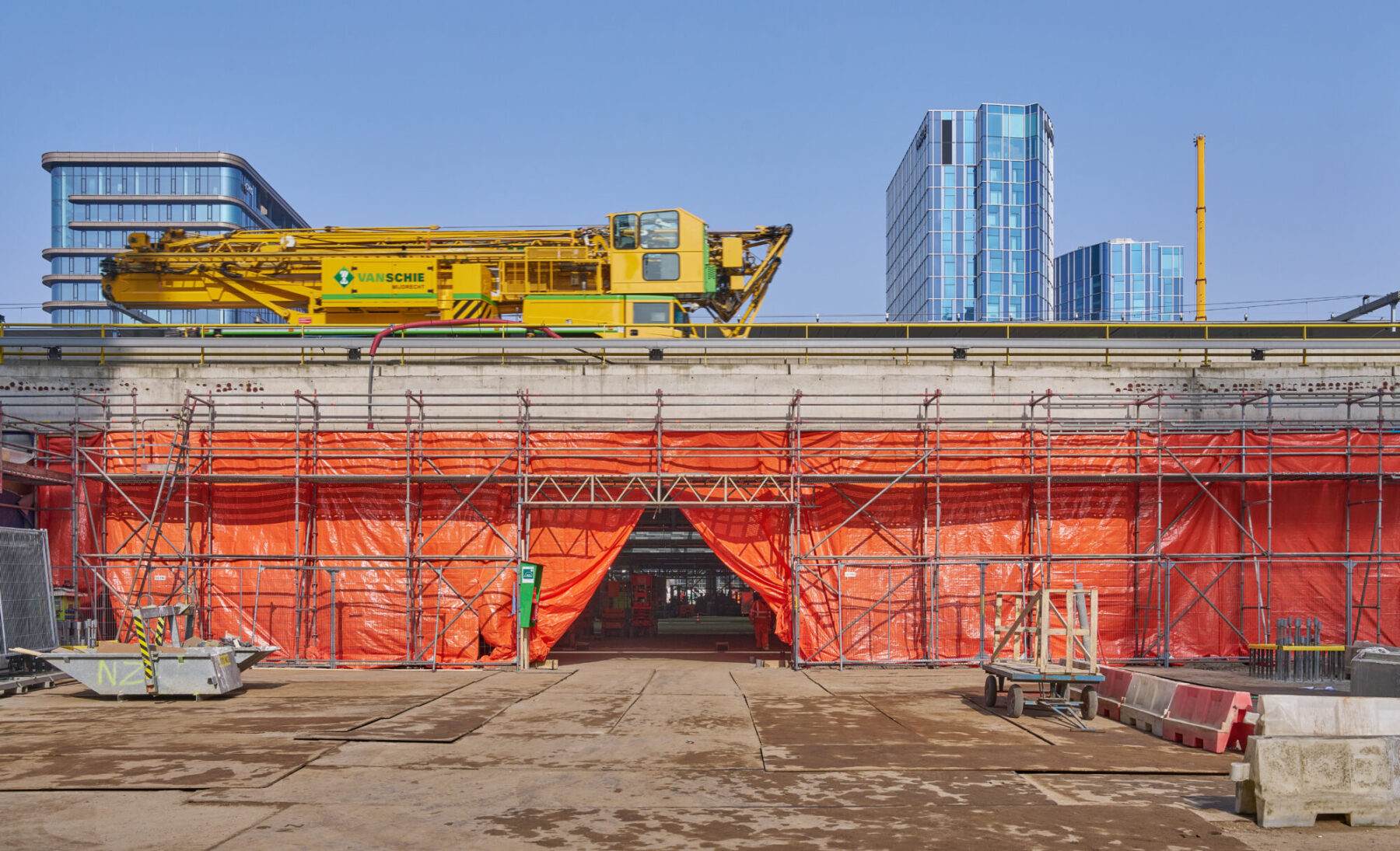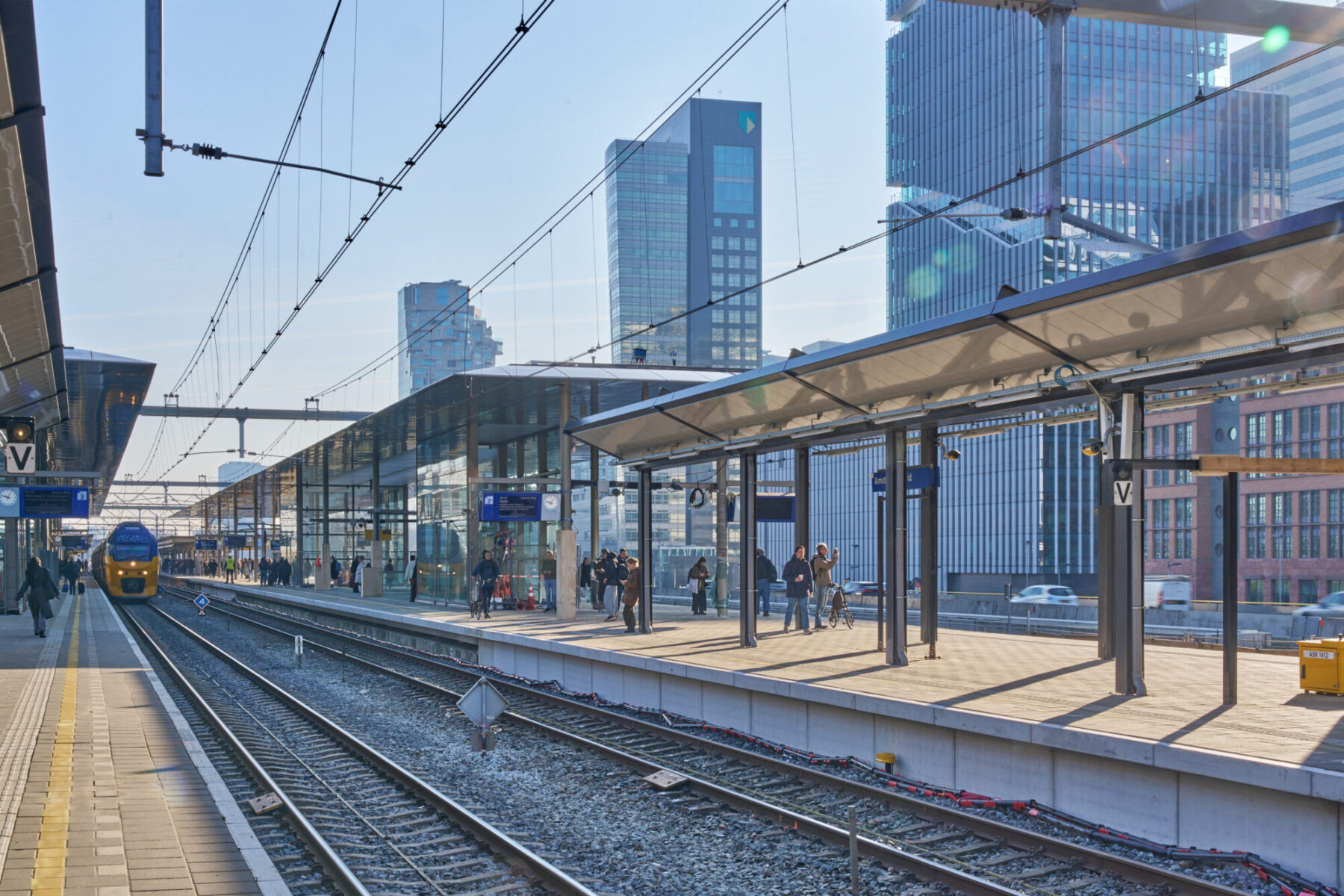 Boven, tussen de bestaande Minervapassage en de nieuwe Brittenpassage in, krijgen ondertussen de nieuwe metroperrons vorm. Het zuidelijke metroperron heeft inmiddels perronkappen, het perron ernaast volgt snel. Koning: ‘De treinperrons waren al eerder aan de beurt. Die zijn inmiddels ook nog verlengd tot over de Brittenpassage, zodat de treinen nu dichter bij de Parnassusweg kunnen halteren. Zo maken we ruimte om de oude treinperronkappen en -sporen bij de Minervapassage te slopen, terwijl de reiziger iets verderop gewoon gebruik kan blijven maken van de trein.’
