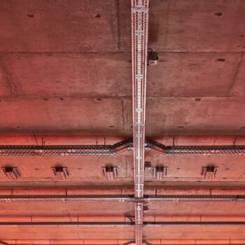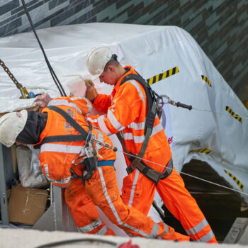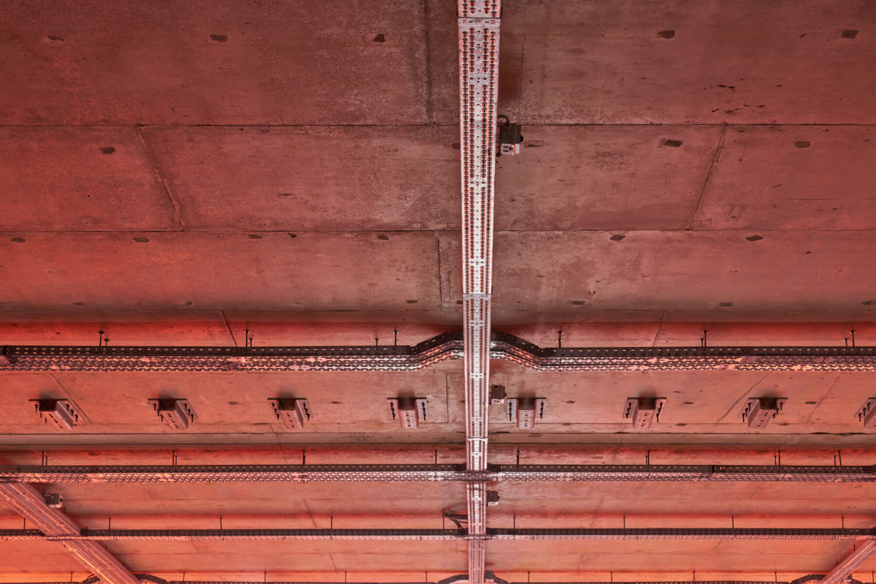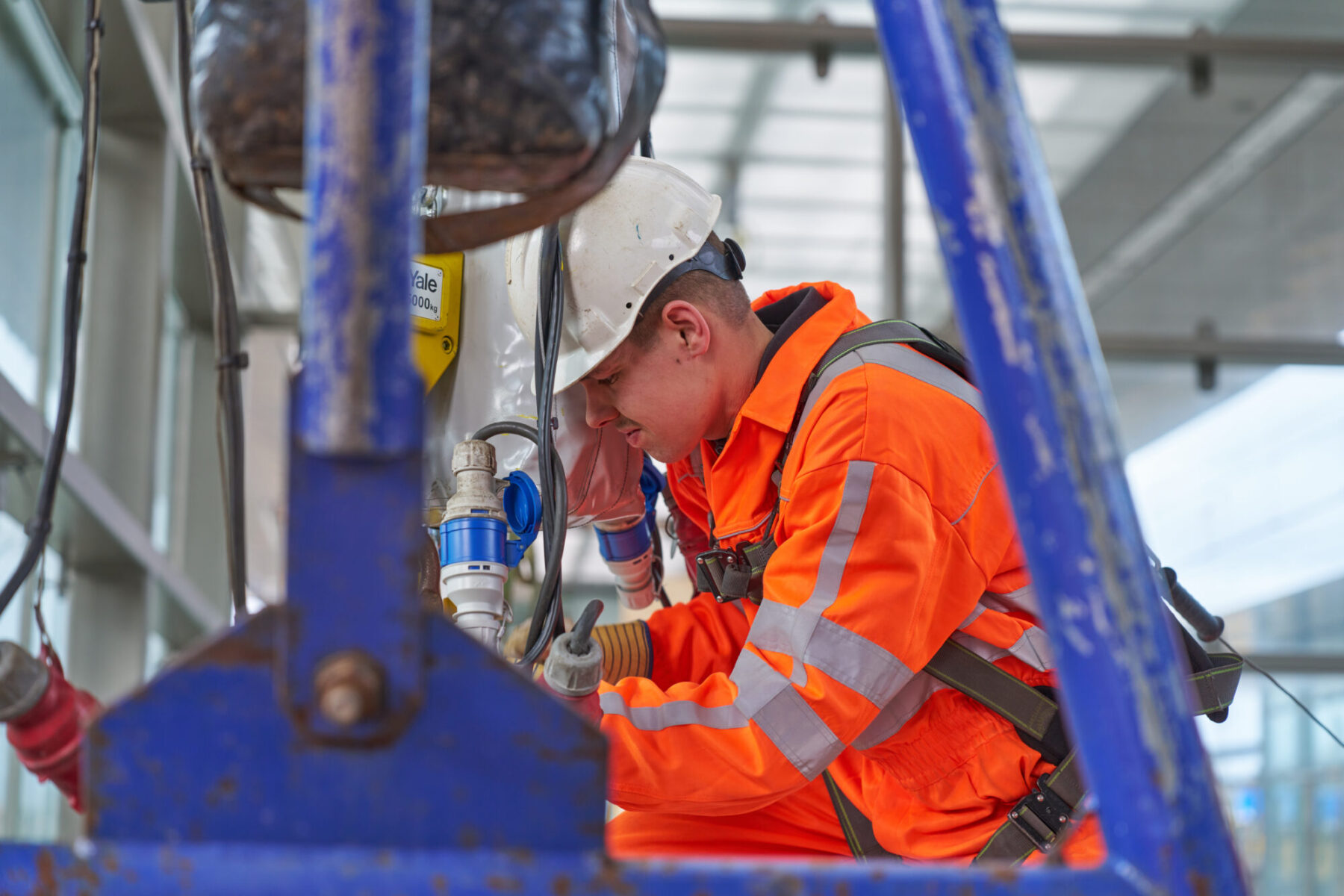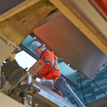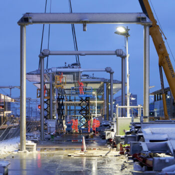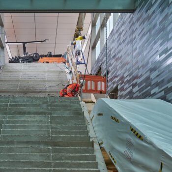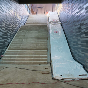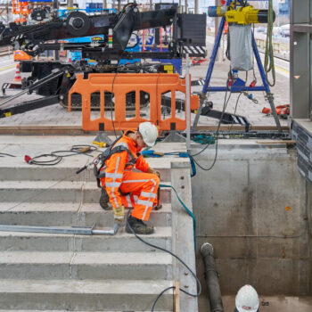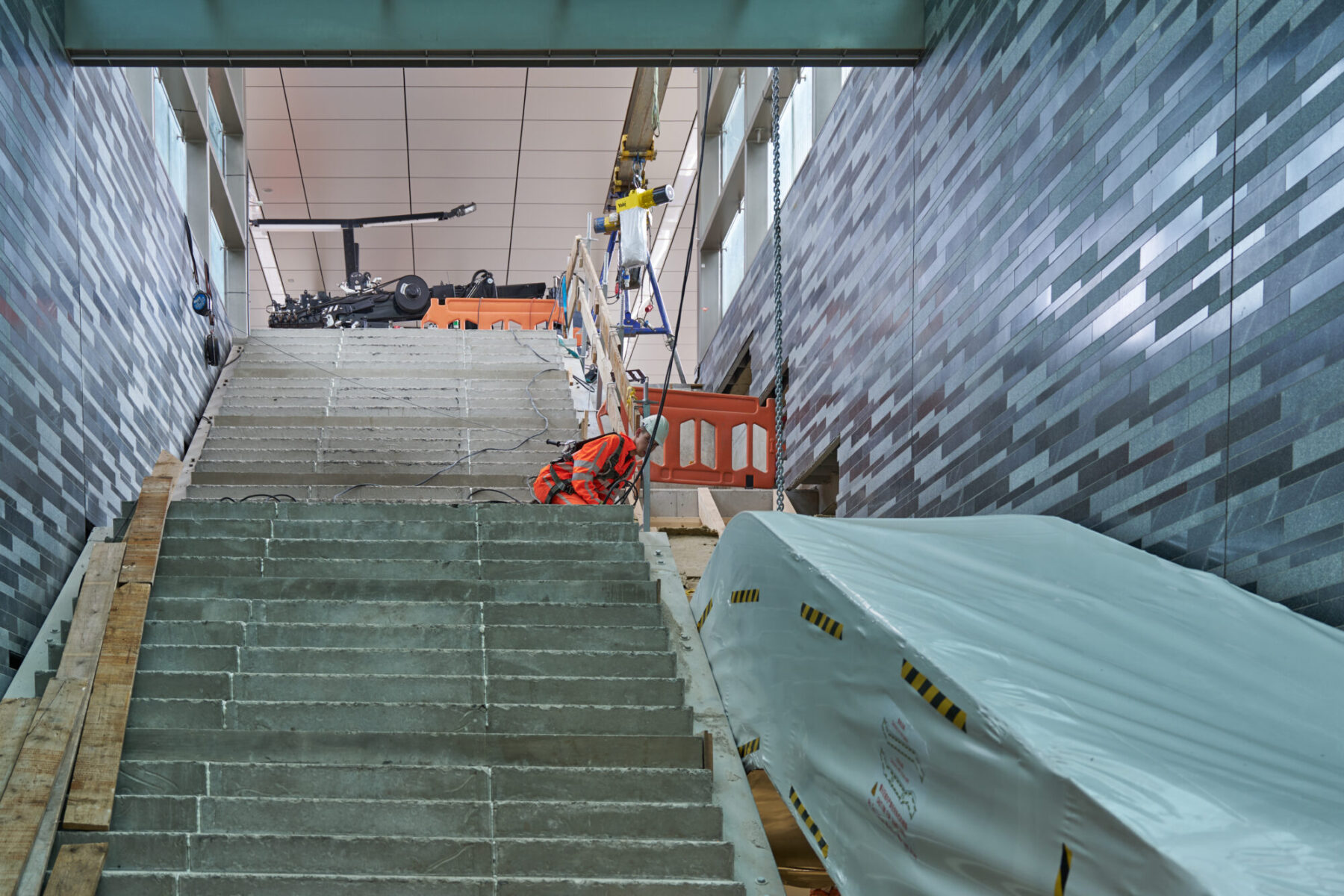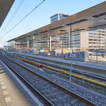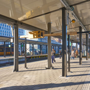 Bij de trap naar het metroperron kijken we omhoog, waar de passage overkapt wordt door een stalen geraamte afgedekt met folie. ‘We vervangen de folie binnenkort door gebogen glas , zodat het voorjaarslicht vrijelijk naar binnen kan vallen’, legt Koning uit. ‘Bij de metroperrons hebben we daar ruimte voor, bij de treinsporen niet; daar loopt het perron immers door tot over de passage. Met de glasplaten moeten we overigens wel nog even wachten totdat het kwik buiten de 15 graden aantikt, anders kan het glas breken bij de montage.’