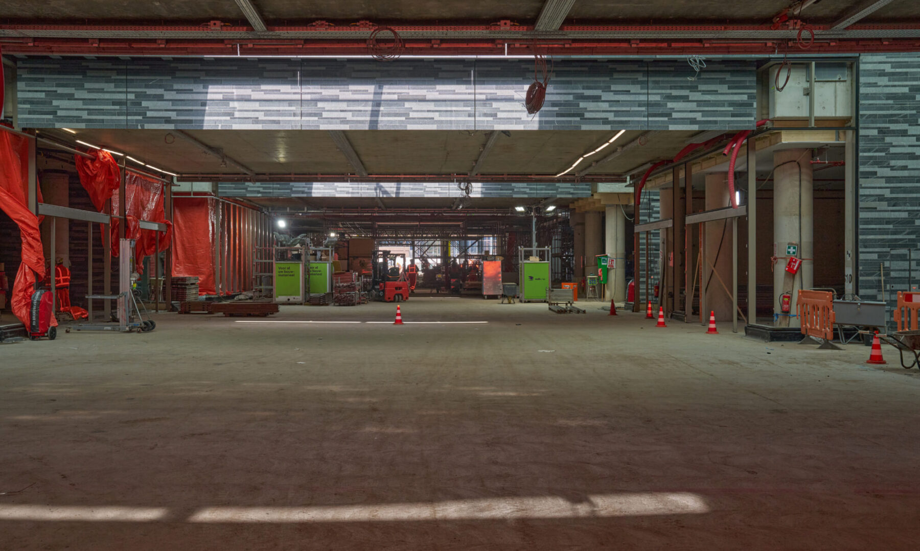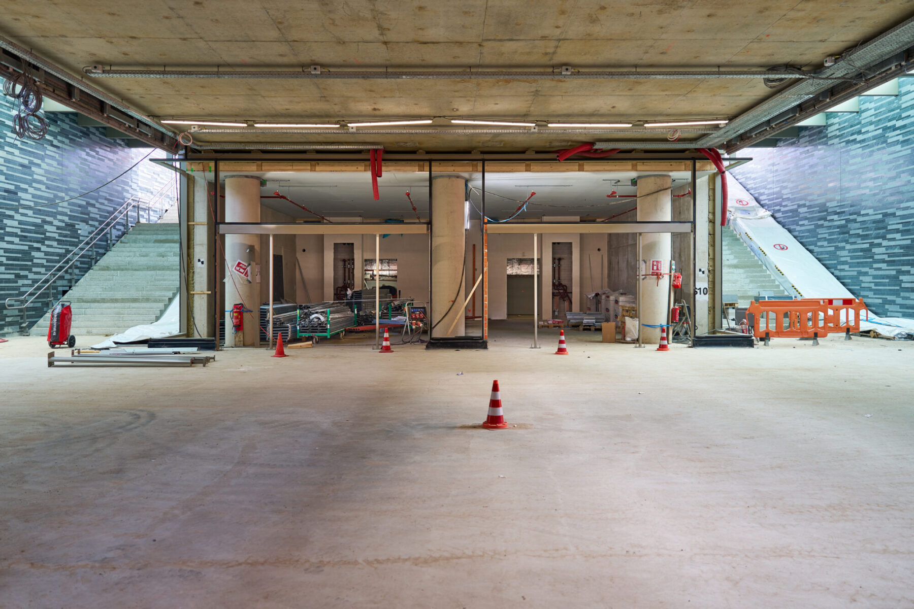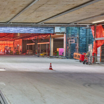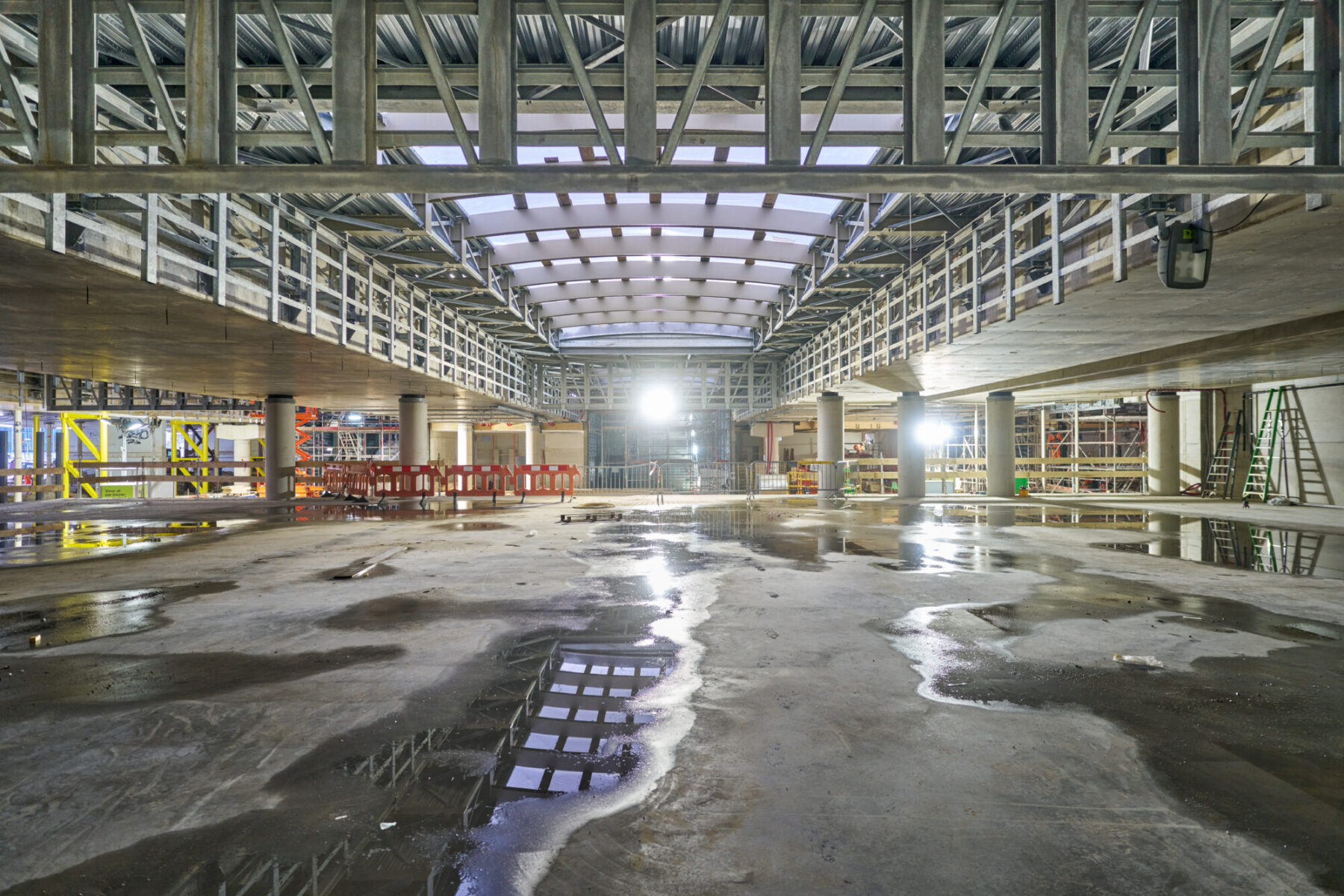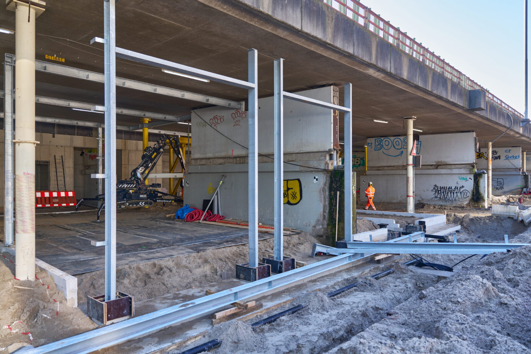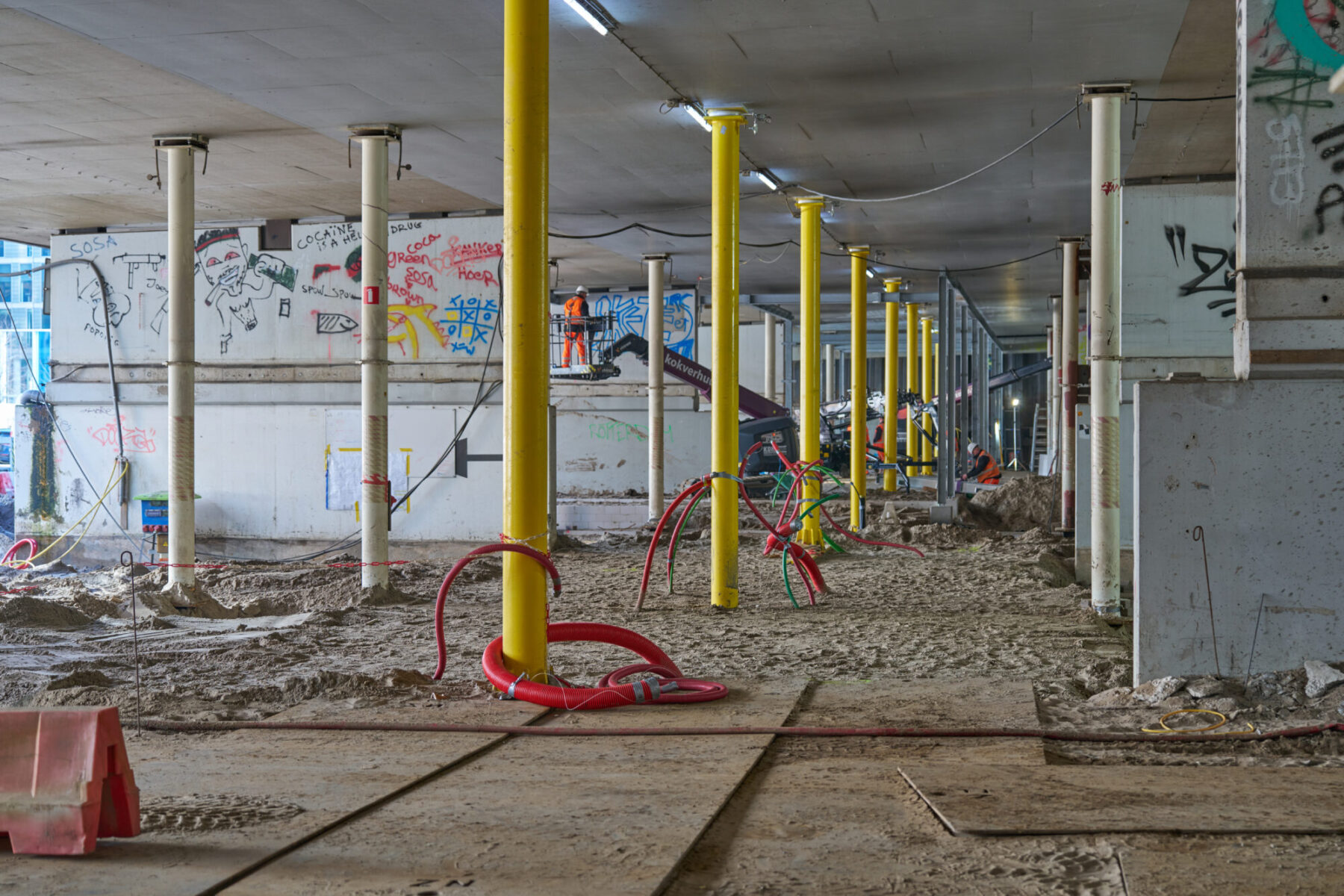 Eenmaal in de passage stuiten we op grote stellages, rondrijdend materieel en bedrijvige bouwvakkers. ‘Afgelopen september was het betonwerk bij de treinsporen aan de andere kant van de passage al gereed,’ begint Koning,’ maar aan deze kant onder de metrosporen waren we nog op kruipruimteniveau. Inmiddels zijn de vloeren gestort en gevlinderd, en daar’, Koning knikt naar de flanken van de passage, ‘daar zijn we de puien van de winkels aan het voorbereiden. De glazen schuifdeuren zetten we er later in.’