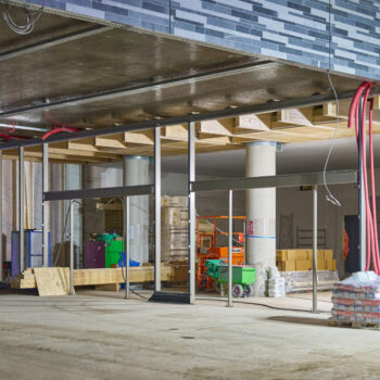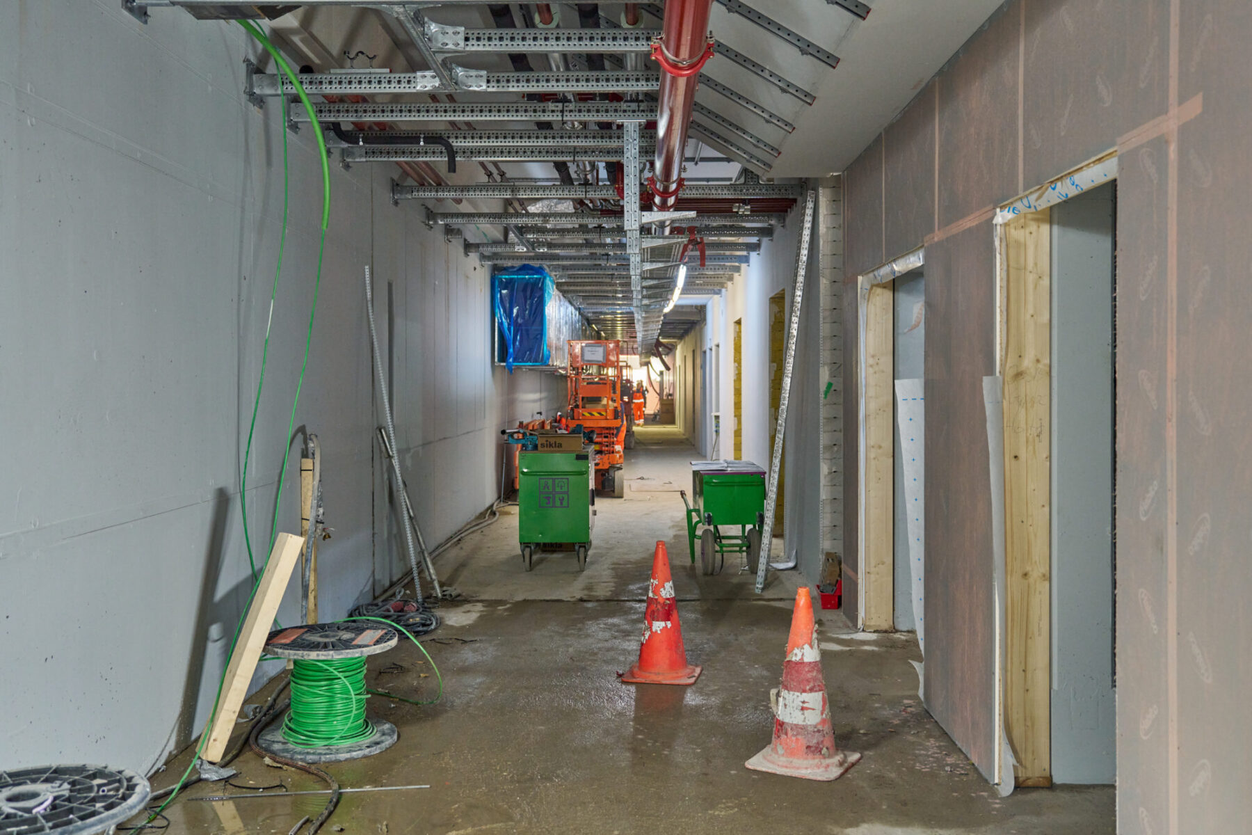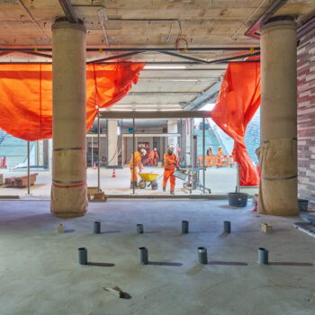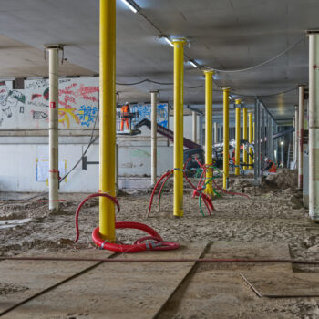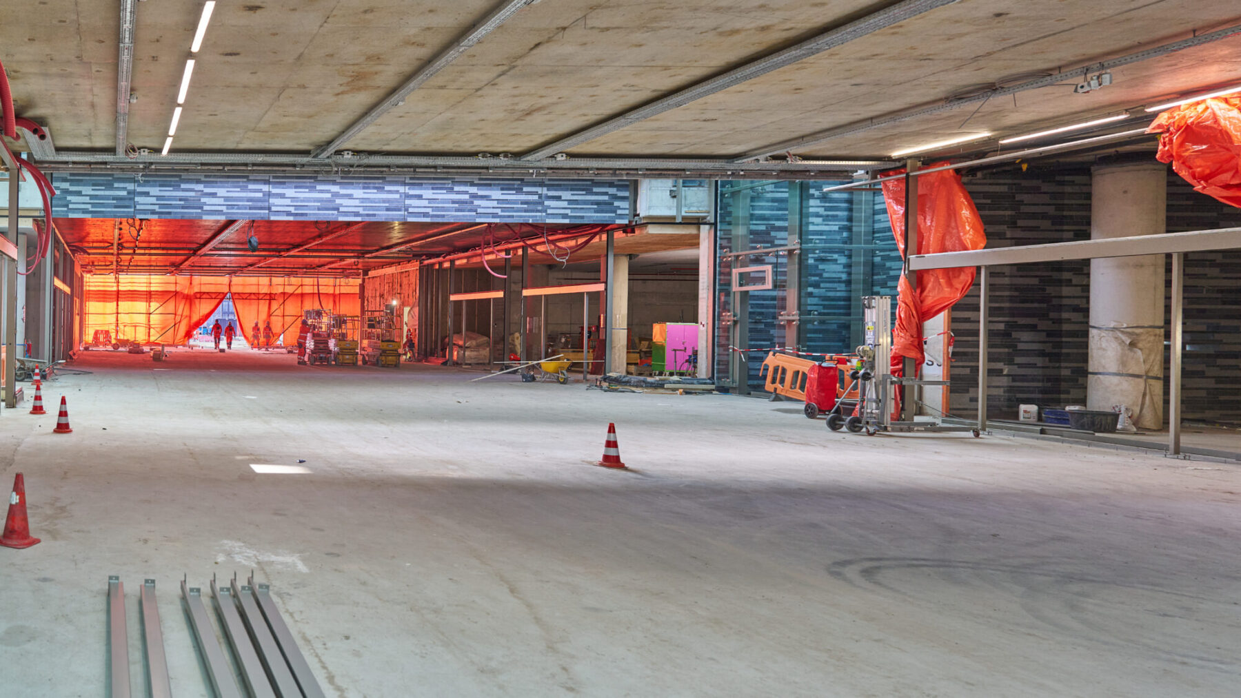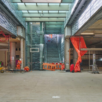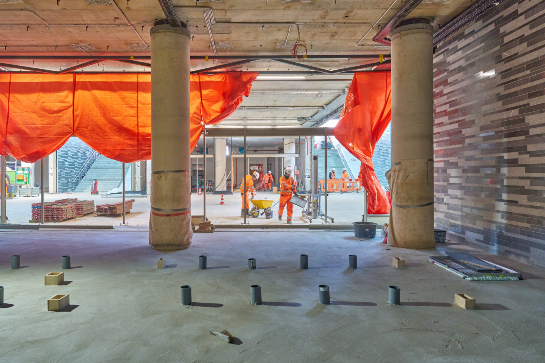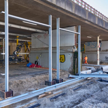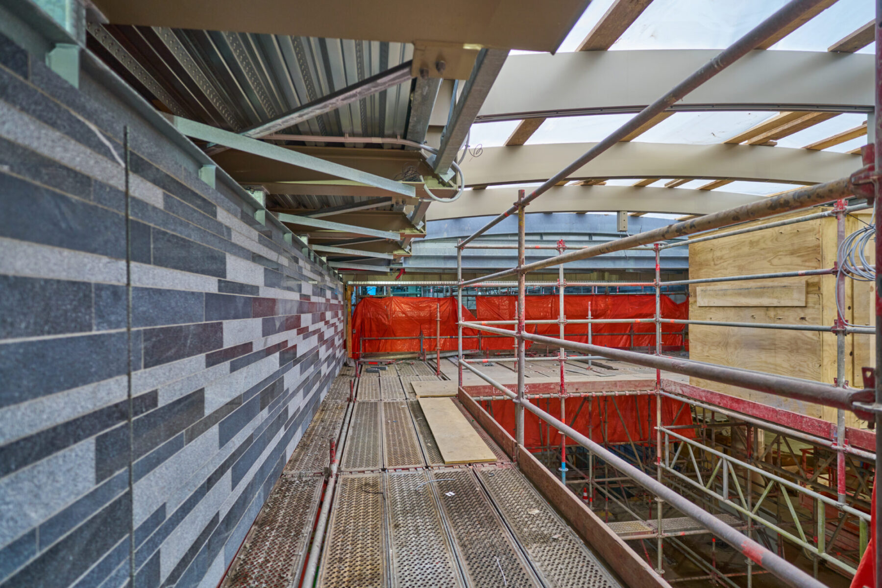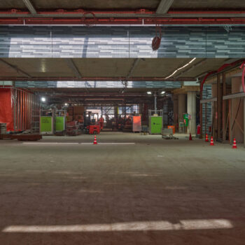 Eenmaal in de passage stuiten we op grote stellages, rondrijdend materieel en bedrijvige bouwvakkers. ‘Afgelopen september was het betonwerk bij de treinsporen aan de andere kant van de passage al gereed,’ begint Koning,’ maar aan deze kant onder de metrosporen waren we nog op kruipruimteniveau. Inmiddels zijn de vloeren gestort en gevlinderd, en daar’, Koning knikt naar de flanken van de passage, ‘daar zijn we de puien van de winkels aan het voorbereiden. De glazen schuifdeuren zetten we er later in.’