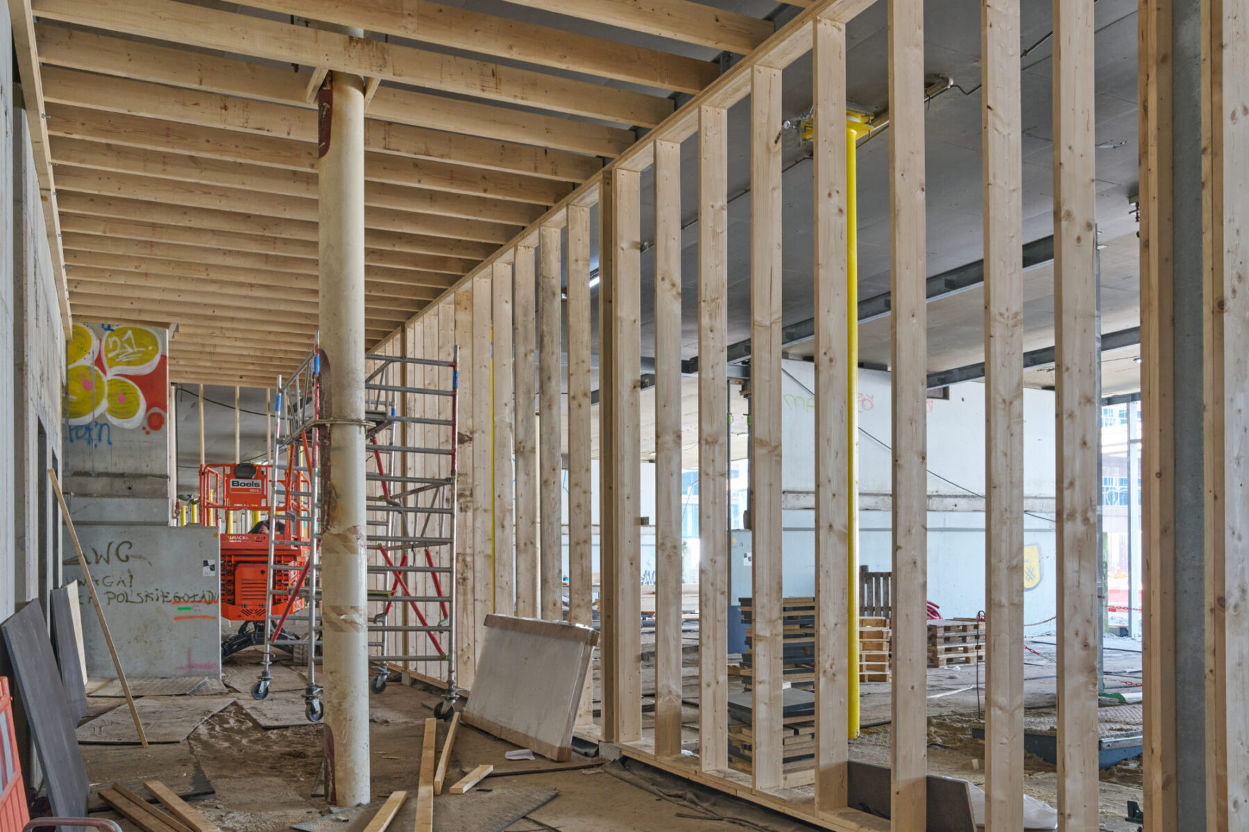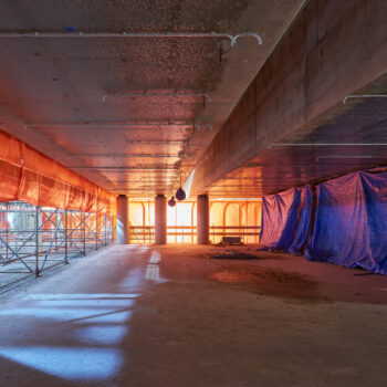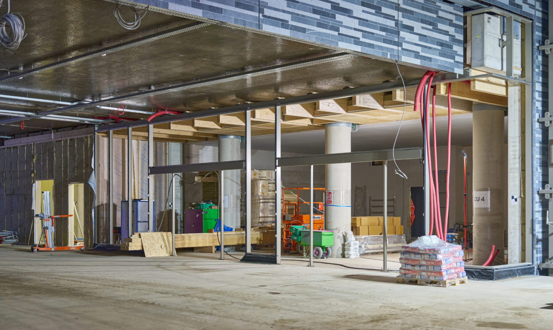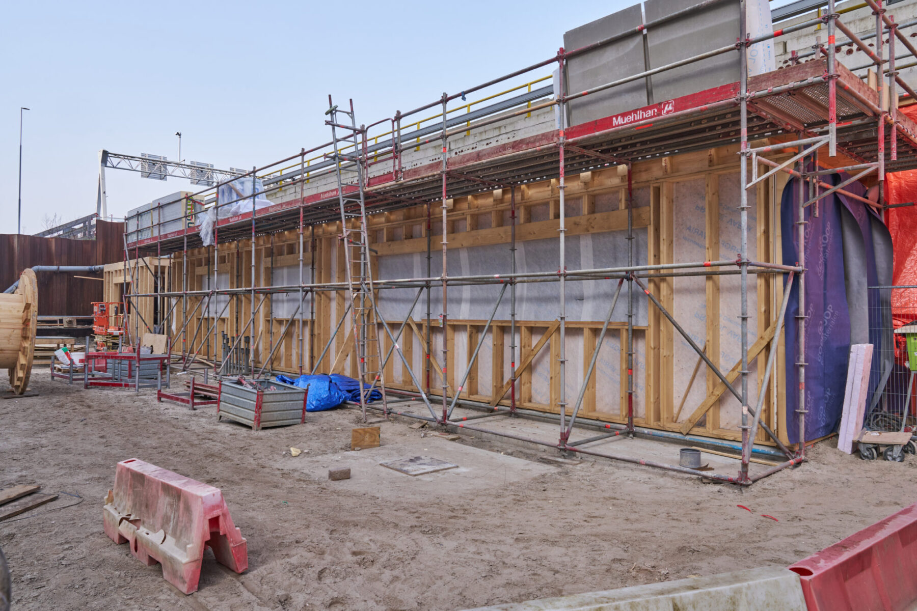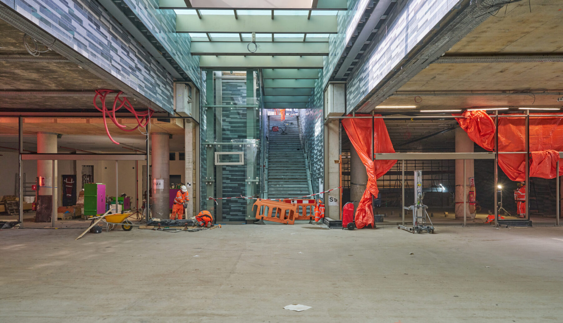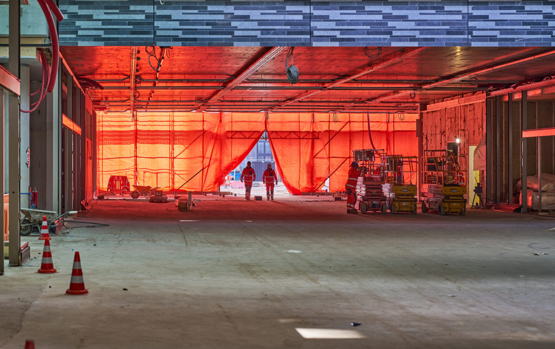 Eenmaal in de passage stuiten we op grote stellages, rondrijdend materieel en bedrijvige bouwvakkers. ‘Afgelopen september was het betonwerk bij de treinsporen aan de andere kant van de passage al gereed,’ begint Koning,’ maar aan deze kant onder de metrosporen waren we nog op kruipruimteniveau. Inmiddels zijn de vloeren gestort en gevlinderd, en daar’, Koning knikt naar de flanken van de passage, ‘daar zijn we de puien van de winkels aan het voorbereiden. De glazen schuifdeuren zetten we er later in.’