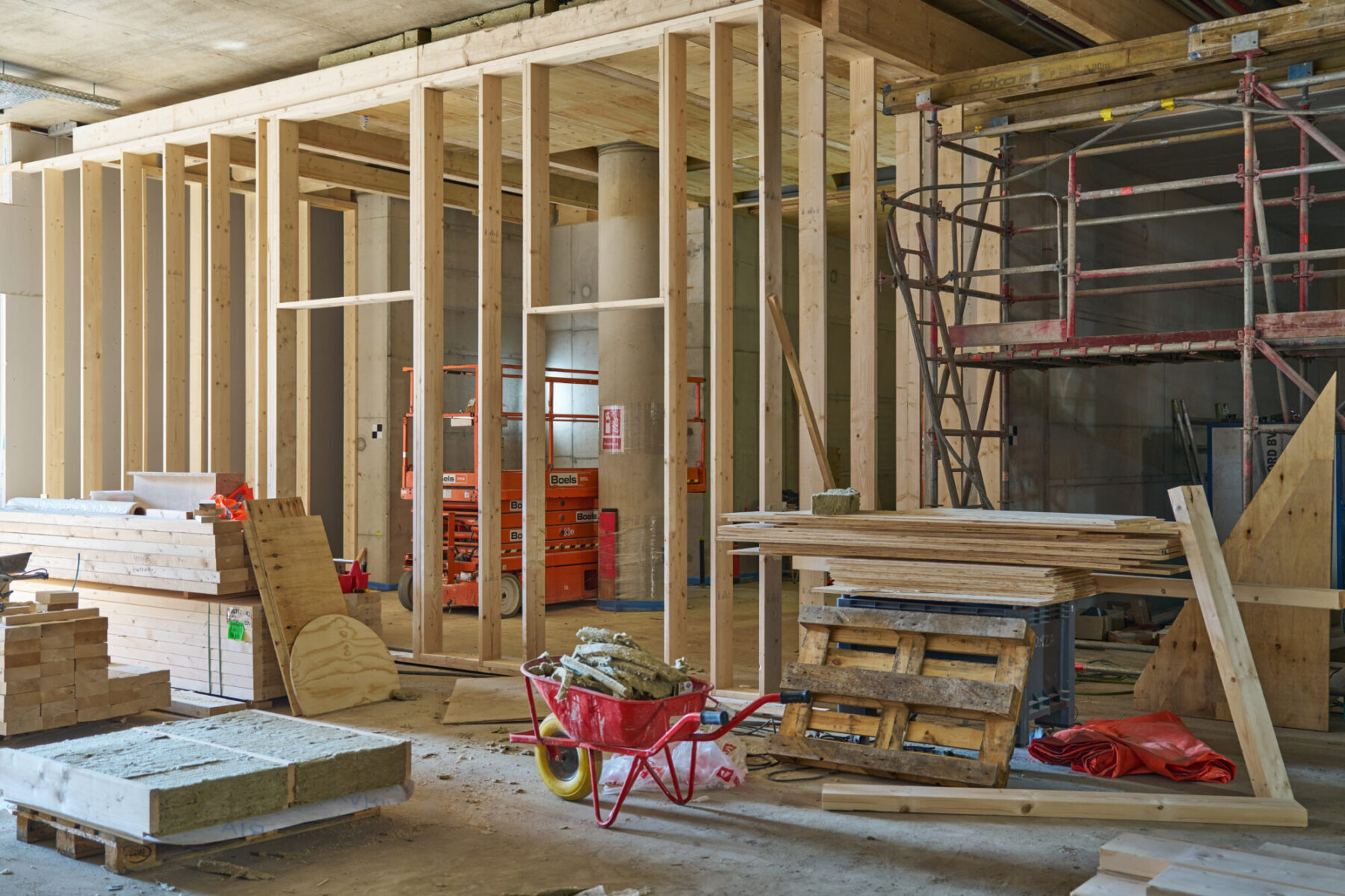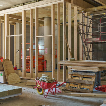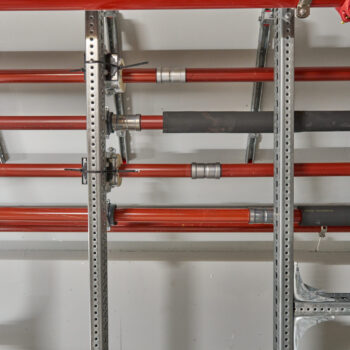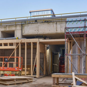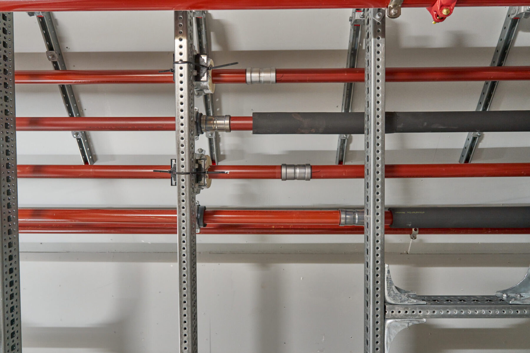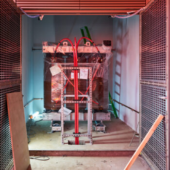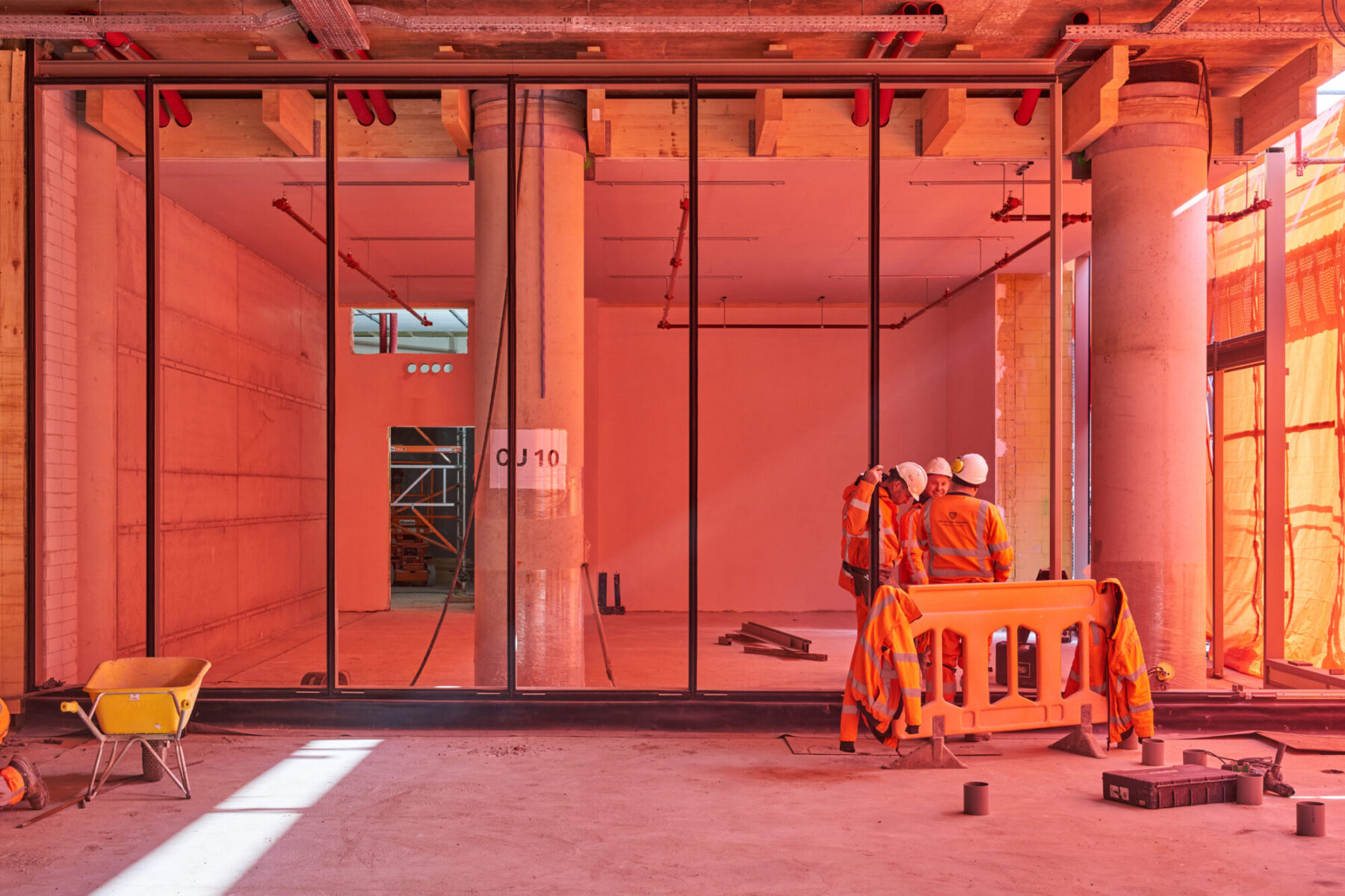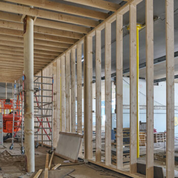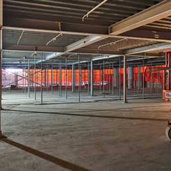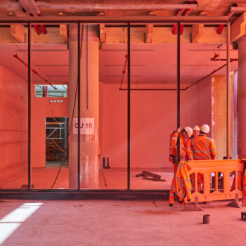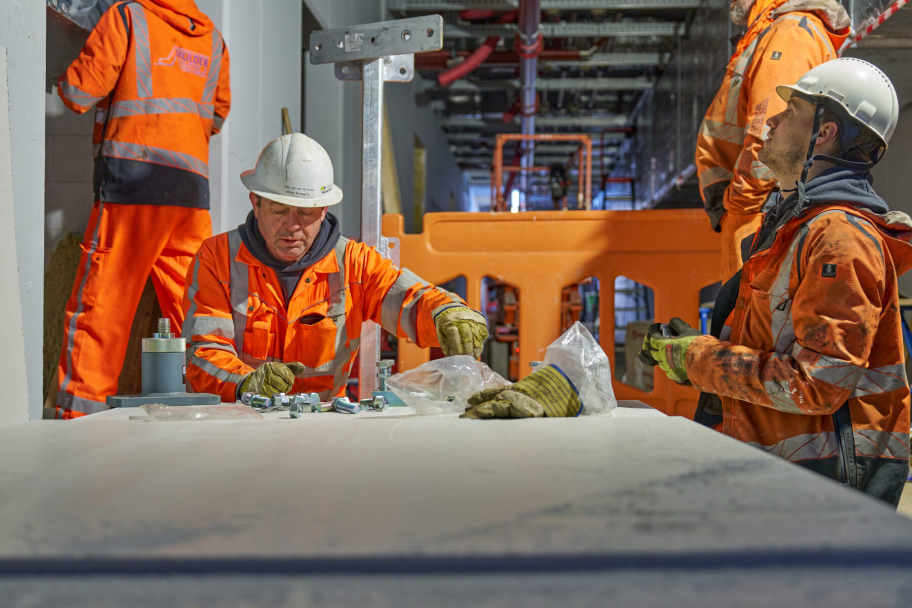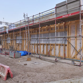 Eenmaal in de passage stuiten we op grote stellages, rondrijdend materieel en bedrijvige bouwvakkers. ‘Afgelopen september was het betonwerk bij de treinsporen aan de andere kant van de passage al gereed,’ begint Koning,’ maar aan deze kant onder de metrosporen waren we nog op kruipruimteniveau. Inmiddels zijn de vloeren gestort en gevlinderd, en daar’, Koning knikt naar de flanken van de passage, ‘daar zijn we de puien van de winkels aan het voorbereiden. De glazen schuifdeuren zetten we er later in.’