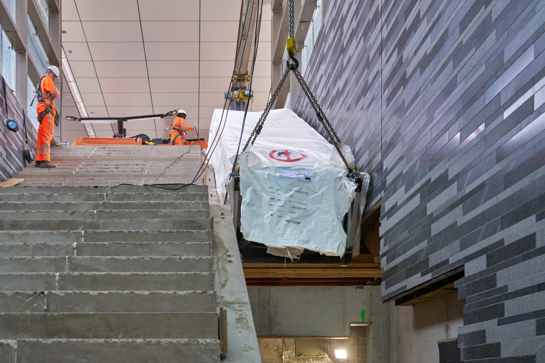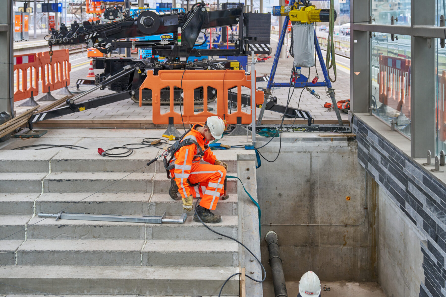 Voor fietsers hebben we goed nieuws: in de Brittenpassage komt een enorme fietsenstalling voor 2.000 fietsen, met rechtstreekse toegang tot zowel de Eduard van Beinumstraat/Parnassusweg als de passage. Daarnaast keren de roltrappen terug (zie kader). In het laatste weekend van februari hesen we bij de treinperrons al twee nieuwe roltrappen op hun plek – de roltrappen bij de metroperrons volgen begin april. Best een bijzondere klus: iedere roltrap werd horizontaal de passage in gereden, om vervolgens in twee afzonderlijke delen vanaf het perron erboven op hun plek gemanoeuvreerd te worden. Met een soort klik-schuif systeem schoven we de delen tot slot weer probleemloos aan elkaar.