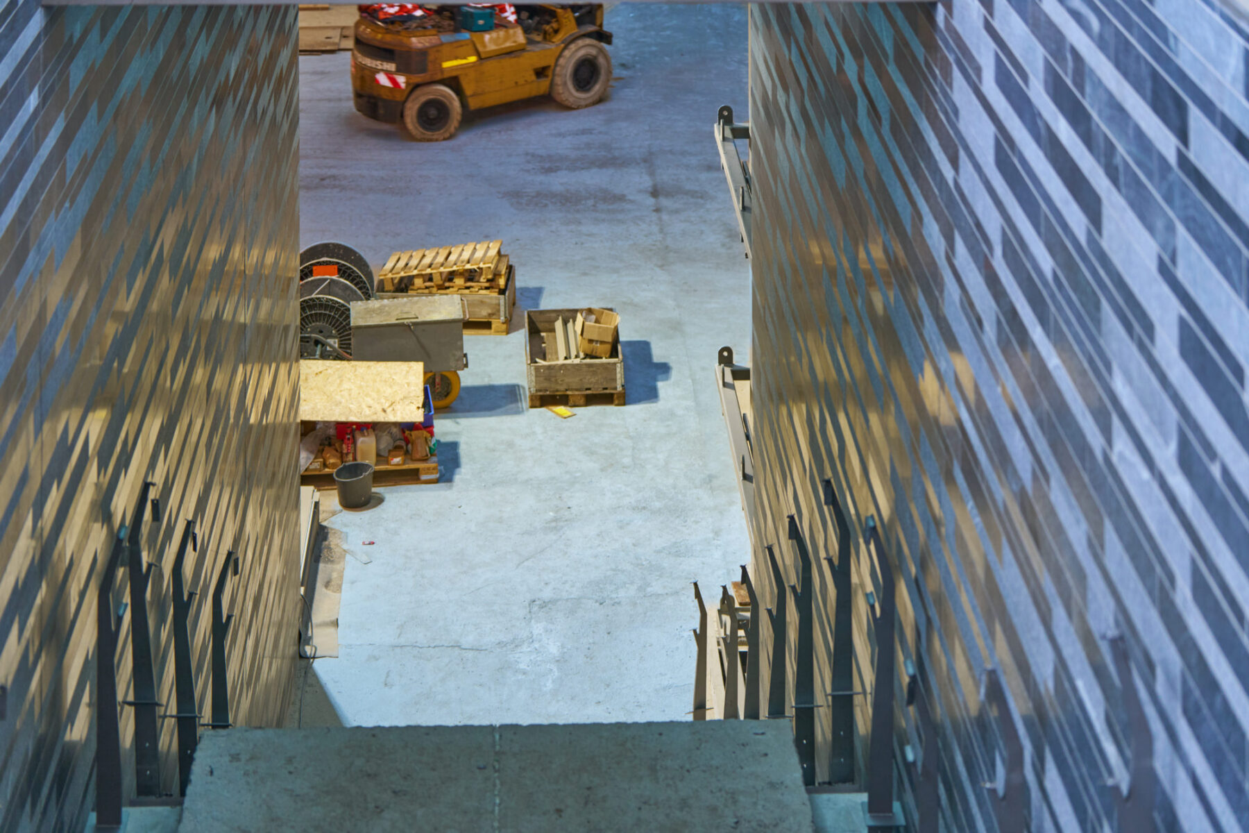 Koning en zijn collega Amine Talhaoui, student bouwkunde en stagiair, leiden ons vanaf de Eduard van Beinumstraat aan de noordzijde de passage in. Door de voormalige parkeergarage van het Atrium heen, zo vertelt Koning ons: ‘De garage was een van de eerste bouwwerken in het stationsgebied. We bouwen hem nu om tot tijdelijke entree voor de Brittenpassage, met aan weerszijden ruimte voor opslag, technische ruimtes en een ruimte voor personeel.’ Tijdelijke entree? Koning tikt met zijn schoen op de grond: ‘Totdat de A10 Zuid hieronder in een tunnel ligt, dan pas kan de definitieve entree gebouwd worden. Op de plek van de oude garage komen dan onder andere winkelruimtes, helemaal tot aan de Minervapassage zo’n tweehonderd meter verderop.’
