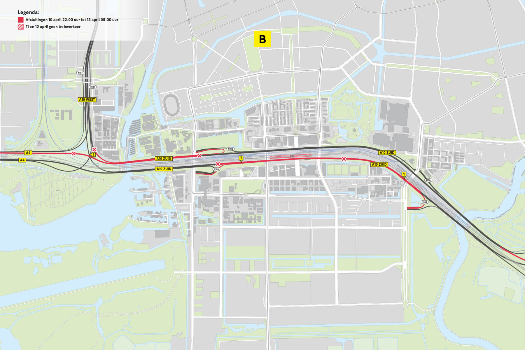 • Verbinding A2 naar A10 Zuid richting Schiphol tot S108 Amsterdam/Oud Zuid