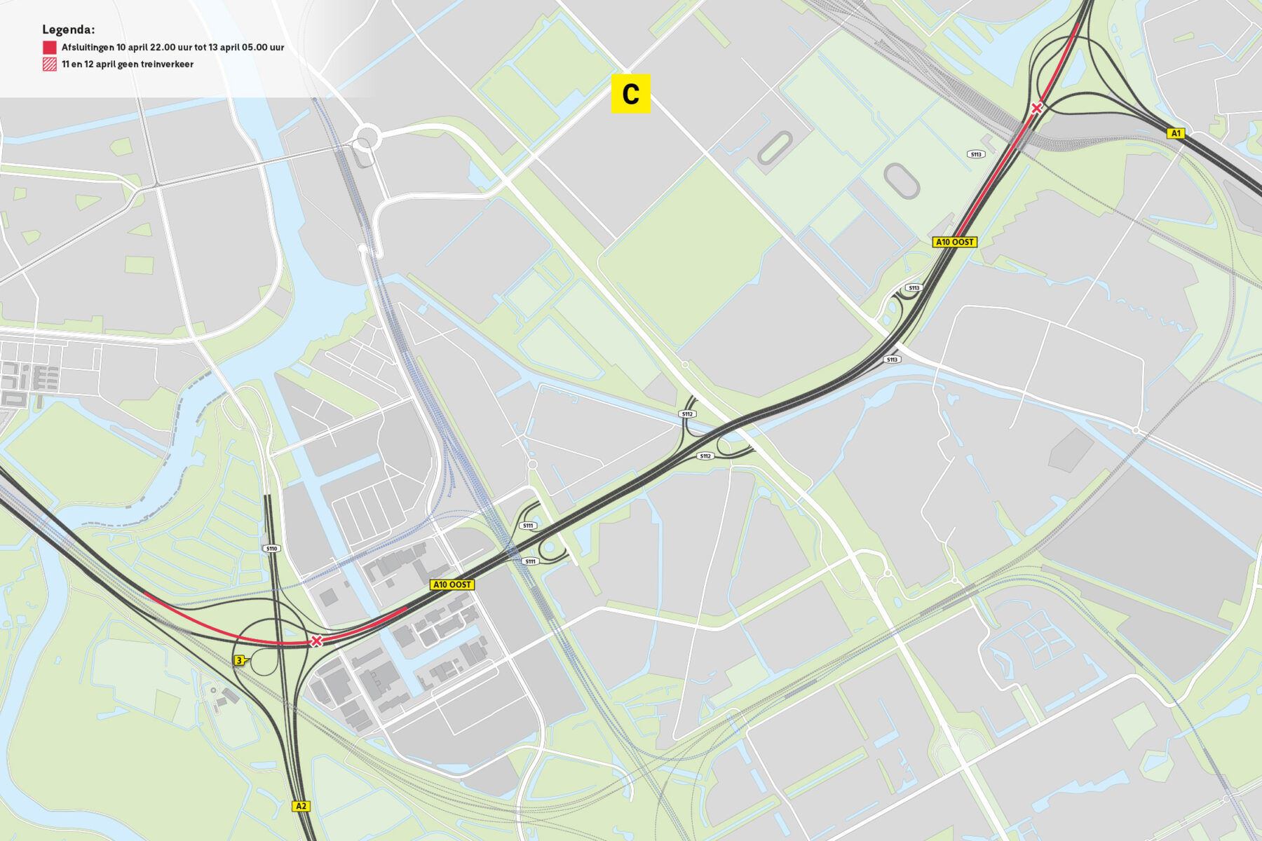 • Oprit S109 Amsterdam/Rivierenbuurt richting A2 Utrecht en A10 Oost/Zaanstad, overdag