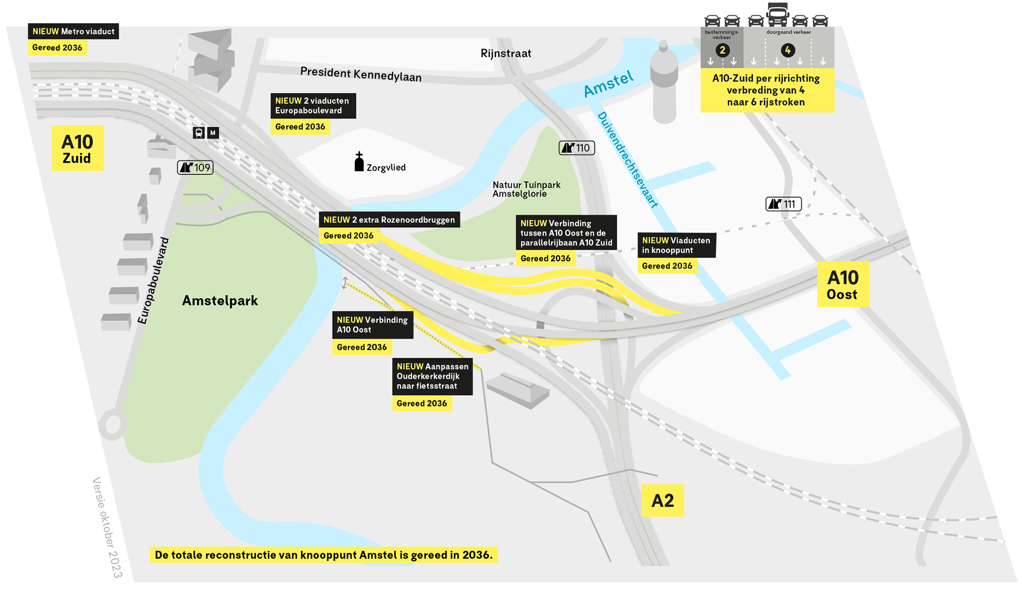 De A10 Zuid, tussen de knooppunten Amstel en De Nieuwe Meer, gaat van vier naar zes per rijrichting: vier voor doorgaand verkeer en twee voor bestemmingsverkeer. Om dit mogelijk te maken (ver)bouwen we in en rond knooppunt Amstel onder andere drieëntwintig viaducten, leggen we nieuwe verbindingsbogen aan, bouwen we nieuwe bruggen over de Amstel en vervangen we de zuidelijke Rozenoordbrug. In het knooppunt verdwijnt het kleine klaverblad. Verkeer vanaf de Rijnstraat (S110)/Utrechtsebrug kan dan niet meer rechtstreeks naar de A10-Oost. Dat kan dan via de S109 of S111.