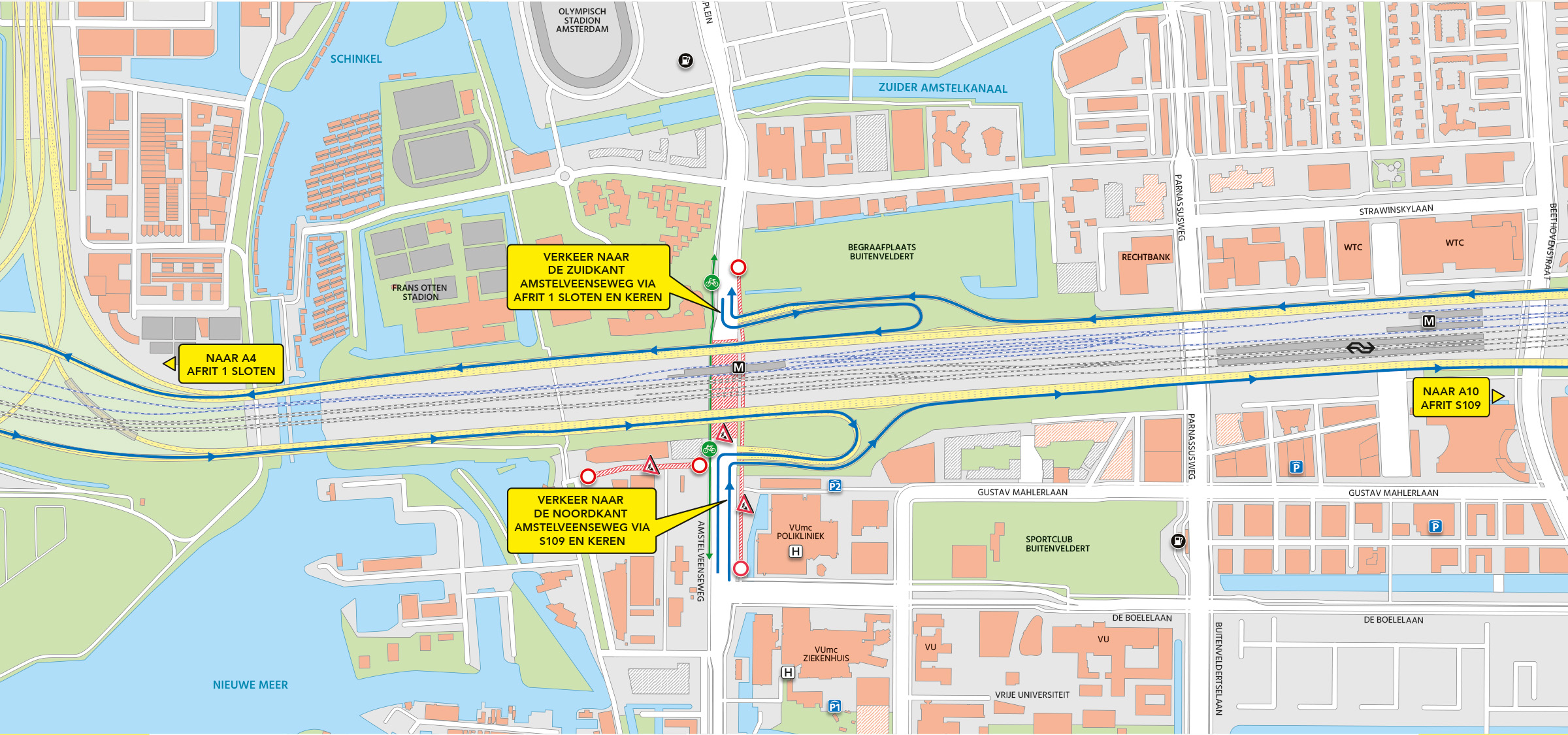 - S108 access roads and exits to Amsterdam Oud Zuid and Buitenveldert, except on Friday, 11 July and Saturday, 12 July.