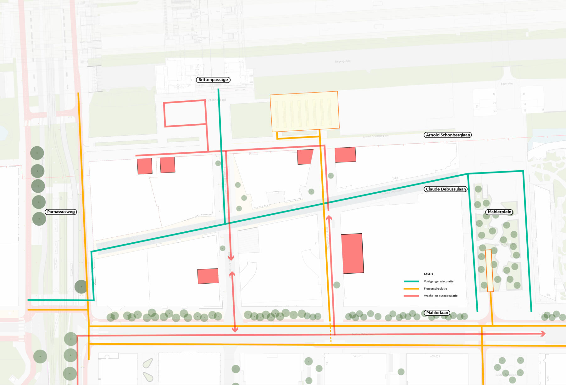 Phase 2 is the period when the traffic tunnel is being built. The Brittenpassage (south side) and Arnold Schönberglaan will then both be closed. The above-ground bicycle parking facility in Arnold Schönberglaan will no longer be available. The Minervapassage will then be open again. Phase 3 is the permanent situation. The Minervapassage will then again be the main entrance to the station and serve as a pedestrian link between the north and south side of the station. The Brittenpassage will then serve as a second passageway leading to the trains and metros, with a bicycle park next to it. Above the tunnel, the station forecourt will be given a new layout and there will be tram stops in Arnold Schönberglaan.