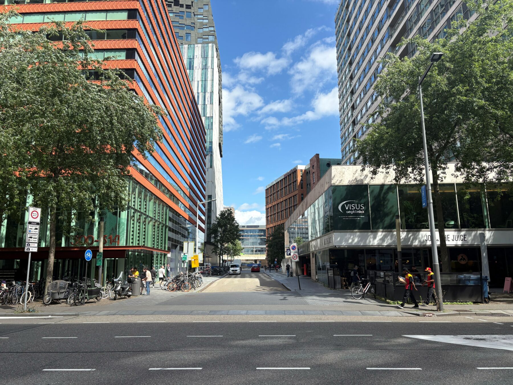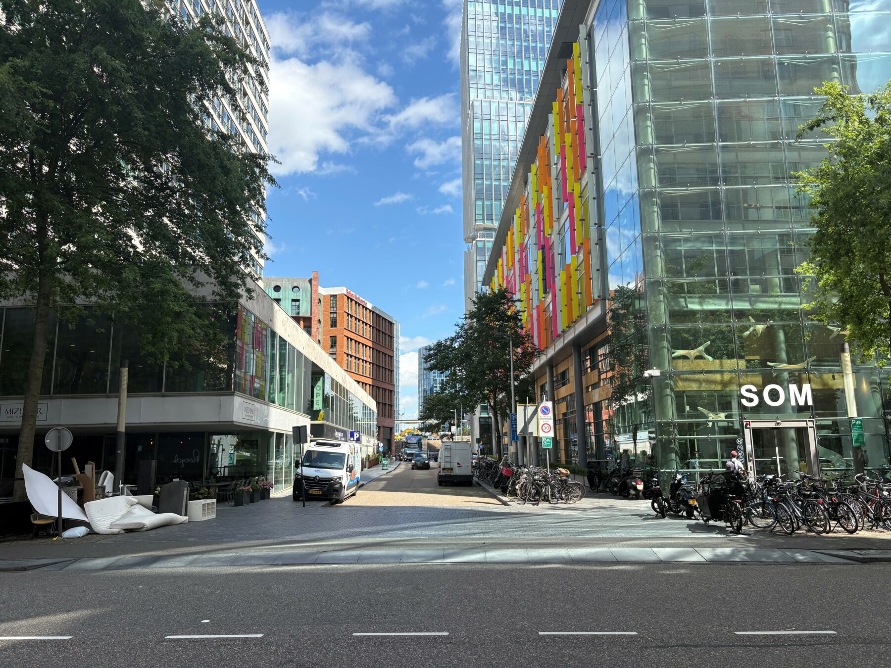 At the moment, Benjamin Brittenstraat and Aaron Coplandstraat are not the busiest streets in Zuidas. But when the additional passenger tunnel at Amsterdam Zuid station, the Brittenpassage, has been completed, they will be full of pedestrians and cyclists. Especially immediately after the opening of the new passageway, in 2027 at the latest. That will be when the existing station entrance, the Minervapassage, closes for major renovation works for several years. Very large numbers of railway and metro passengers will then be reliant on the Brittenpassage. Currently, around 80,000 people travel via Amsterdam Zuid station on a daily basis. Some of the pedestrians wishing to get from one side of the district to the other will also have to use the Brittenpassage while the Minervapassage remains closed. Alongside the Brittenpassage, next to Aaron Coplandstraat, there will also be a temporary above-ground bicycle park with room for 1,600 bikes. This will also lead to an increase in bike traffic. By then, the streets will be a hive of activity: freight traffic, cars going in and out of the underground Mahler car park, cyclists parking, people walking, cycling and visiting terrace cafés.