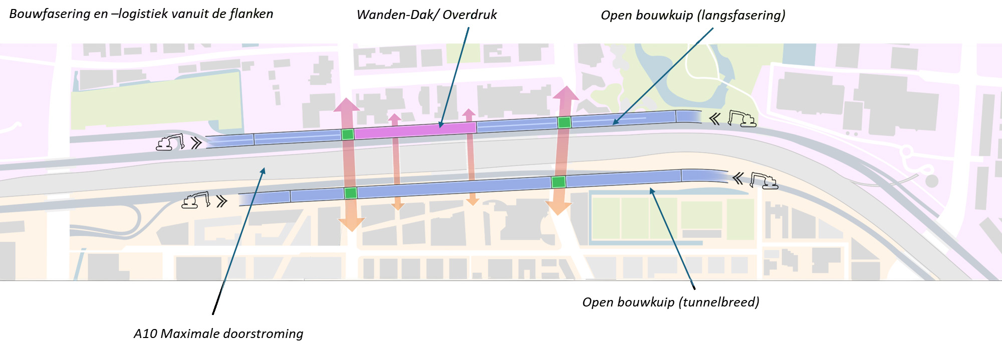 So, we are beginning work on the construction of the tube with lanes for local traffic. How do we plan to do that? As stated earlier, we are building the tunnel in sections of 25 to 30 m in length. This means we will not be building a single construction pit that is a kilometre long, but instead will be working in compartments (several sections bundled together), each of which will be tens of metres in length. In each compartment, we will then build the tunnel from the bottom up to the top, from floor to roof. The ‘open construction pit method’ is relatively simple and we are applying it on both sides of Amsterdam Zuid station. However, according to Schuitemaker, that is not the whole story when it comes to the narrow north side of the station.