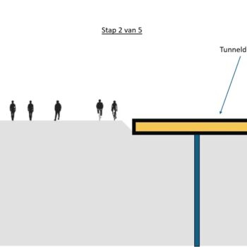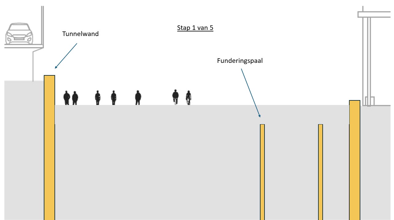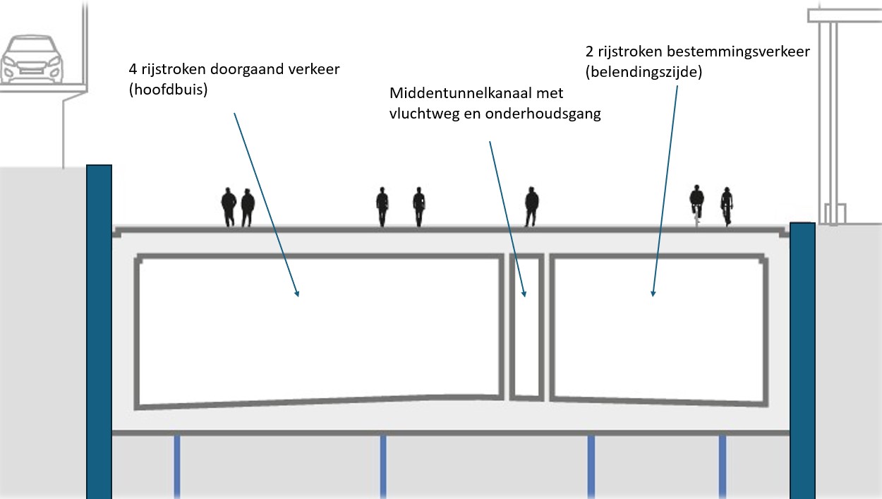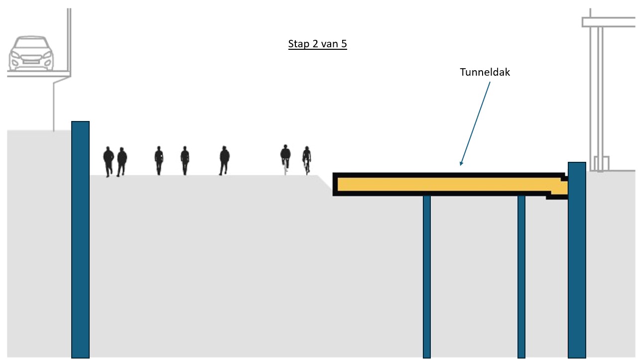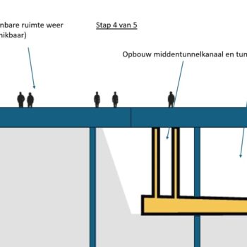 The reason why we are starting to build the tunnel on the side adjacent to the office buildings is because of the structure of the tunnel. It consists of a main tube with four lanes on the station side, a central tunnel channel with evacuation route and maintenance corridor and a narrower tube in which there will be two lanes for local traffic. In other words, several ‘tunnels within a tunnel’. We are starting construction on the central tunnel channel and the tube for local traffic on the side adjacent to the office buildings. This is because the central tunnel channel will also need to support the roof of the main tube with four lanes. This is why that main tube can only be built later.