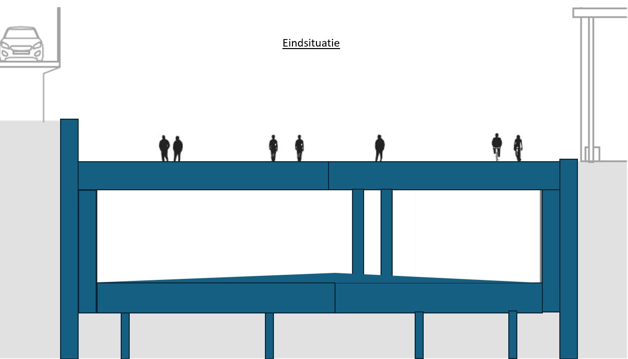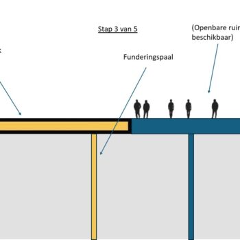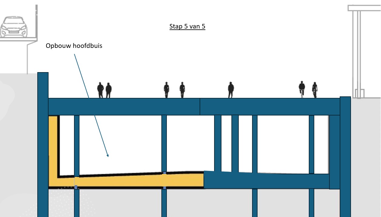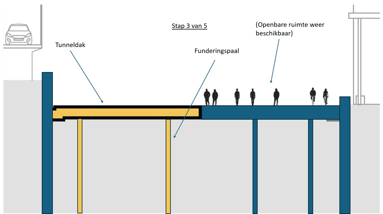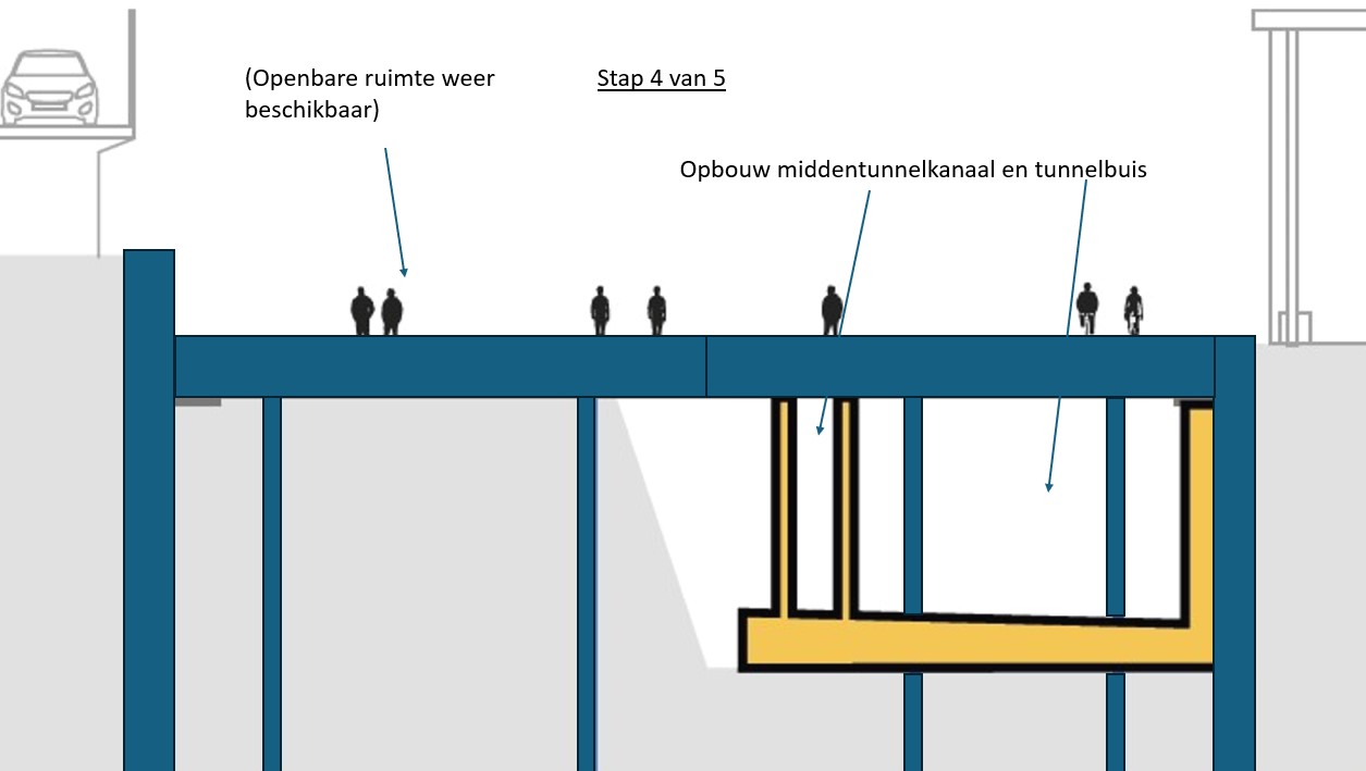 The reason why we are starting to build the tunnel on the side adjacent to the office buildings is because of the structure of the tunnel. It consists of a main tube with four lanes on the station side, a central tunnel channel with evacuation route and maintenance corridor and a narrower tube in which there will be two lanes for local traffic. In other words, several ‘tunnels within a tunnel’. We are starting construction on the central tunnel channel and the tube for local traffic on the side adjacent to the office buildings. This is because the central tunnel channel will also need to support the roof of the main tube with four lanes. This is why that main tube can only be built later.