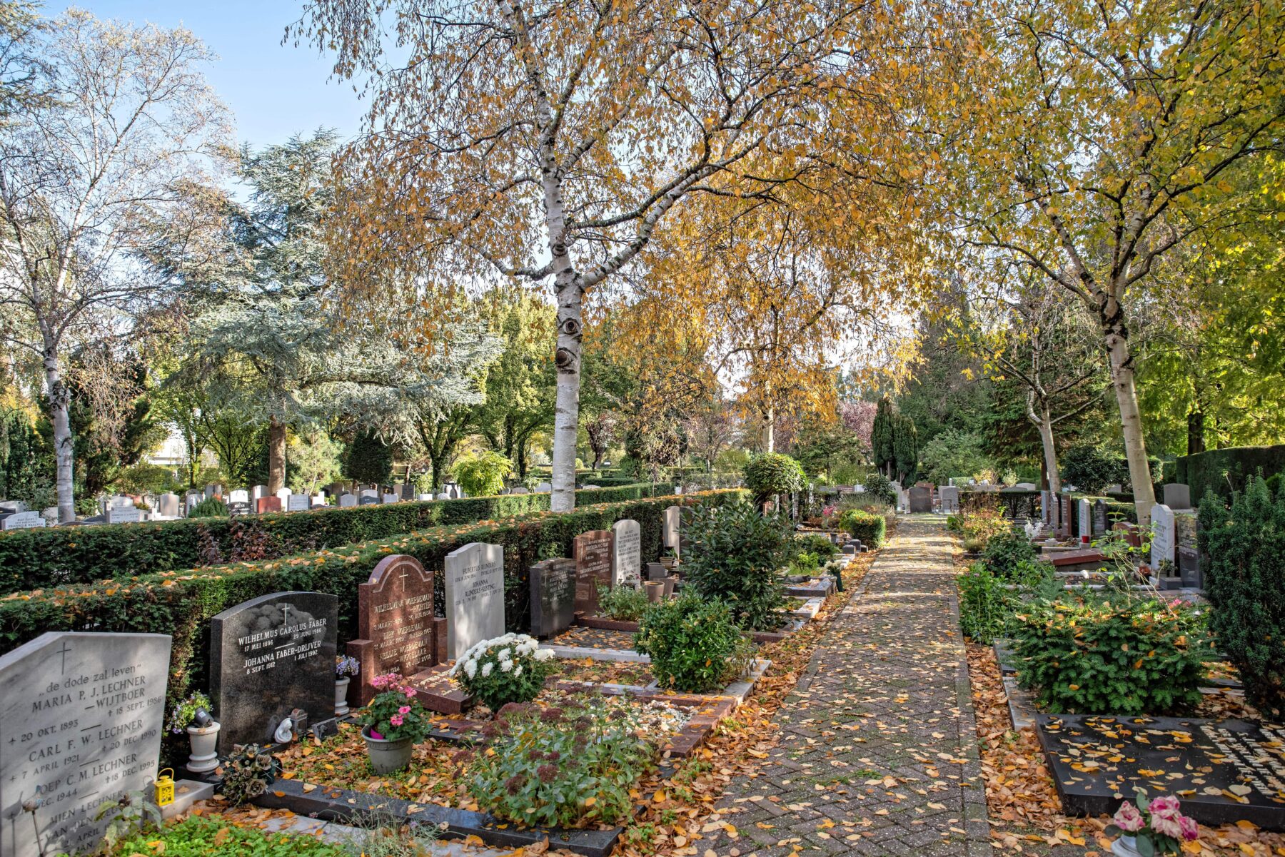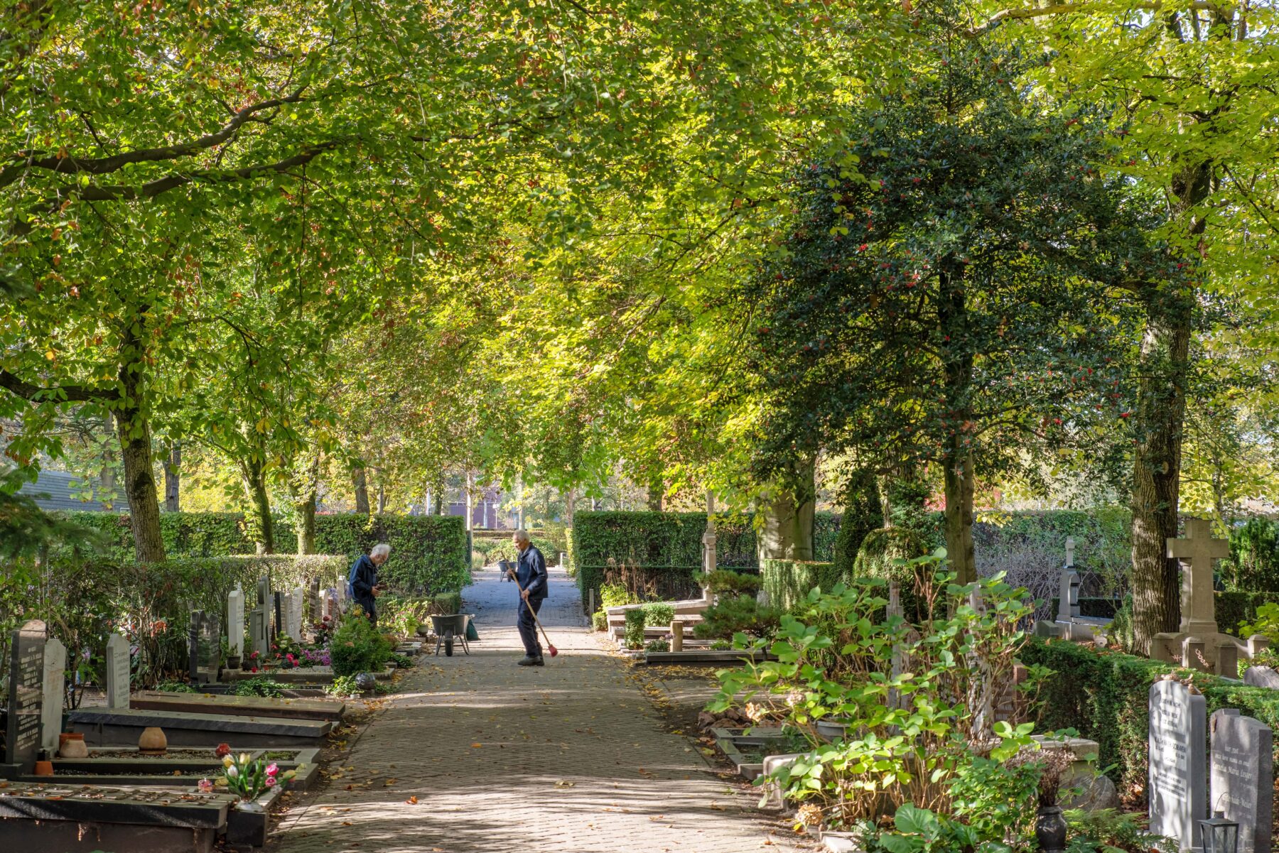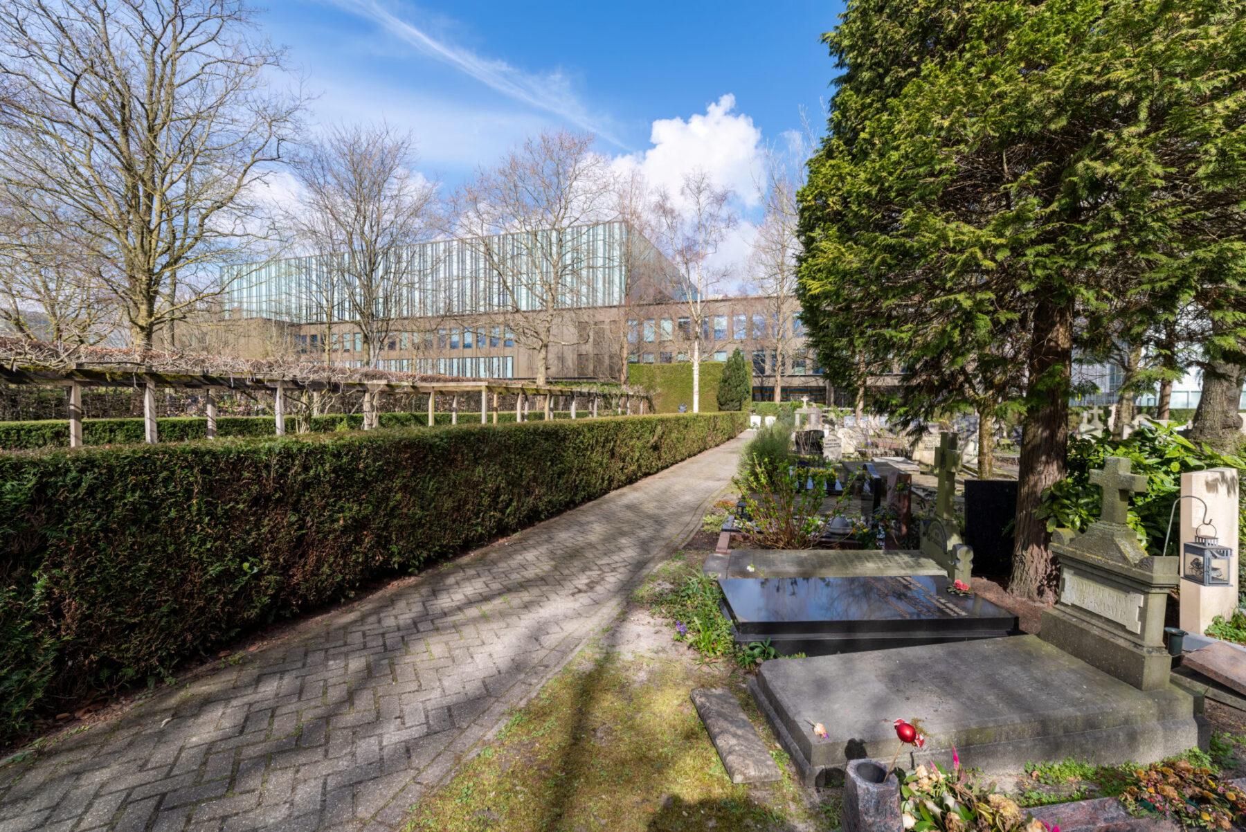 It is Monday morning and rush hour in Fred. Roeskestraat. Young people weave their way towards the Geert Groote College on their bikes, as parents head to the childcare centre with their kids in tow. Then, in the middle of this bustling routine, the entrance to Buitenveldert cemetery suddenly appears. The gate is open, and behind it, you can just make out a few beams of sunlight shining through the tall beech trees. You could easily fail to notice it and simply walk past. But we will not be doing that today.