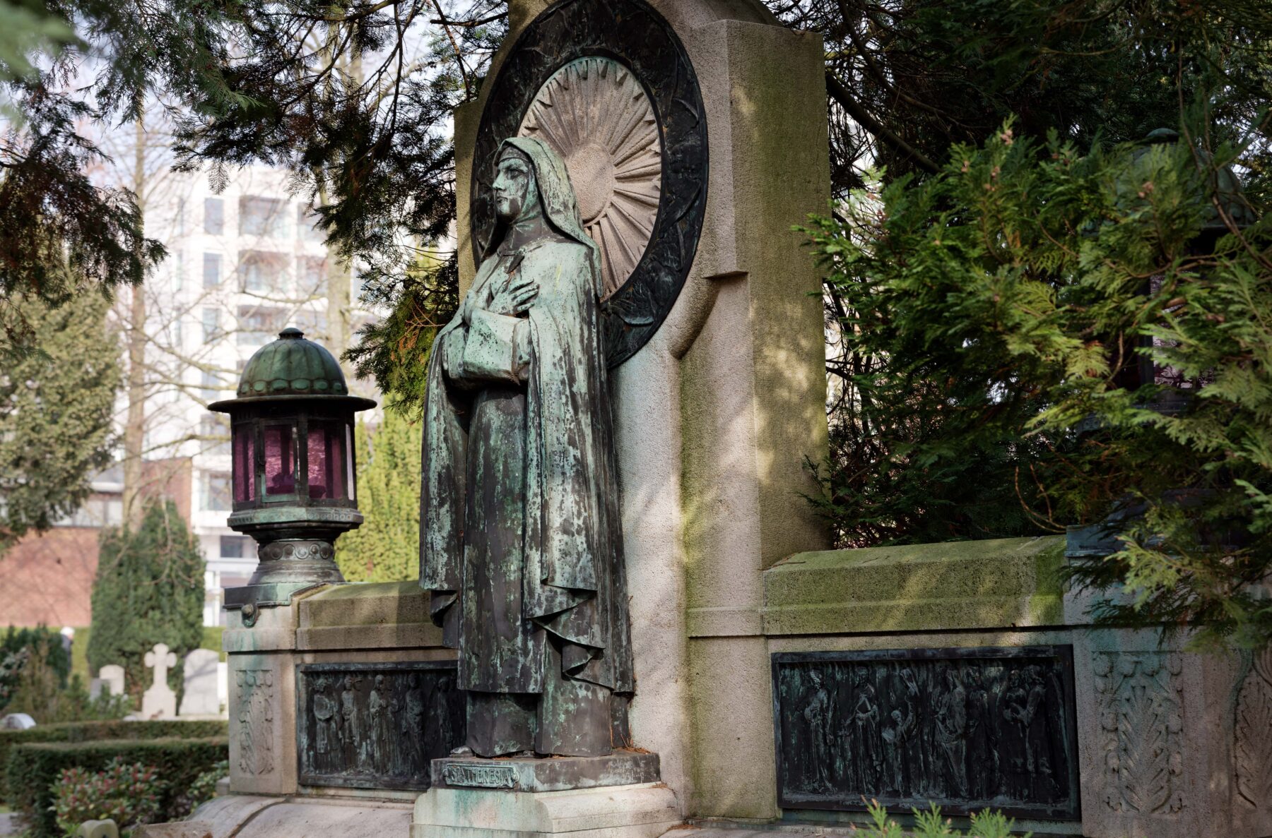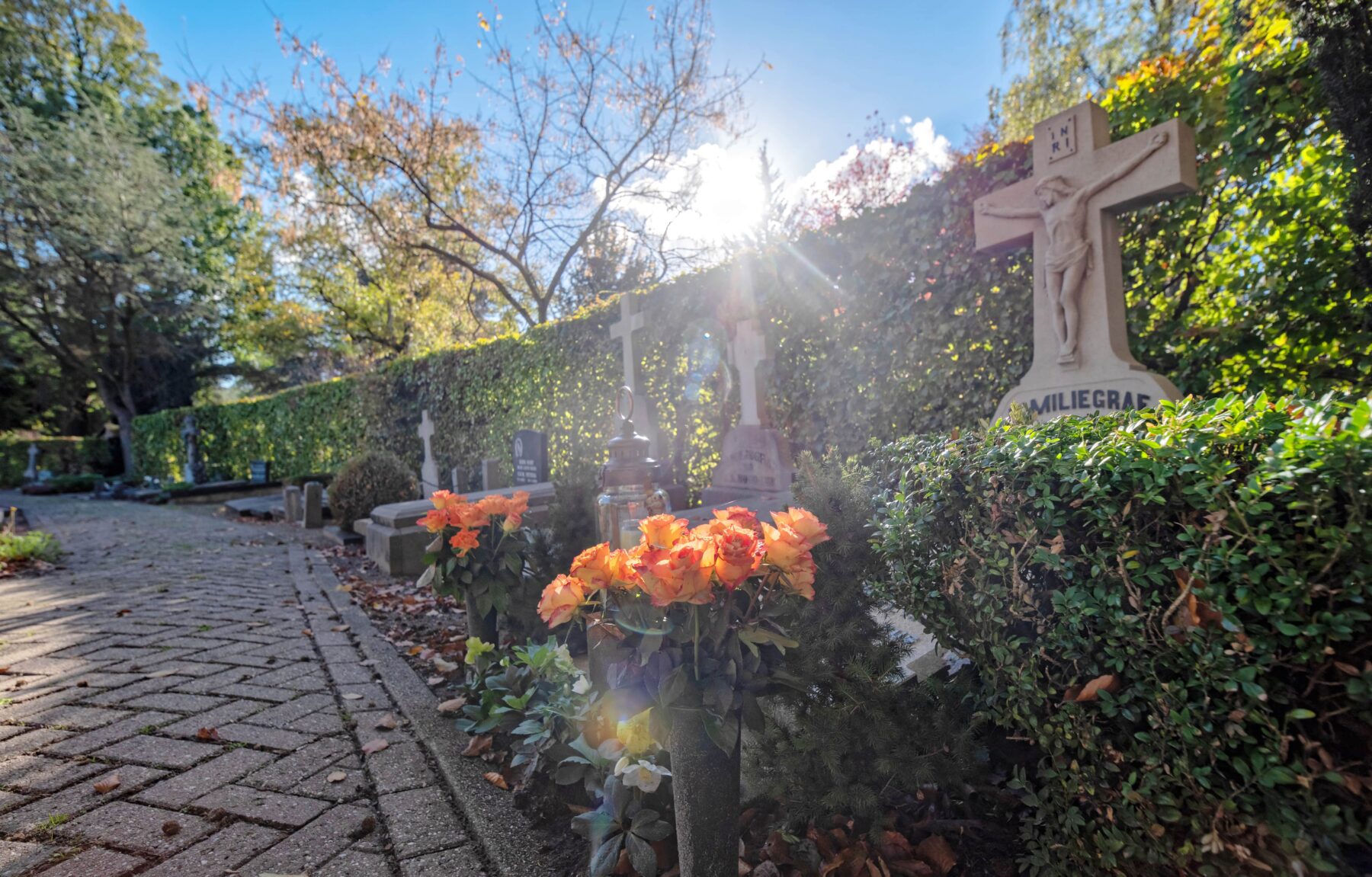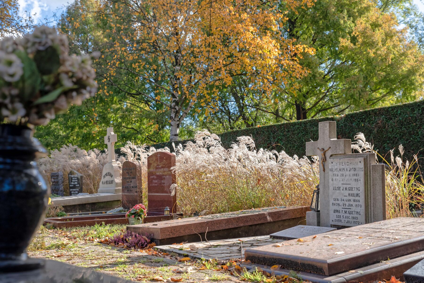 It is Monday morning and rush hour in Fred. Roeskestraat. Young people weave their way towards the Geert Groote College on their bikes, as parents head to the childcare centre with their kids in tow. Then, in the middle of this bustling routine, the entrance to Buitenveldert cemetery suddenly appears. The gate is open, and behind it, you can just make out a few beams of sunlight shining through the tall beech trees. You could easily fail to notice it and simply walk past. But we will not be doing that today.