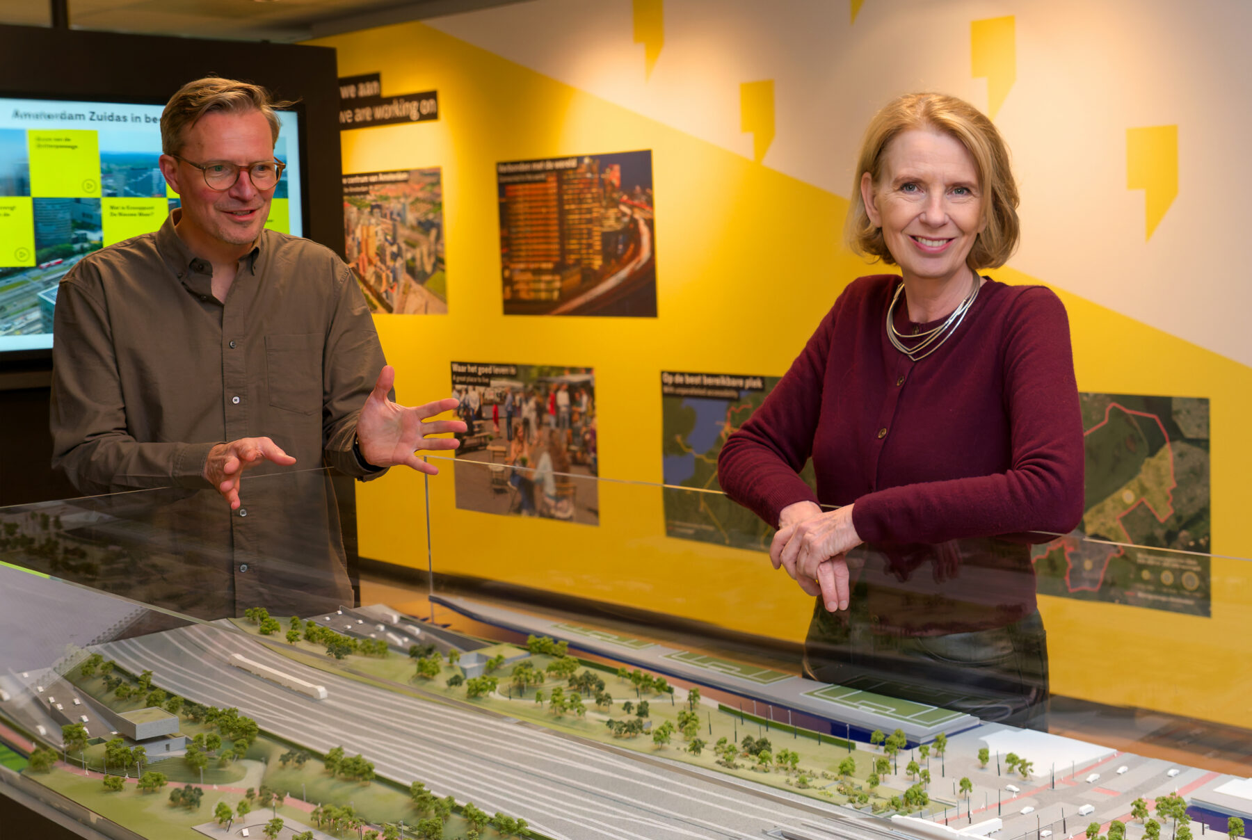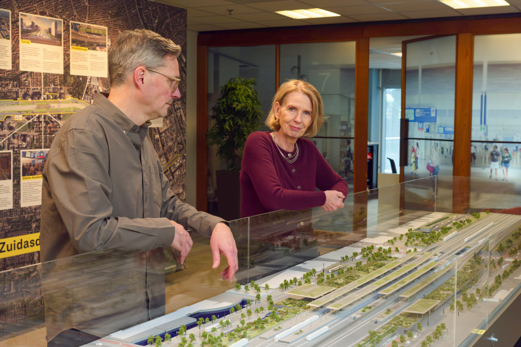 If you ask two architects about Amsterdam Zuid station, the conversation quickly turns to what makes this station unique. Stations tend to face toward the city and have bicycle parking, installations and loading and unloading areas at the rear. Amsterdam Zuid station is different: it has no front or rear. ‘In many cities, such as Rotterdam or Arnhem, the station building is a ‘grandiose gesture’, says Marianne Loof, who was Spoorbouwmeester and a member of the Quality Team until 1 January. Bureau Spoorbouwmeester is made up of a small team who provide ProRail and NS with independent advice on the design of the railway and stations in the Netherlands. Loof and her colleague Miguel Loos have been involved in the Zuidasdok project for a long time.